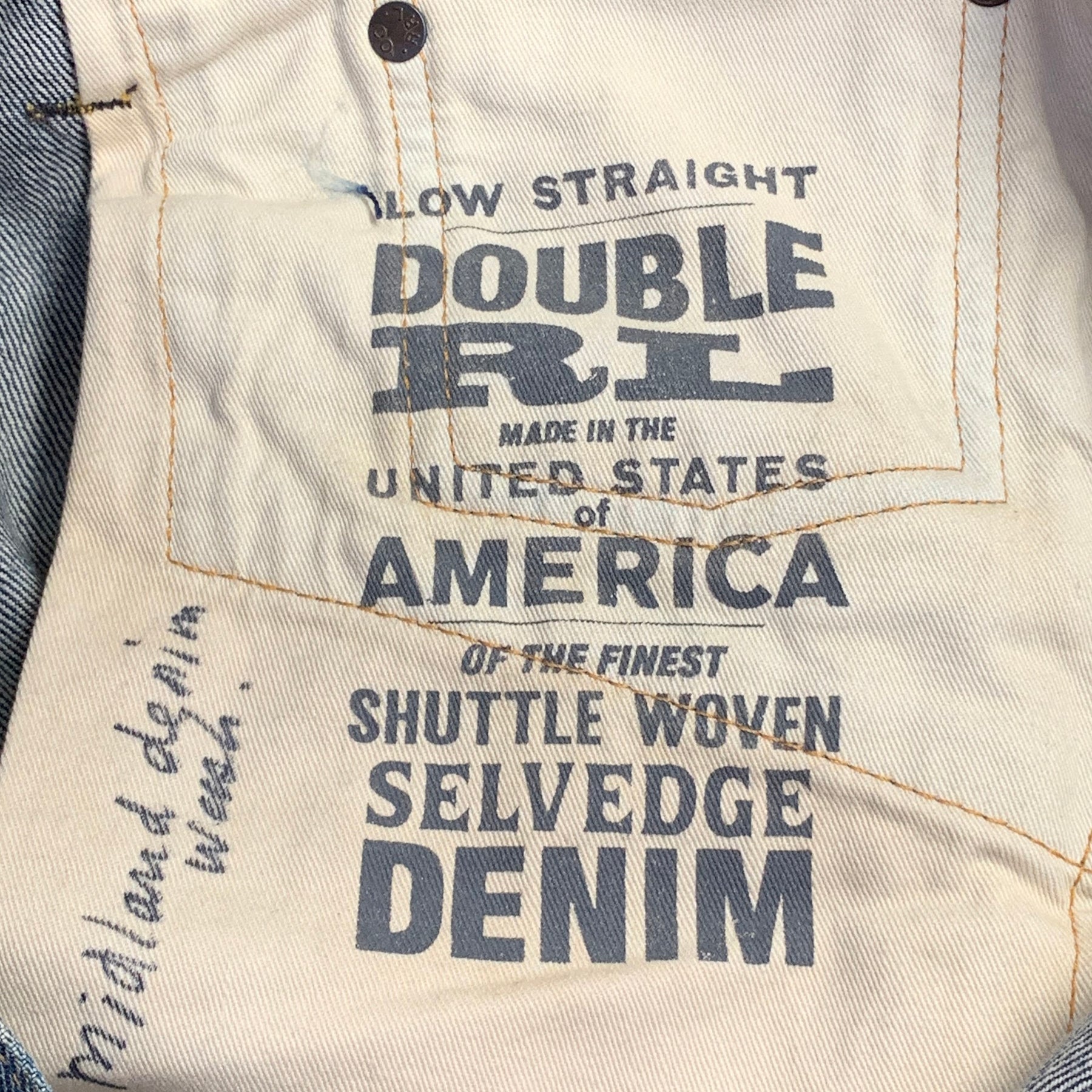 RRL by RALPH LAUREN jeans in a blue wash cotton selvedge denim twill featuring a distressed style, straight leg, and button fly closure. Made in USA.