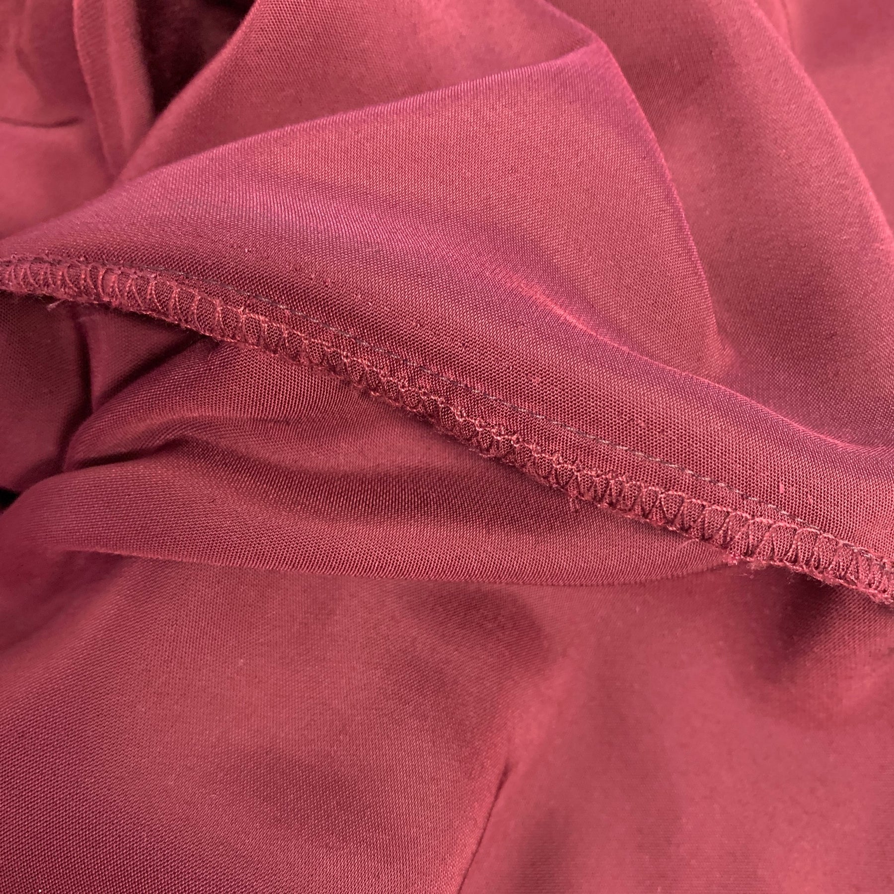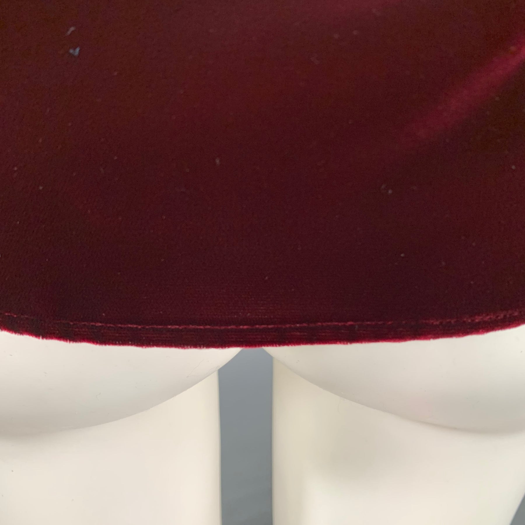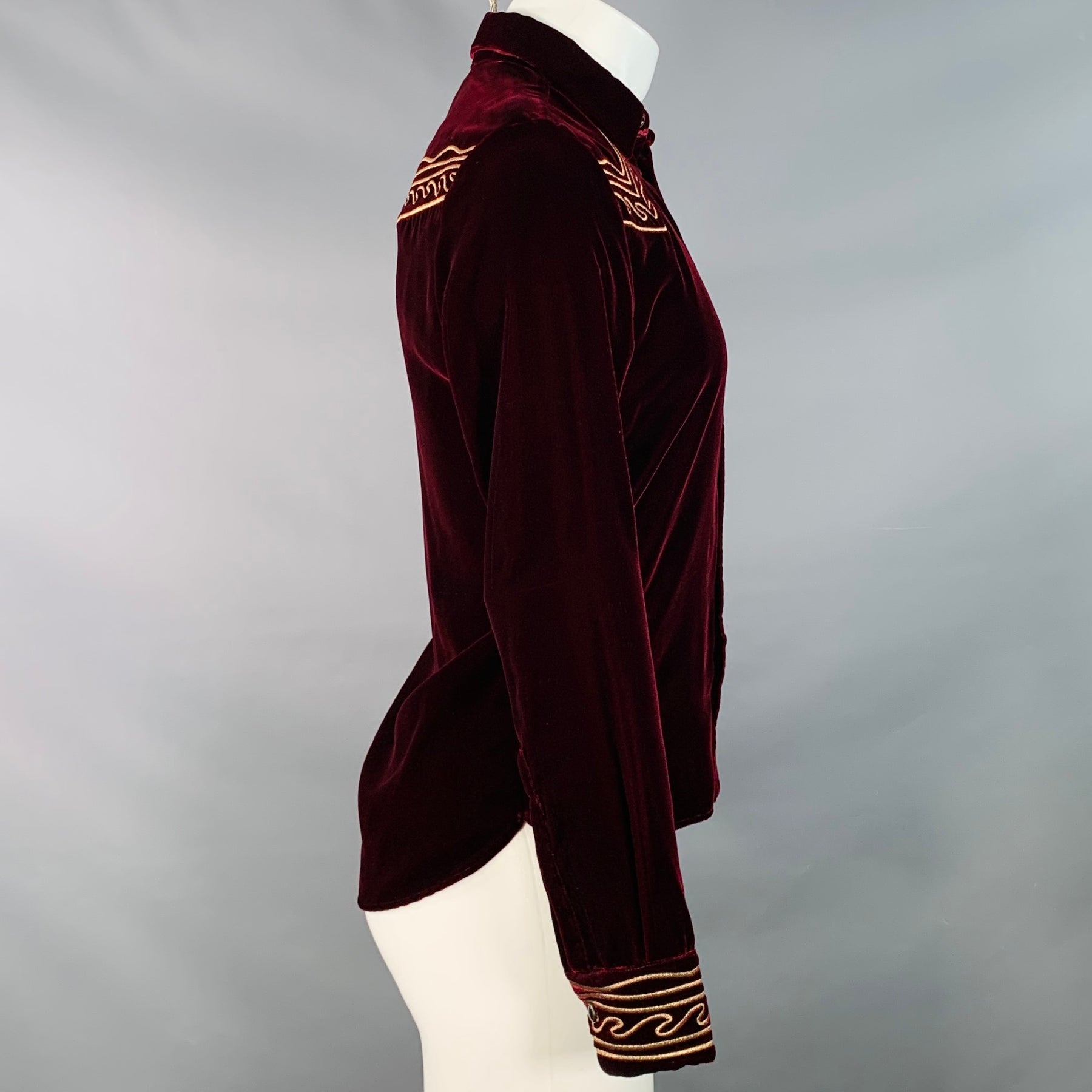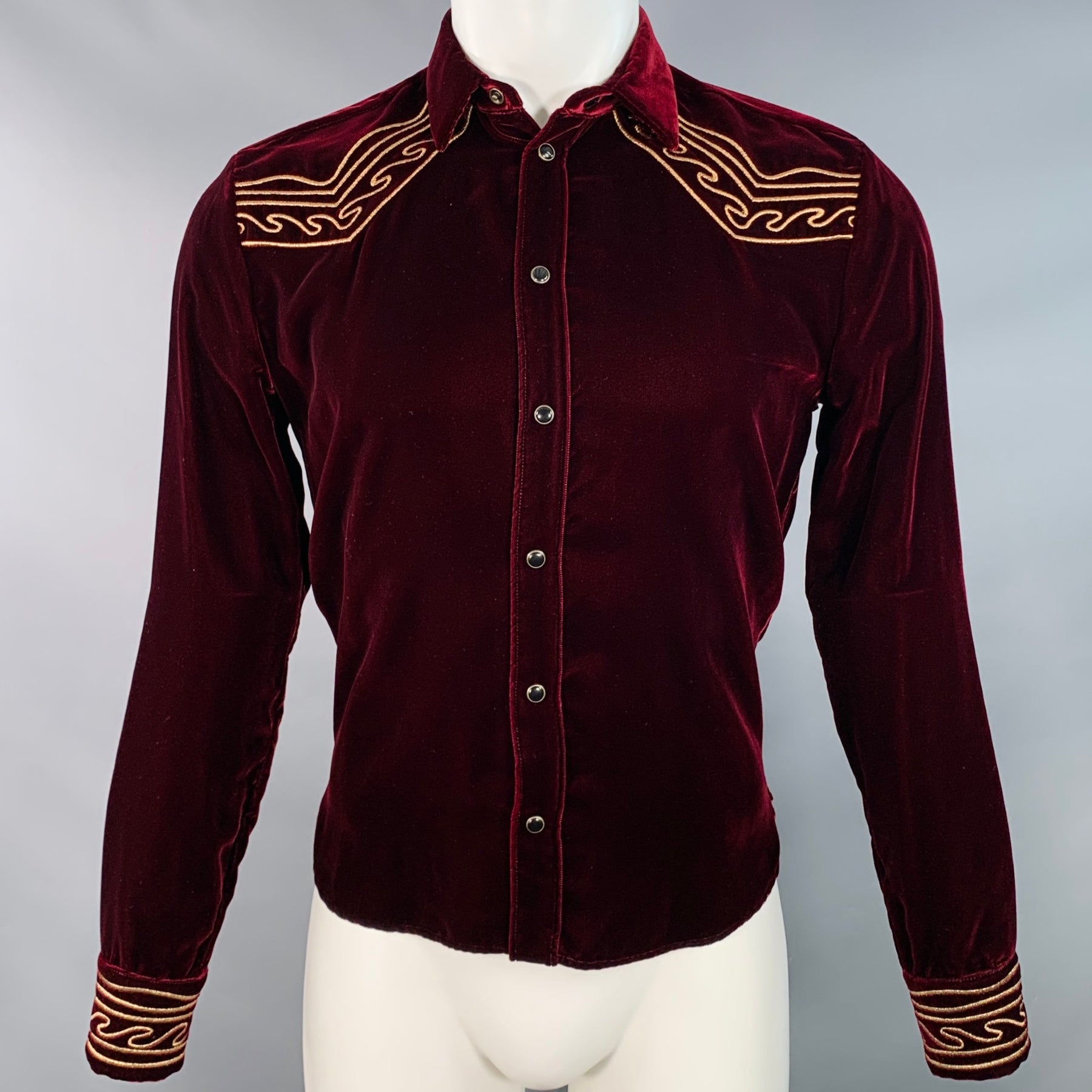 SAINT LAURENT AW18 long sleeve shirt in a burgundy viscose blend velvet featuring a Western style with metallic gold tone embroidery, matching cuff embroidery and snaps closure. Note: this garment has been professionally altered, please double check measurements. Made in Italy.