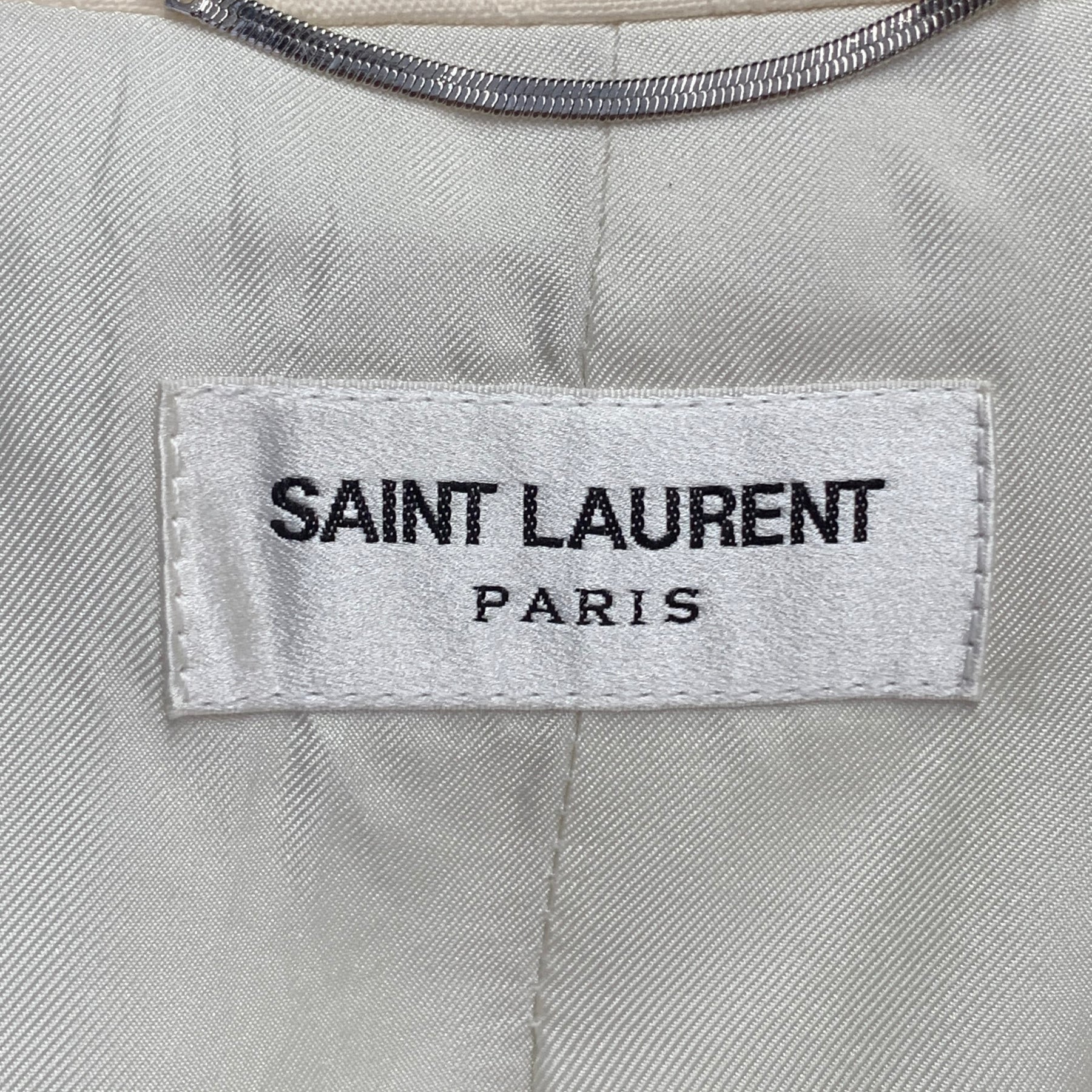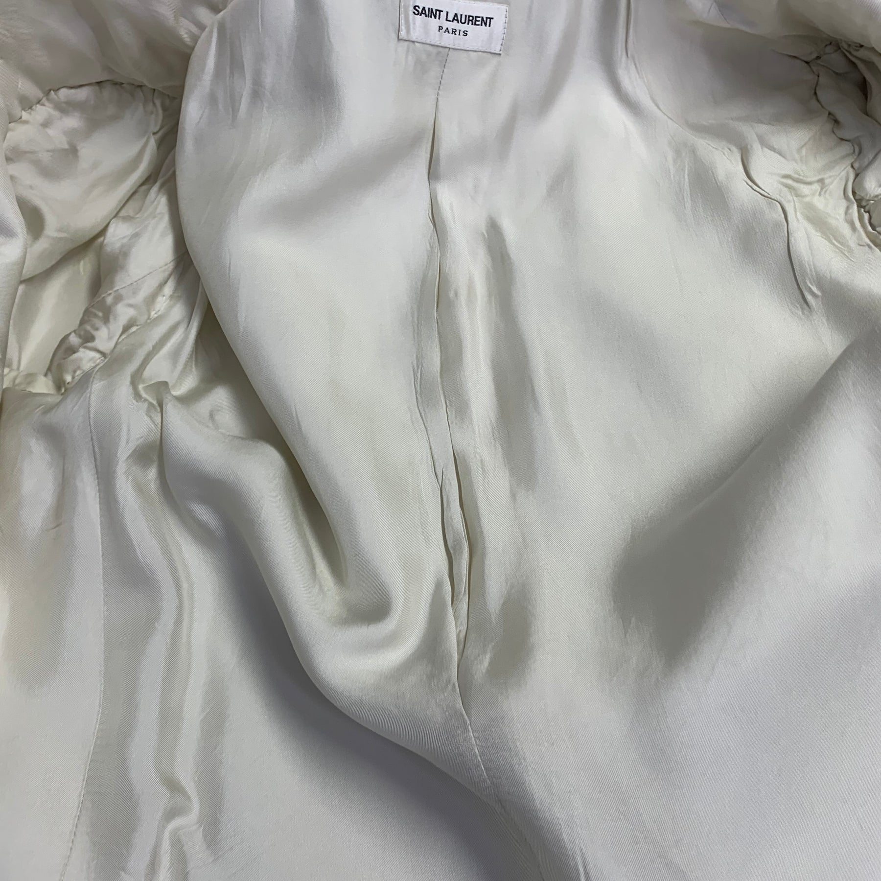 SAINT LAURENT sport coat in a cream and white wool fabric featuring a stripe pattern, peak lapel, single vented back, and single button closure.