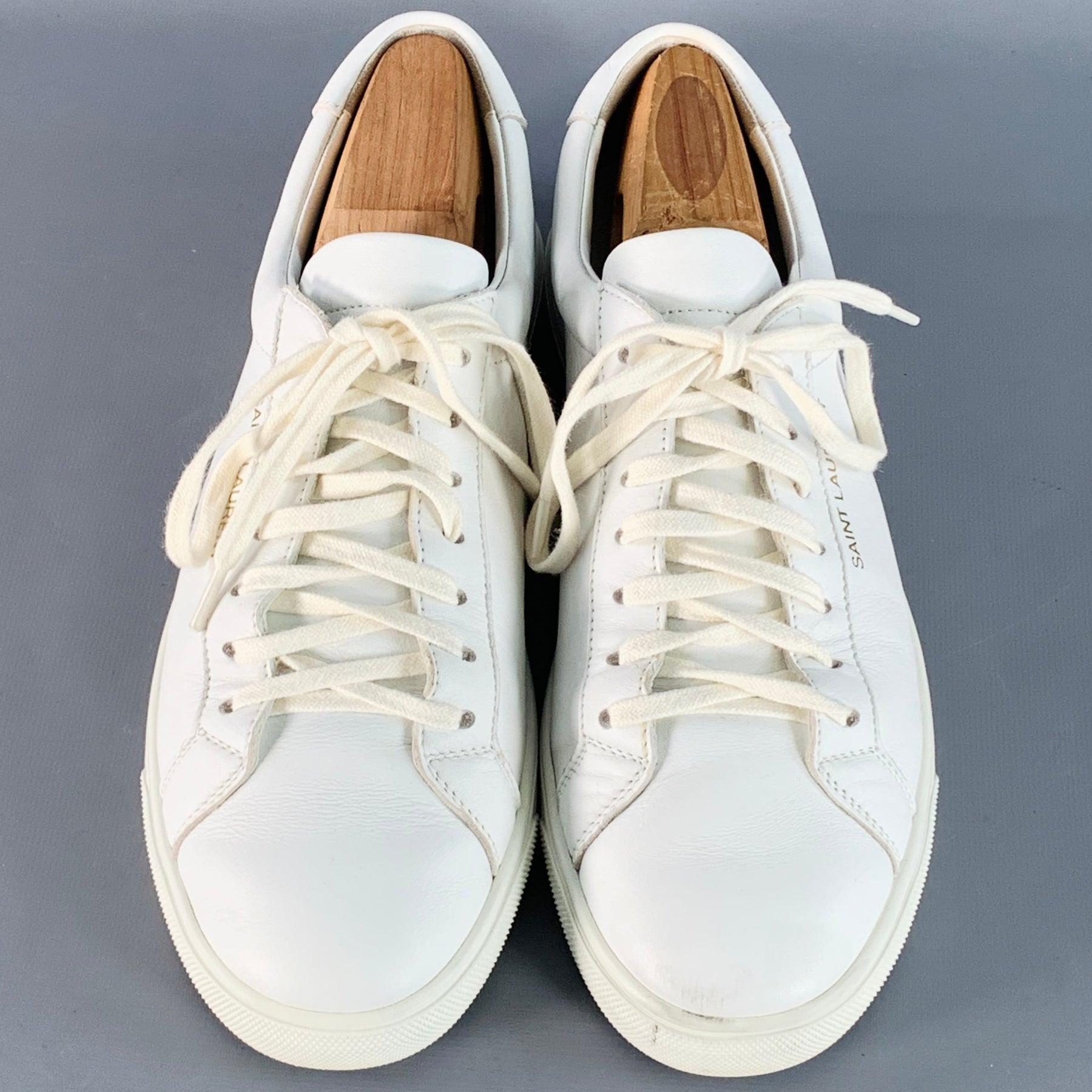 SAINT LAURENT sneakers in a white leather featuring a low top style, metallic gold tone printed logo, and lace-up closure. Shoe trees not included. Made in Italy.