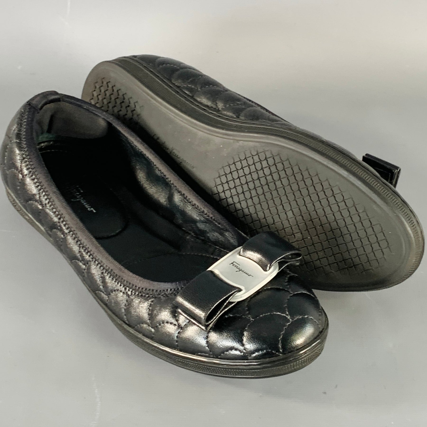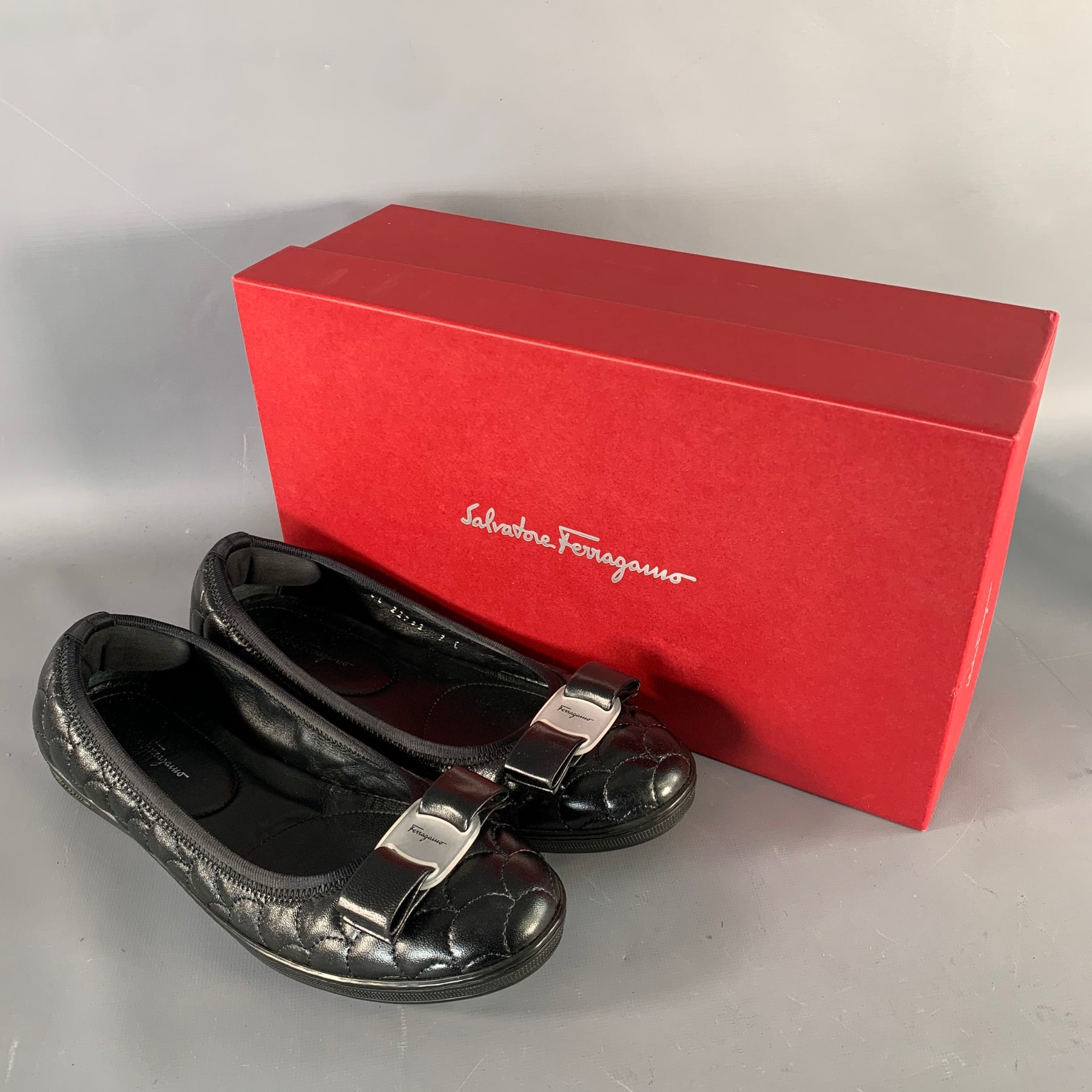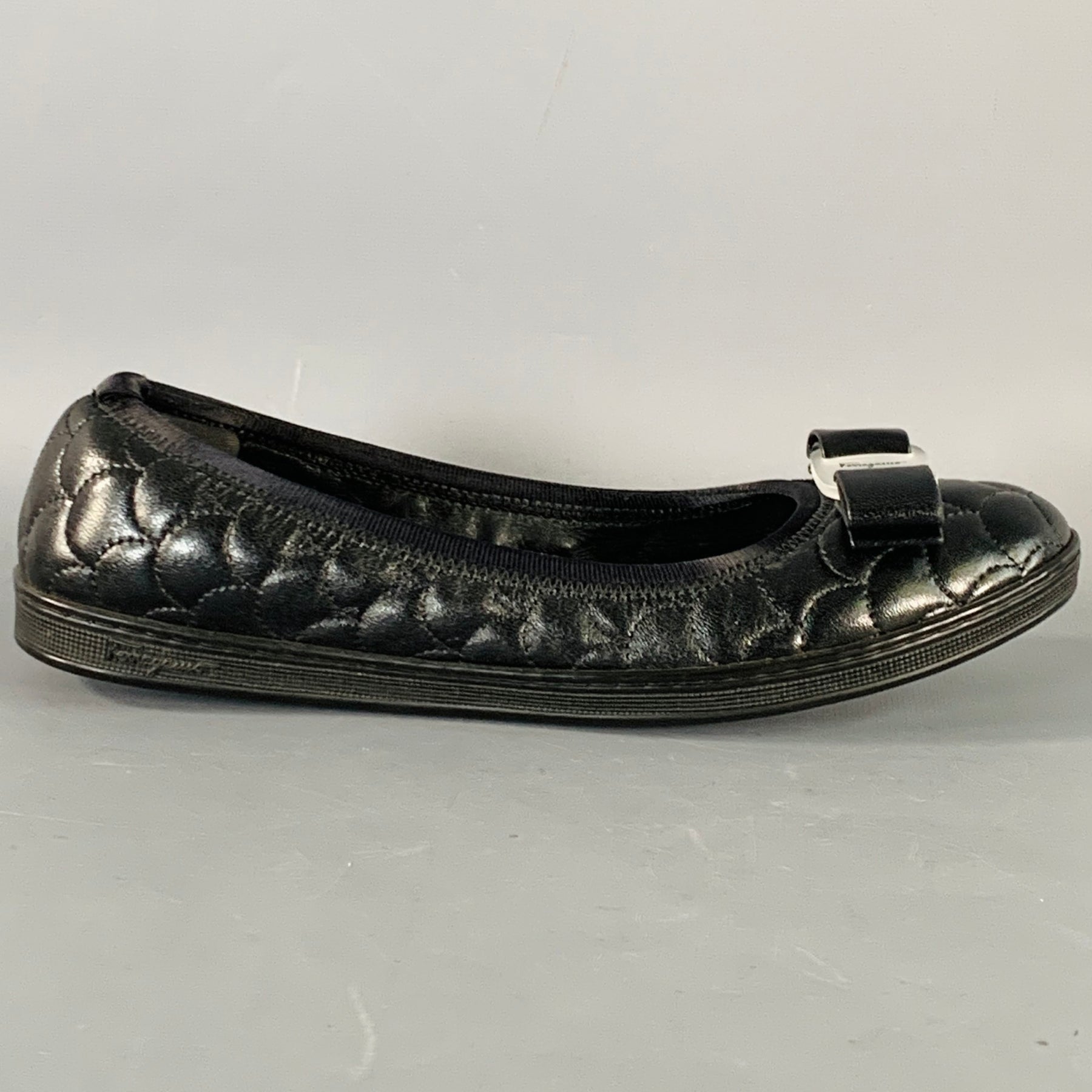SALVATORE FERRAGAMO "Savina" flats in a black leather featuring a quilted style with fishscale pattern, leather bow detail with logo, and slip on closure. Comes with box.