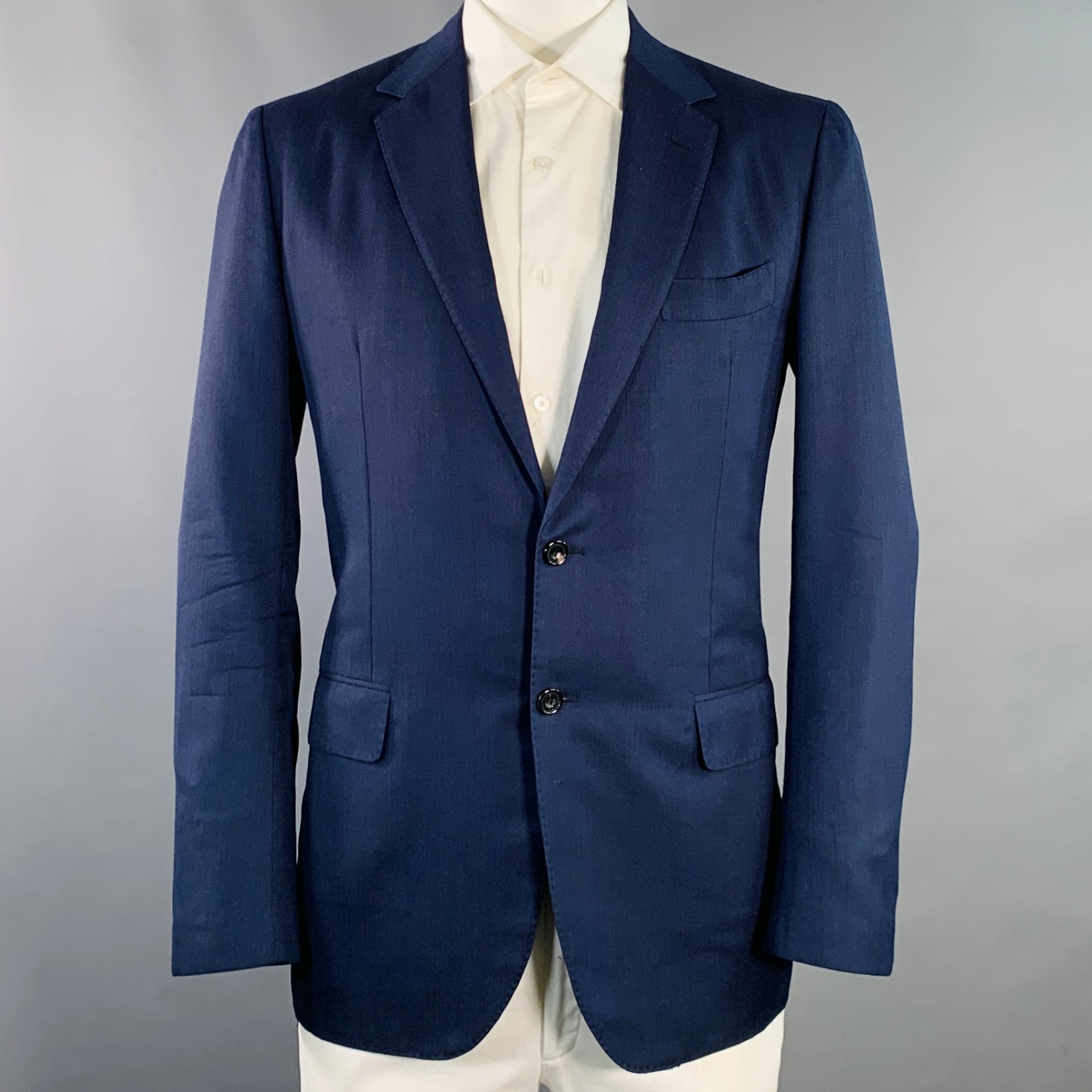 SARTORIO sport coat in a navy wool fabric featuring a notch lapel, double vented back, and double button closure.