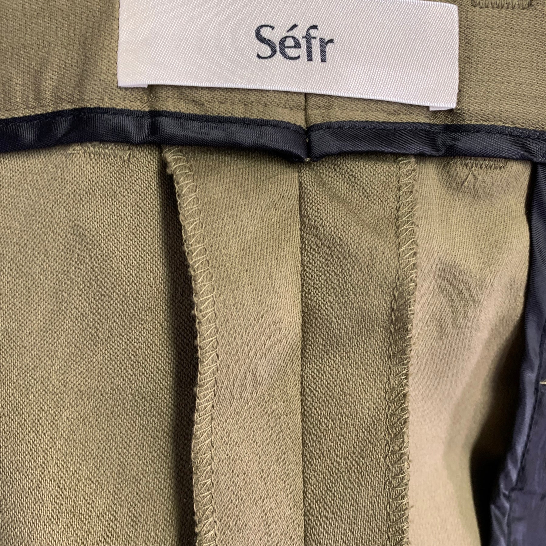SEFR "Harvey" dress pants in a khaki cotton blend fabric featuring a flat front style, tapered leg, and zip fly closure.