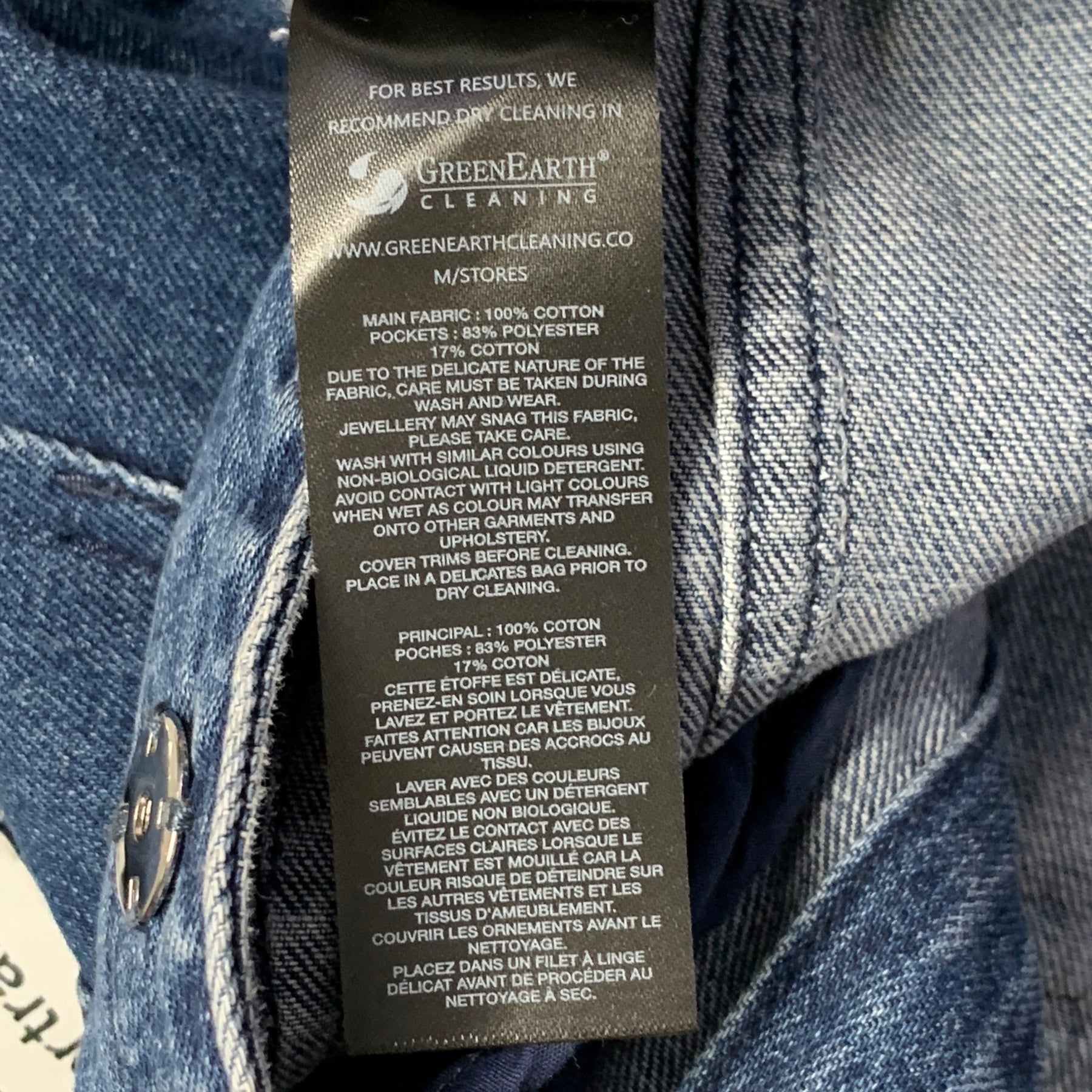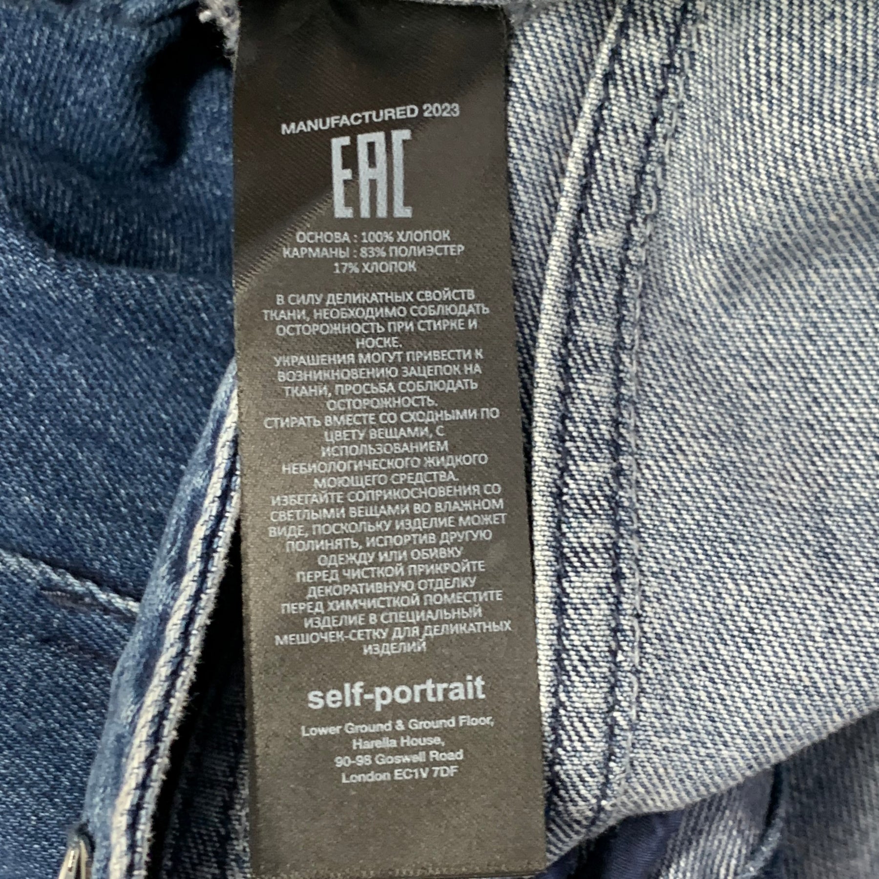SELF-PORTRAIT mini dress in a blue cotton denim twill featuring a silver tone rhinestone trim, four flap pockets, and snap closure with matching rhinestone buttons.