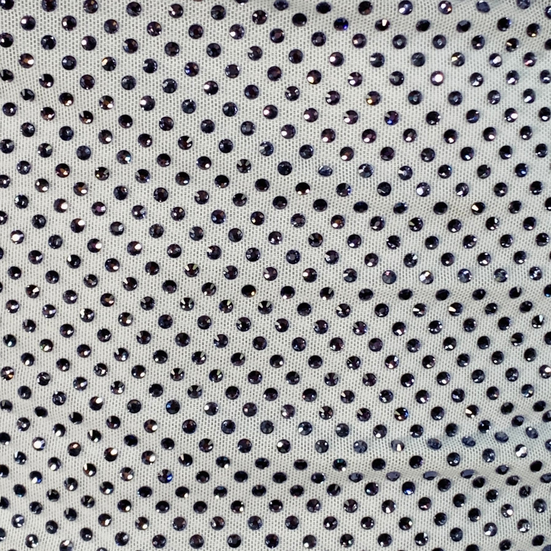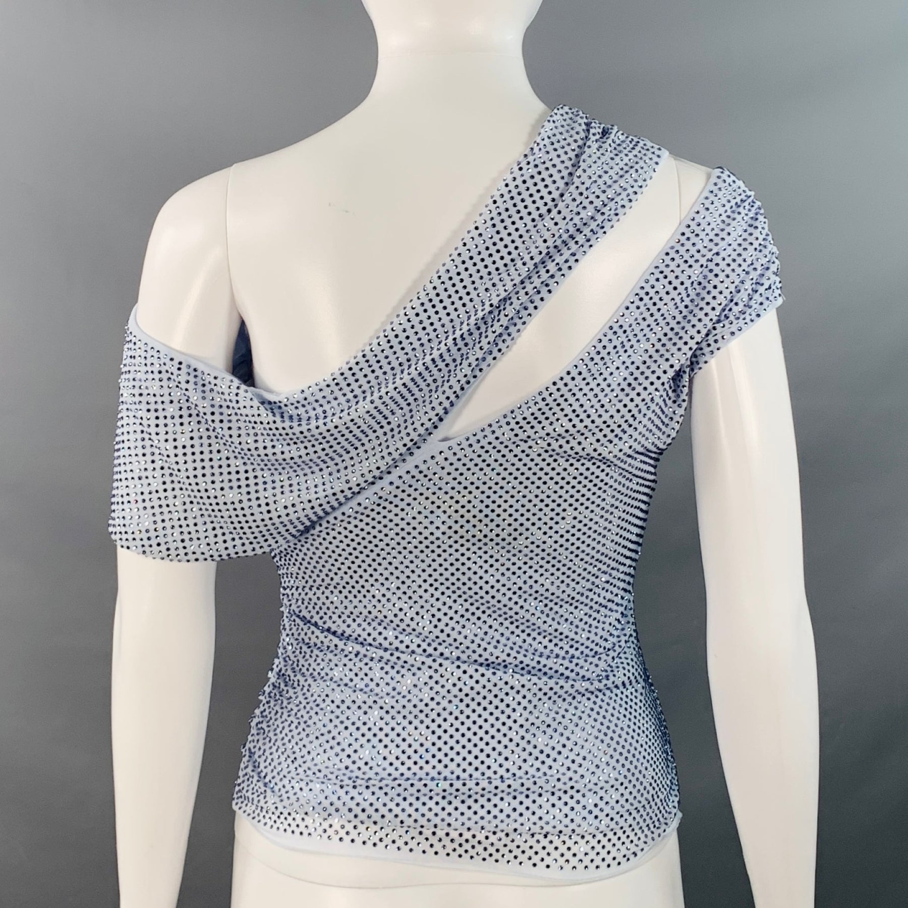 SELF-PORTRAIT dress top in a pale blue polyester blend fabric featuring an all over rhinestone studded design, ruched sides, and drapey shoulders with cutout detail.