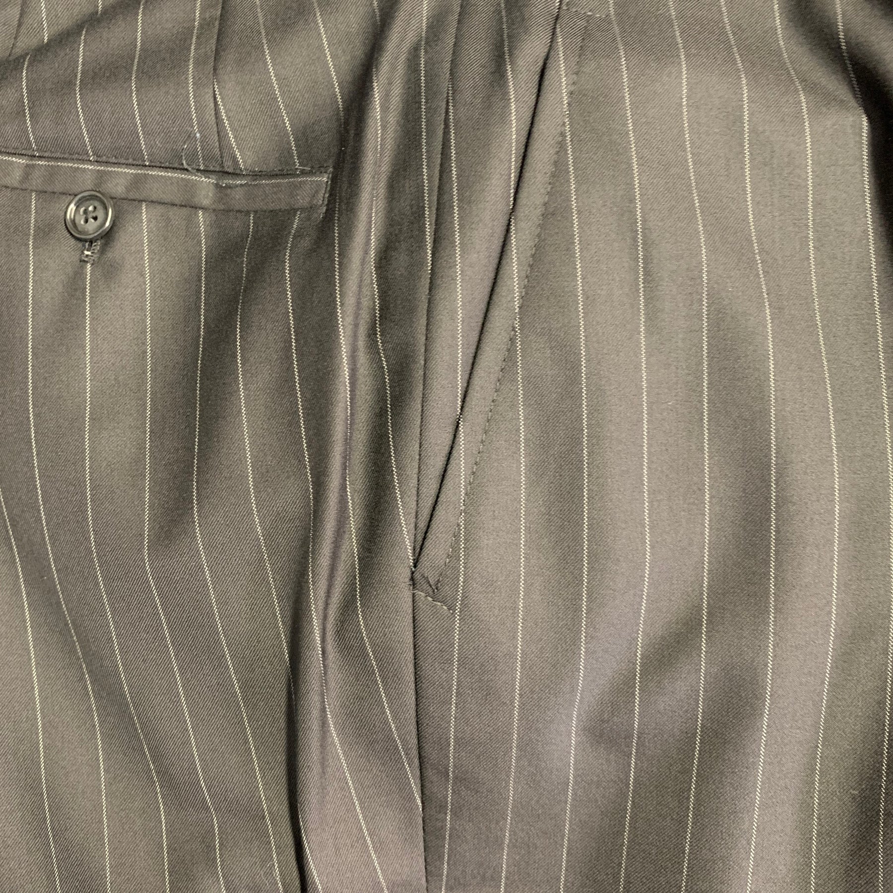 SIMPSON SIN TAILOR suit in a black and white pinstripe wool silk blend with a full liner and includes a single breasted, three button sport coat with a notch lapel and matching flat front trousers.