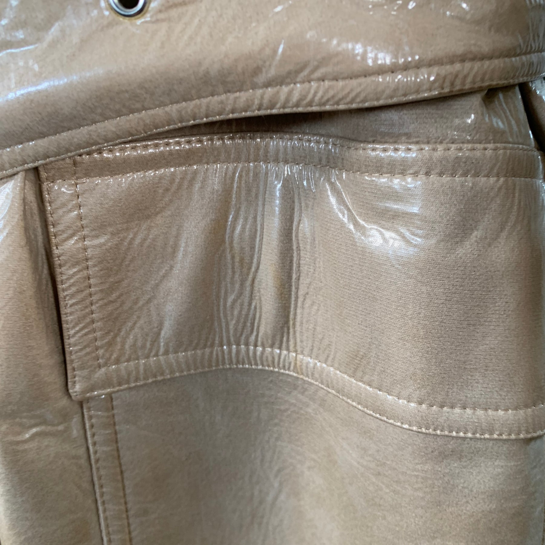 STAND STUDIO "Vada" trenchcoat in a beige polyurethane faux leather featuring a single breasted style, two large flap pockets, and button closure with belt.