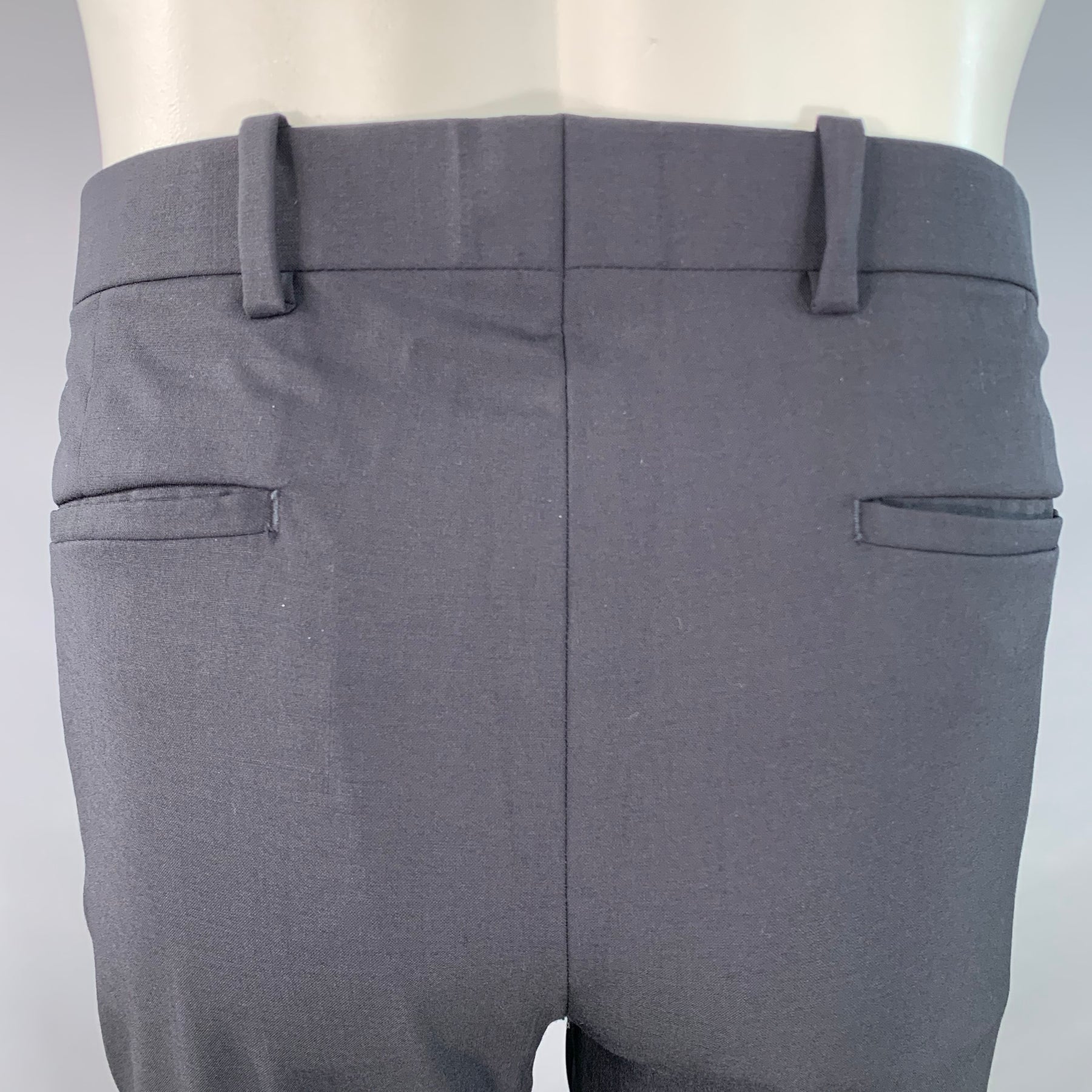 THEORY suit in a black wool blend with a full liner and includes a single breasted, double button sport coat with a notch lapel and matching flat front trousers. Note: the pants on this garment have been professionally altered, please double check measurements.