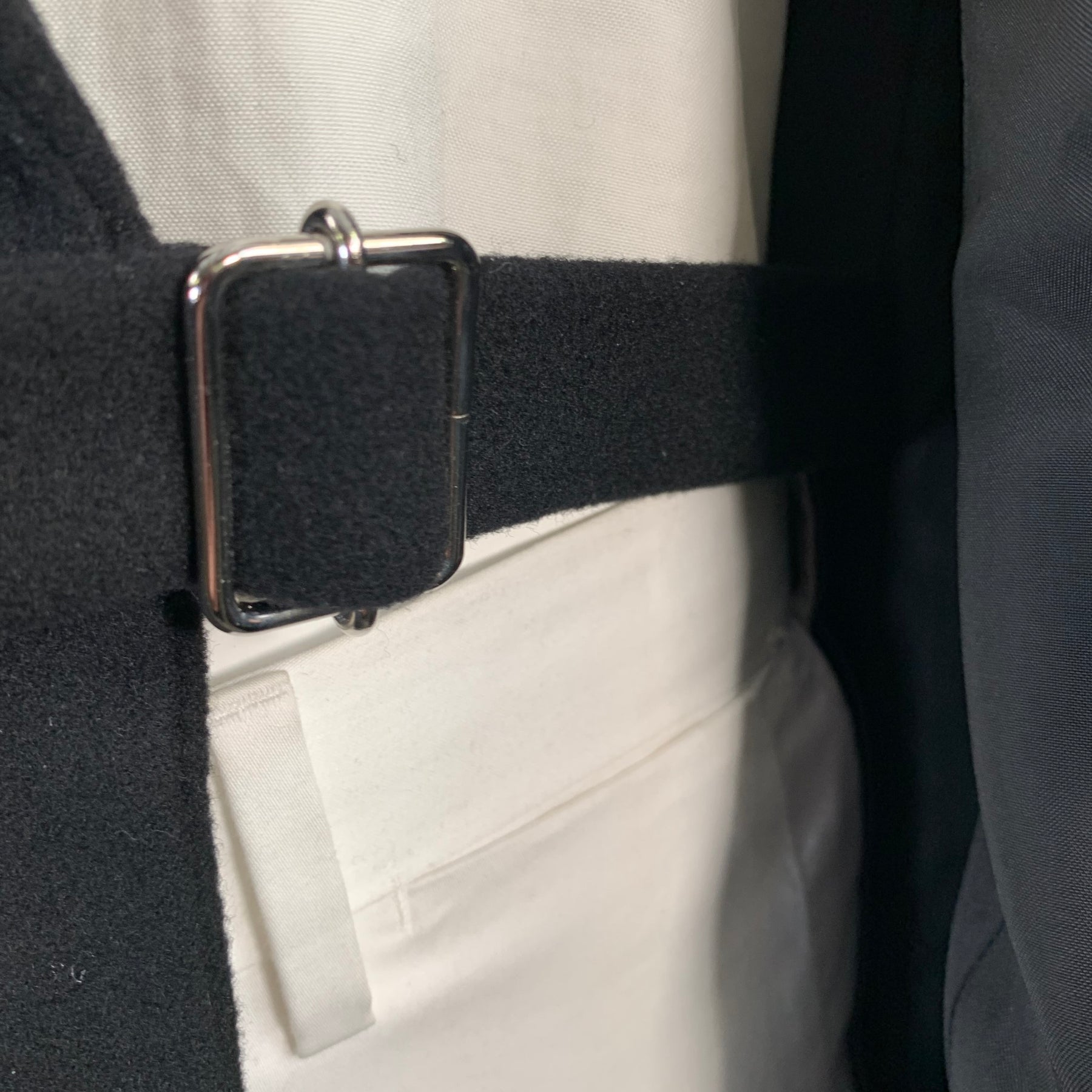 YOHJI YAMAMOTO sport coat in a black wool fabric featuring a peak lapel, ventless back, and three button closure with buckle.