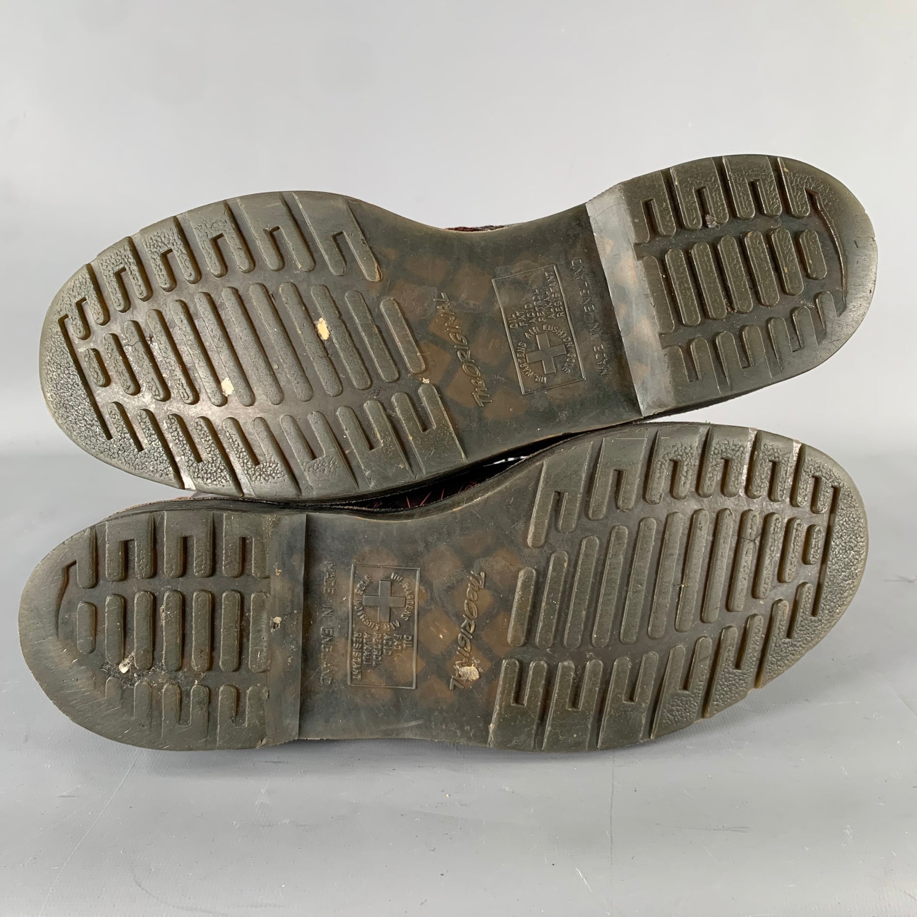 DOC MARTENS "Air Wair" boots in a burgundy leather featuring abstract print leather finishing design, and lace-up closure.  Made in England.
