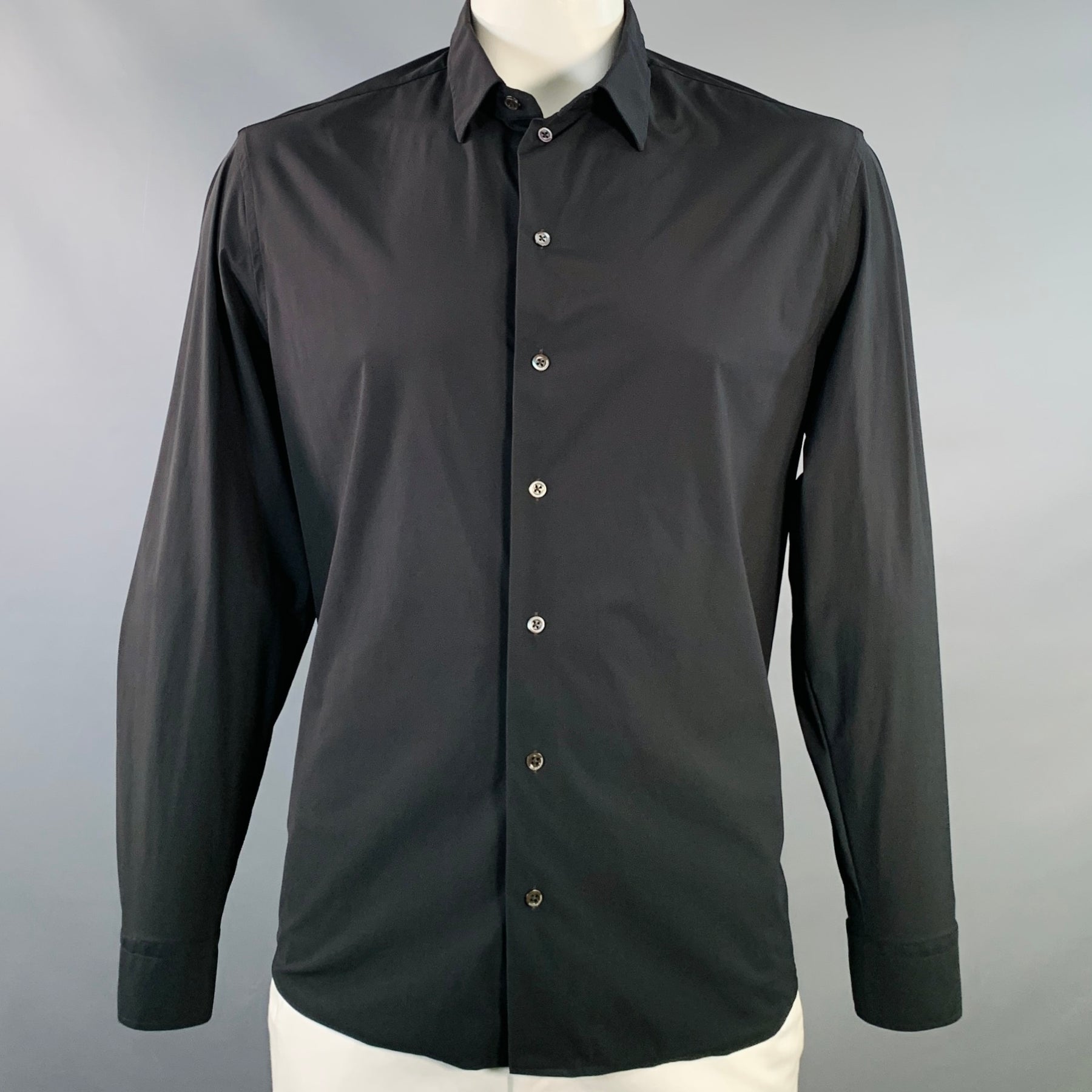 EMPORIO ARMANI long sleeve shirt in a black polyamide stretch blend fabric featuring a spread collar, rounded single button barrel cuffs, and button closure.