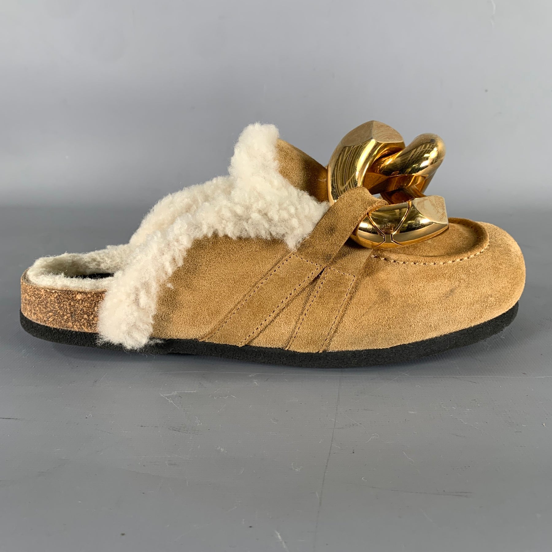 JW ANDERSON mules flats in a tan suede and cream faux shearling lining featuring a gold xl chain link toe detail. Made in Italy.