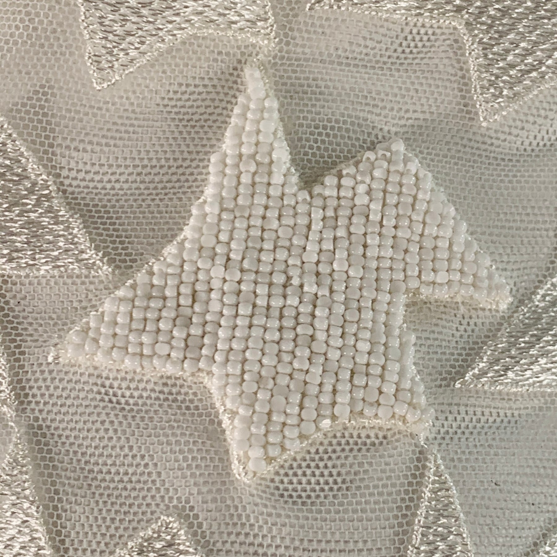 AKRIS shirt in a white polyester lace featuring an abstract pattern with beaded patch detail, Nehru collar, and button closure. Made in Romania.