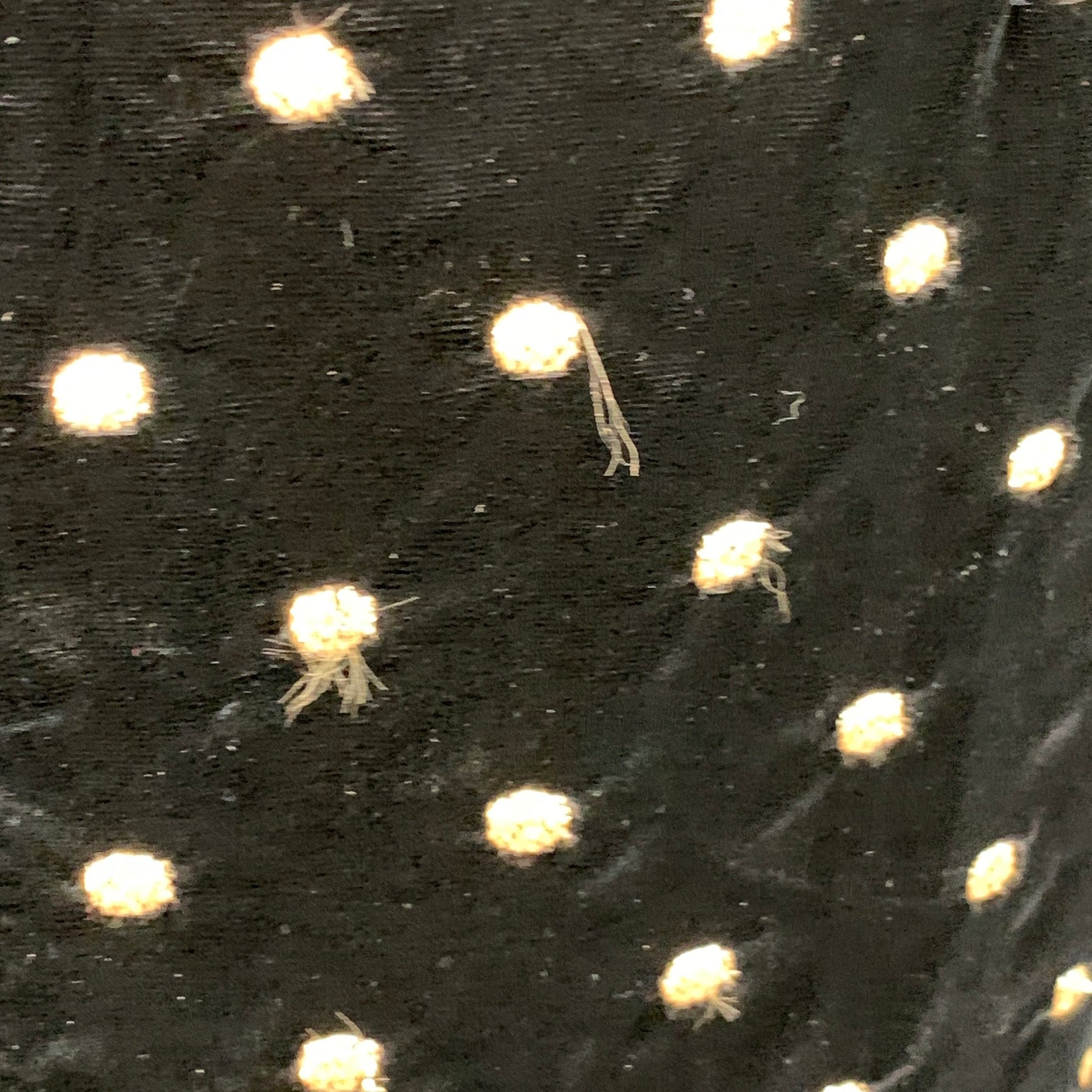 AKRIS dress in a black velvet featuring a metallic gold tone polka dot pattern, large black and gold tone bow detail, and back zipper closure. Made in Switzerland.