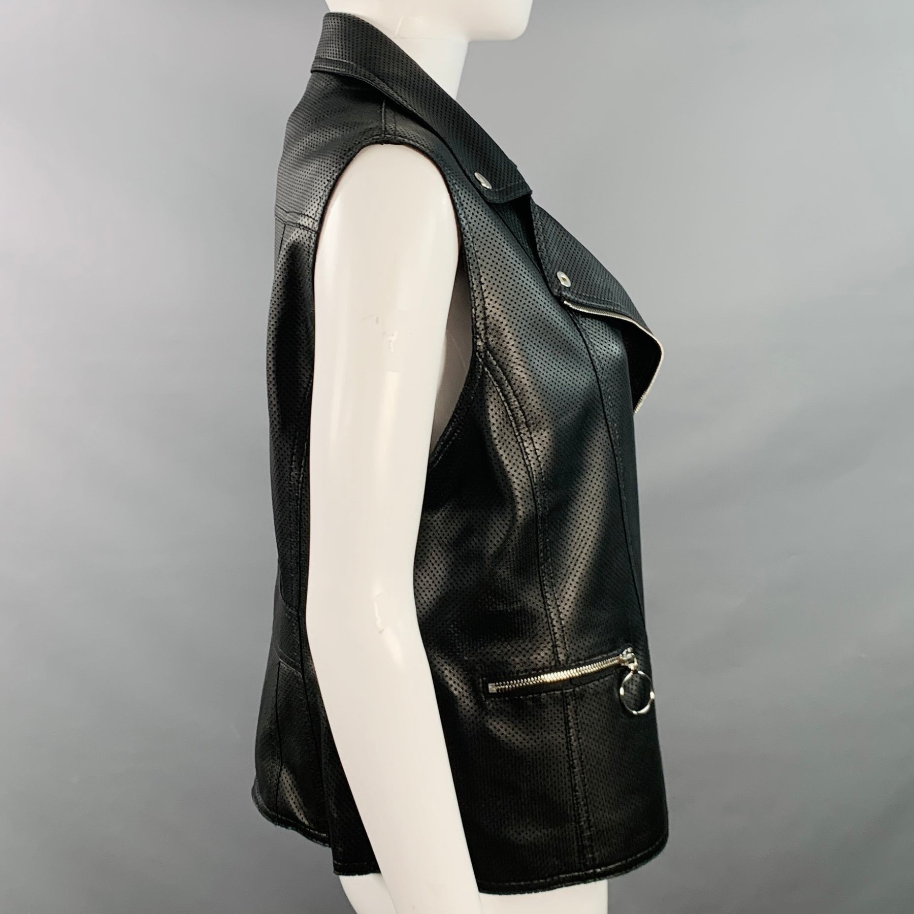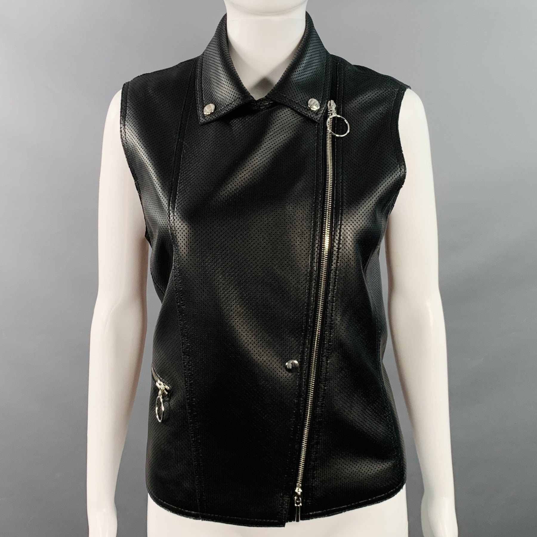AKRIS PUNTO vest in a buttery soft black lambskin leather featuring an all over perforated design, one zip pocket with silver tone metal O-ring zipper pull, and asymmetrical zipper closure. Made in Romania.