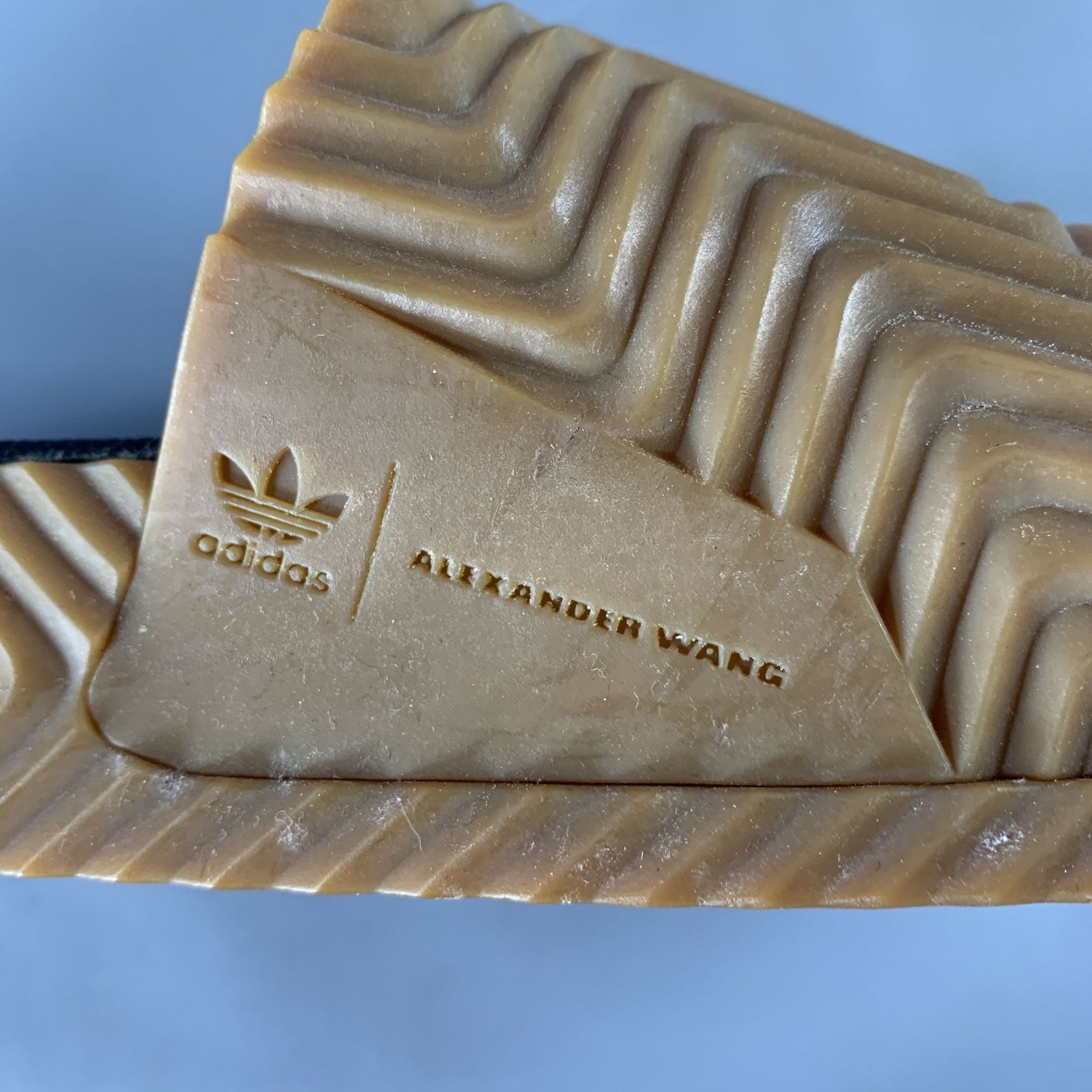 ALEXANDER WANG x ADIDAS "Adilette" sandals in a black, brown, and beige rubber featuring a slide style, color block zig zag design, and slip on closure.