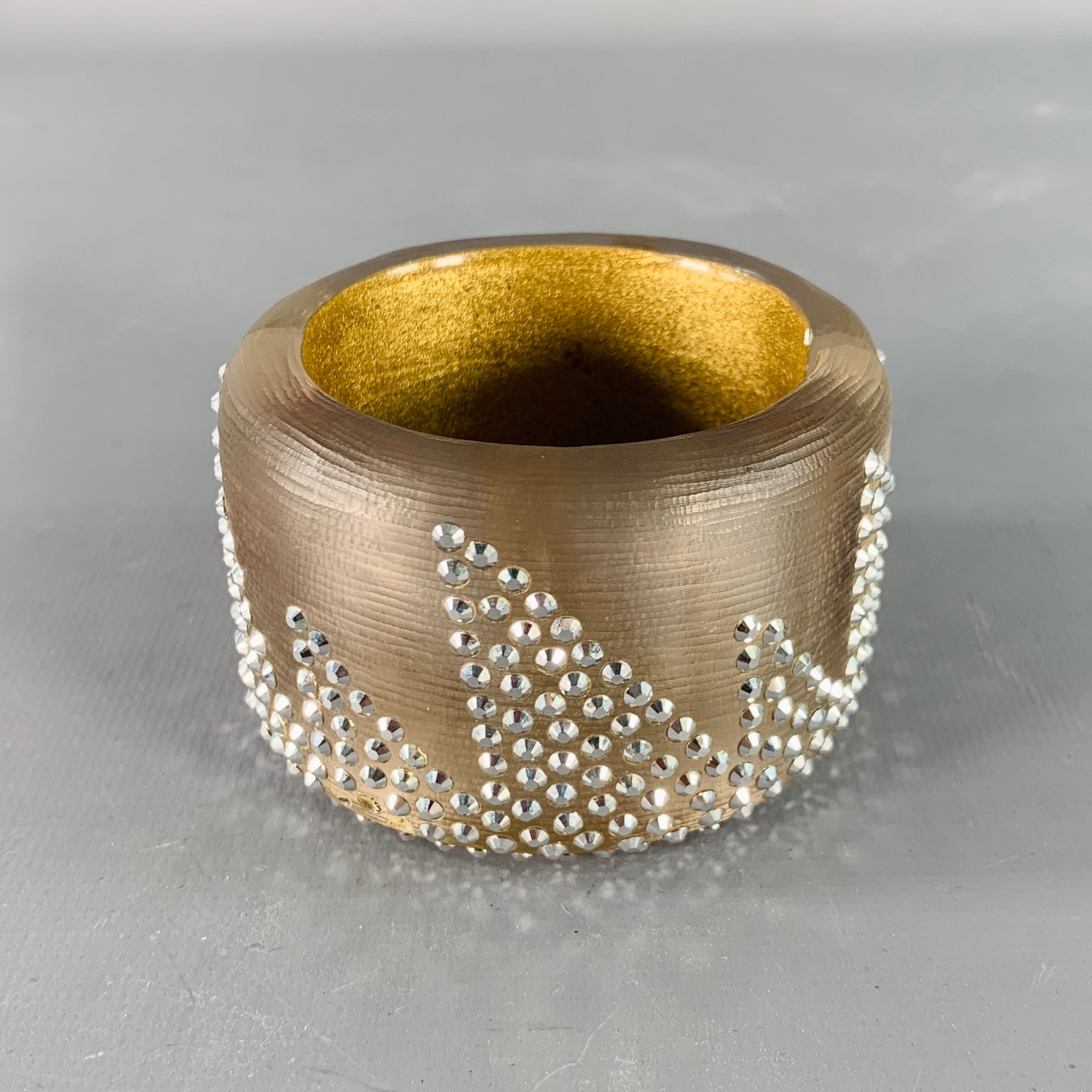 ALEXIS BITTAR cuff bracelet in a grey lucite featuring a silver tone rhinestone design, and magnetic closure with hinge. Hand carved.