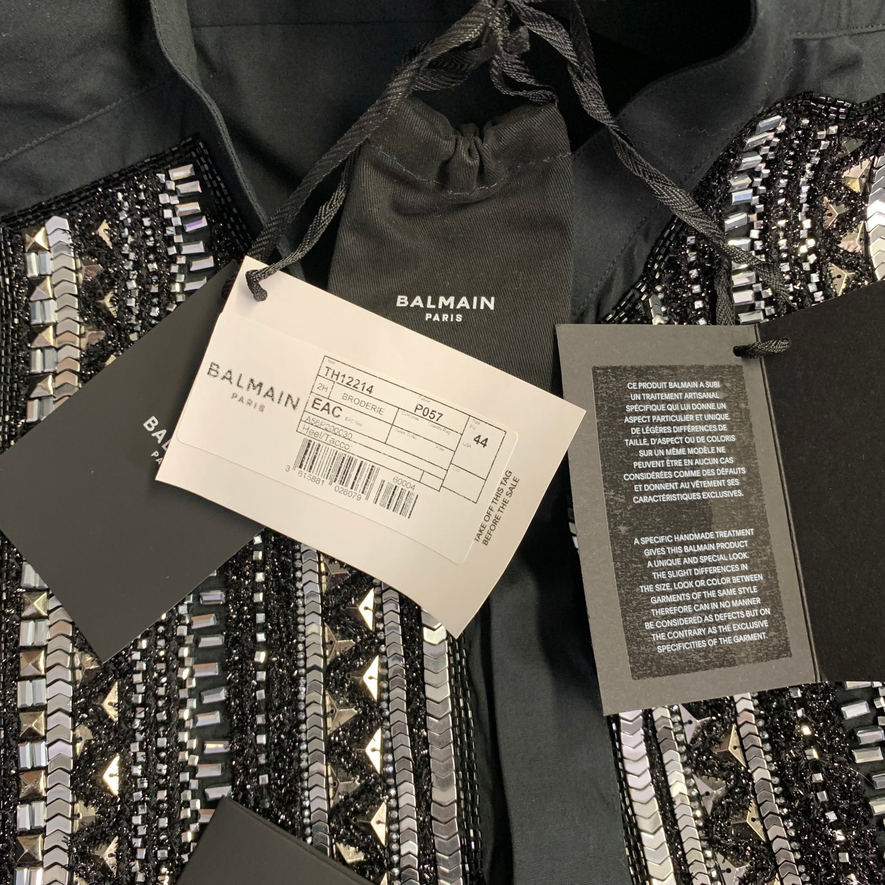 BALMAIN Size XS Black Silver Beaded Bib Nehru Collar Long Sleeve Shirt