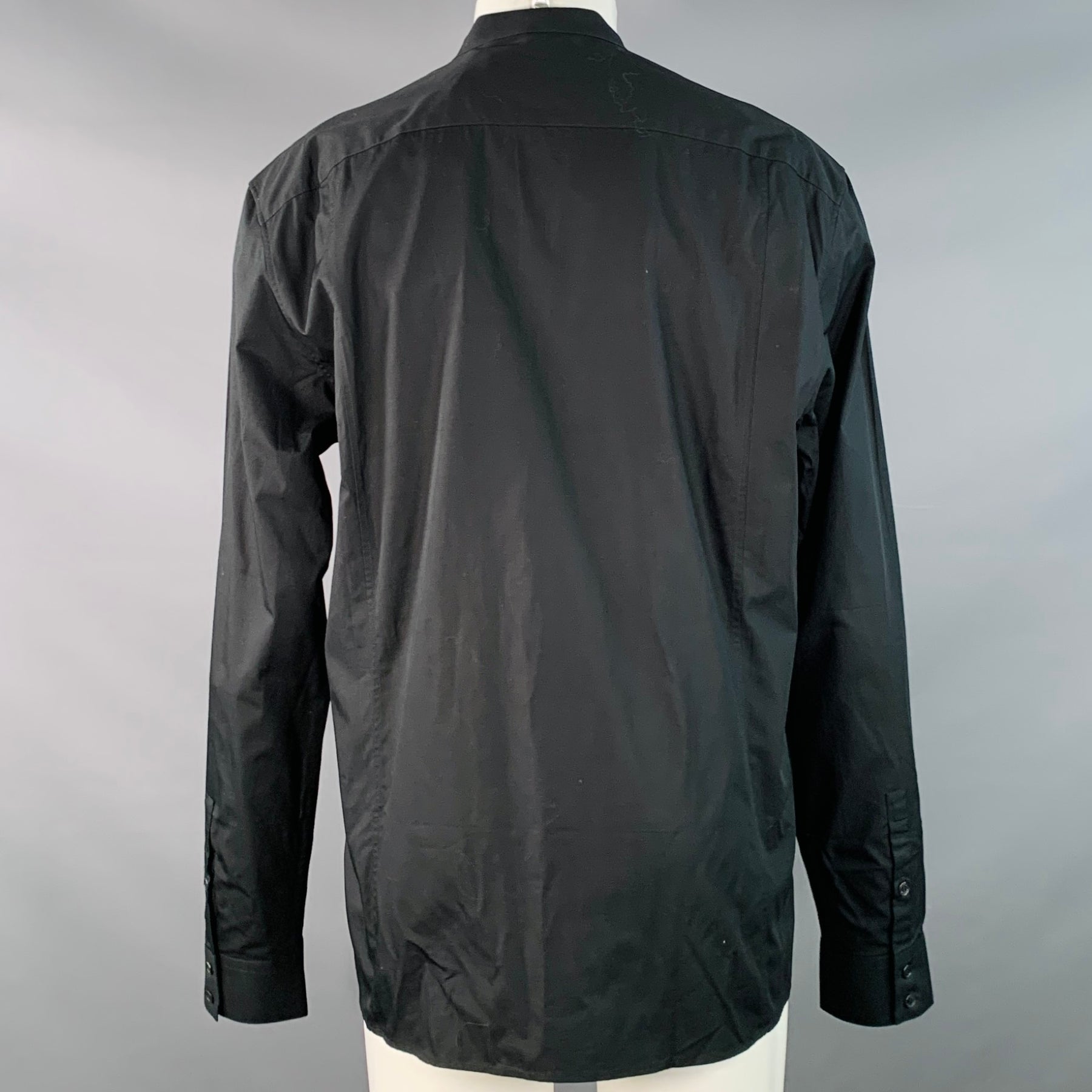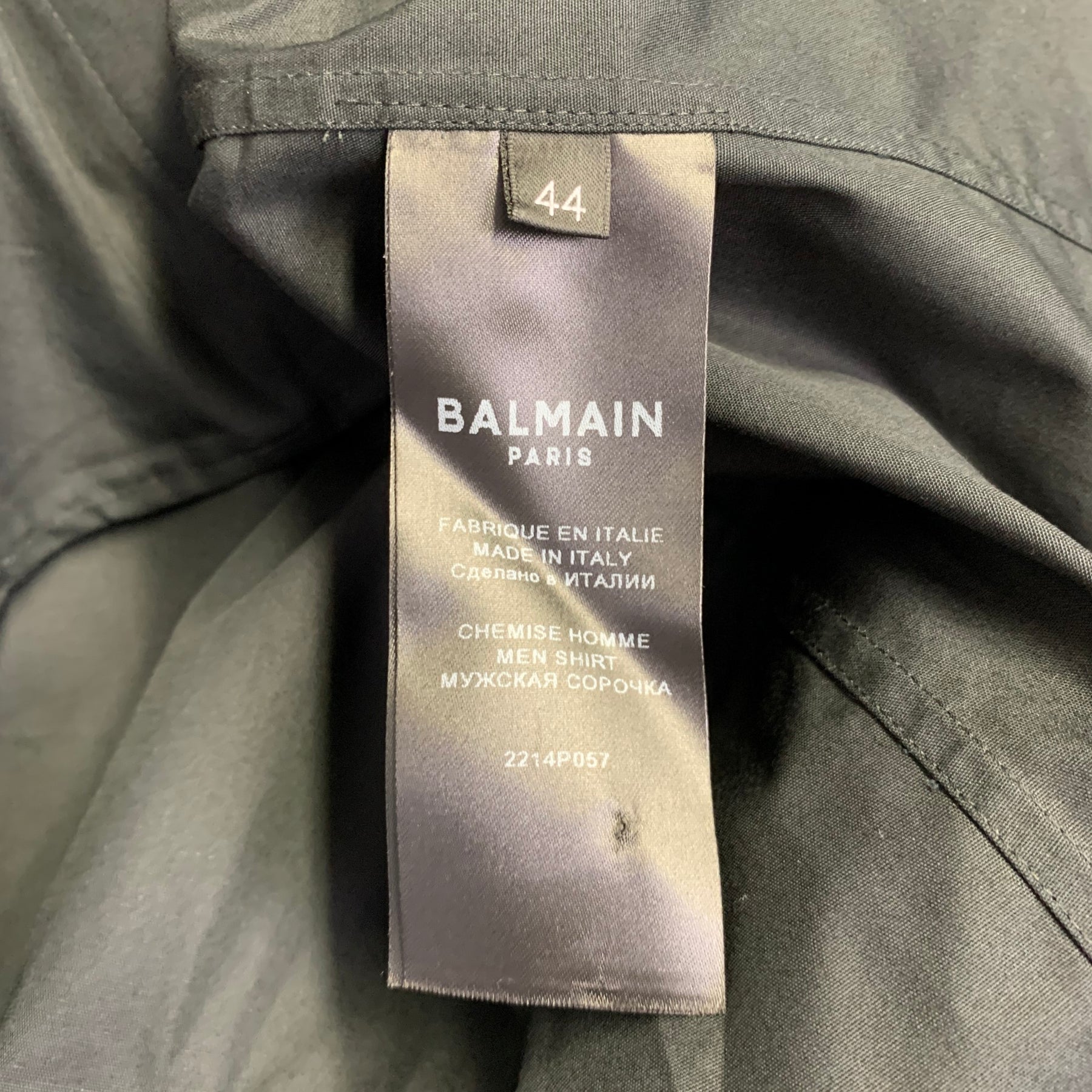 BALMAIN long sleeve shirt in a black cotton woven fabric featuring a silver tone metal bib with beads and textured details, Nehru collar, and button closure. Made in Italy.