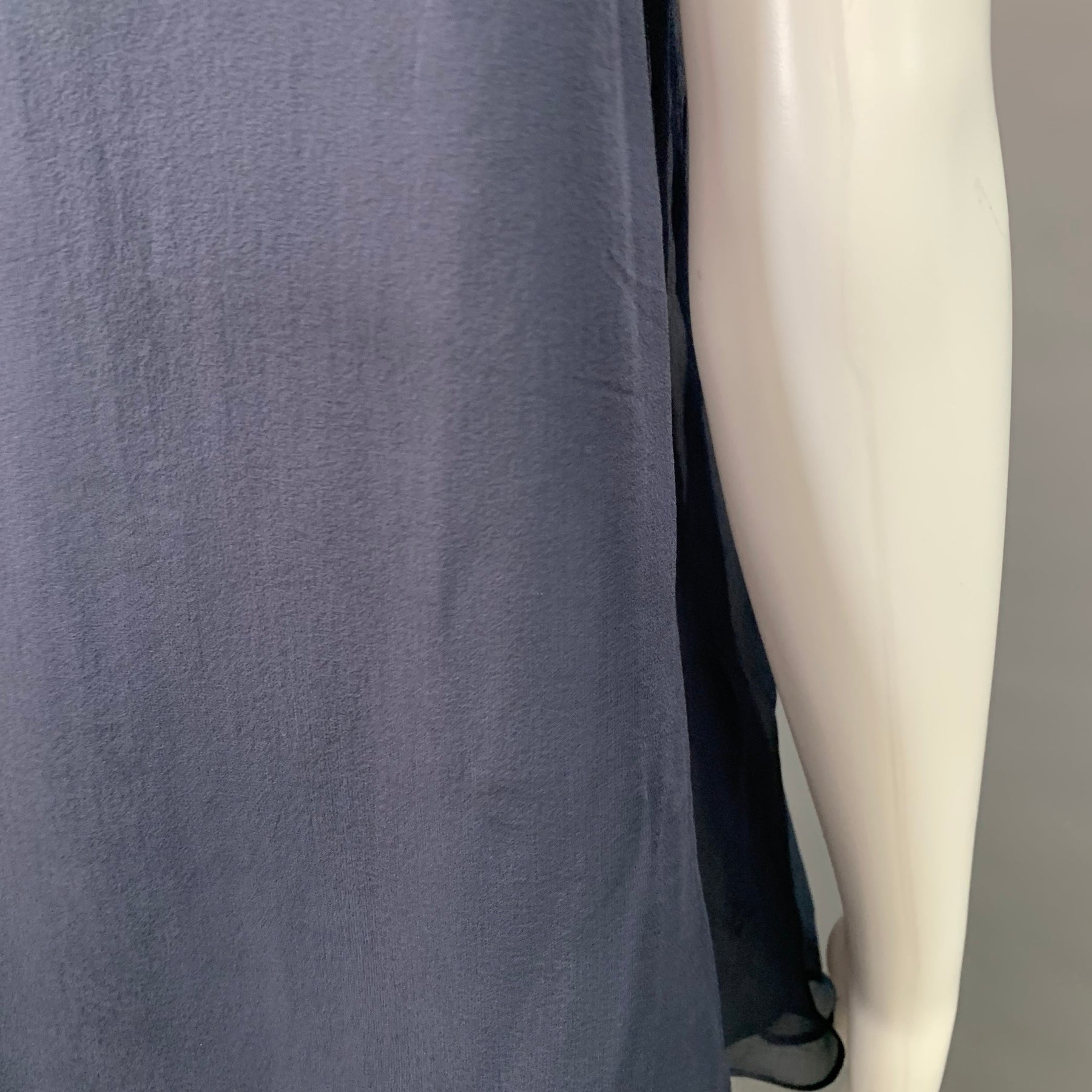 BRUNELLO CUCINELLI blouse in a navy silk chiffon with black satin featuring a sleeveless style, monili beaded details, and single snap with V-neck.