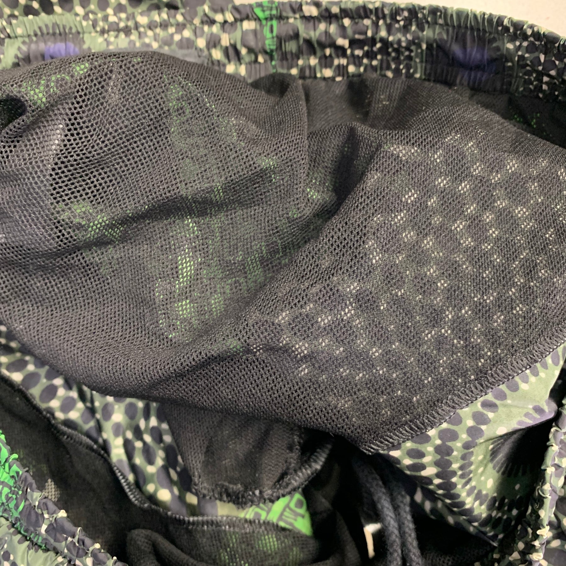 BURBERRY PRORSUM swim trunks in a green and black fabric (feels like polyamide) featuring an abstract pattern, mesh lining, and drawstring waistband closure. Comes with matching storage pouch.
