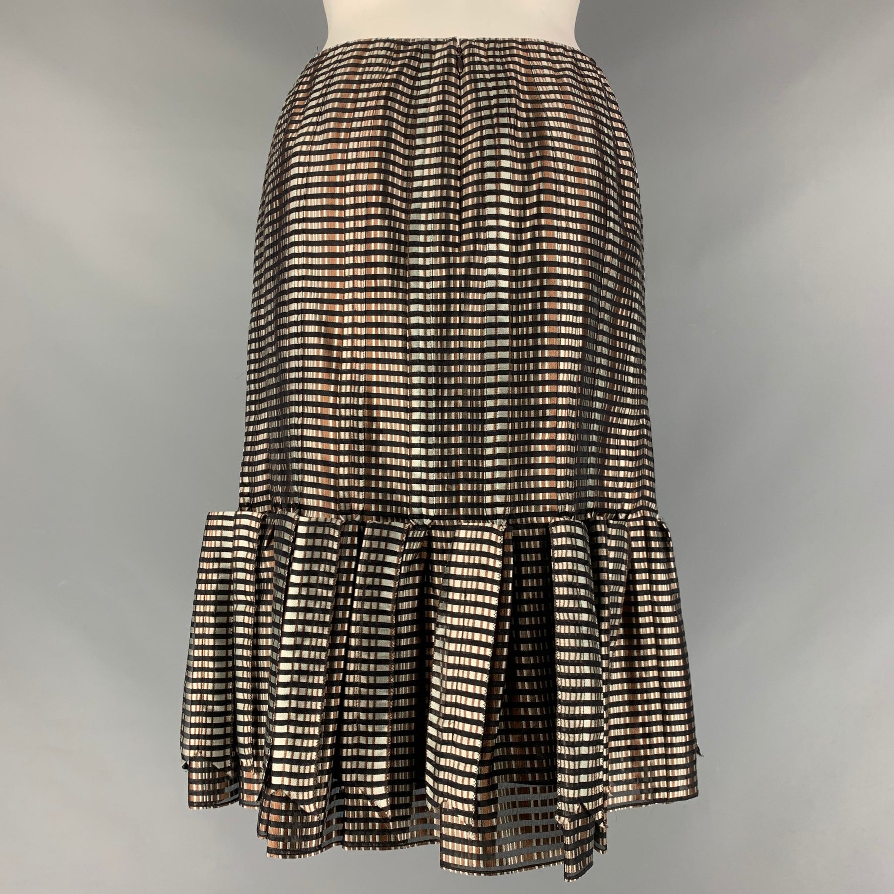 CAROLINA HERRERA skirt comes in a black, brown and grey checkered silk featuring a pleated style, and a center back invisible zip up closure. Made in USA.