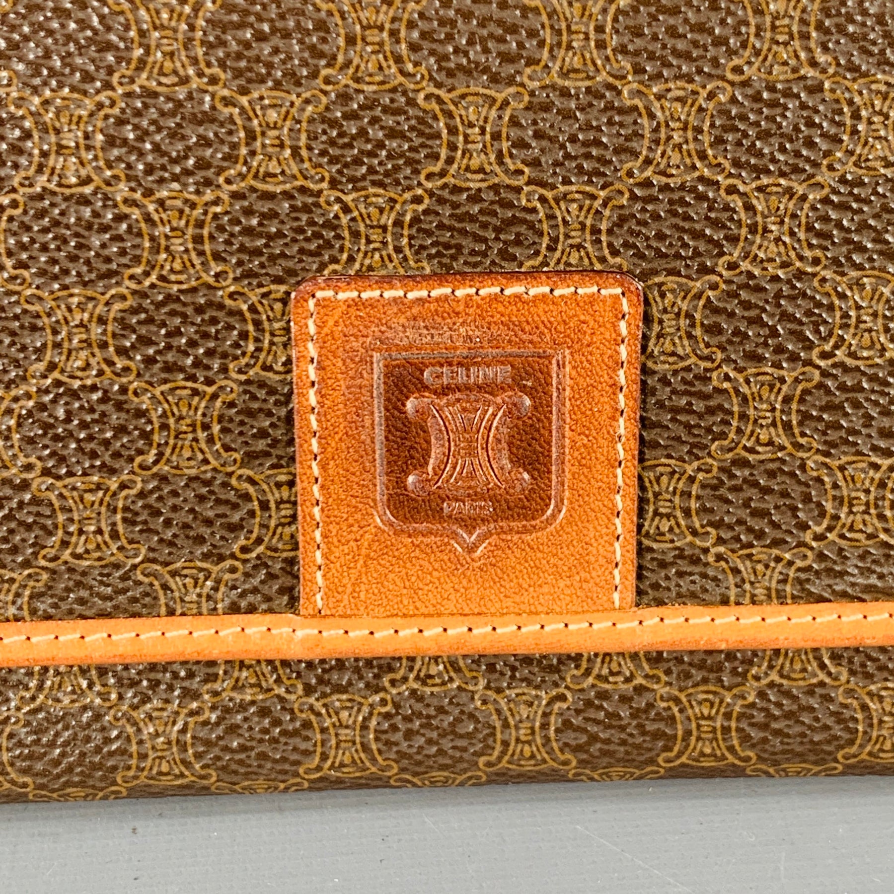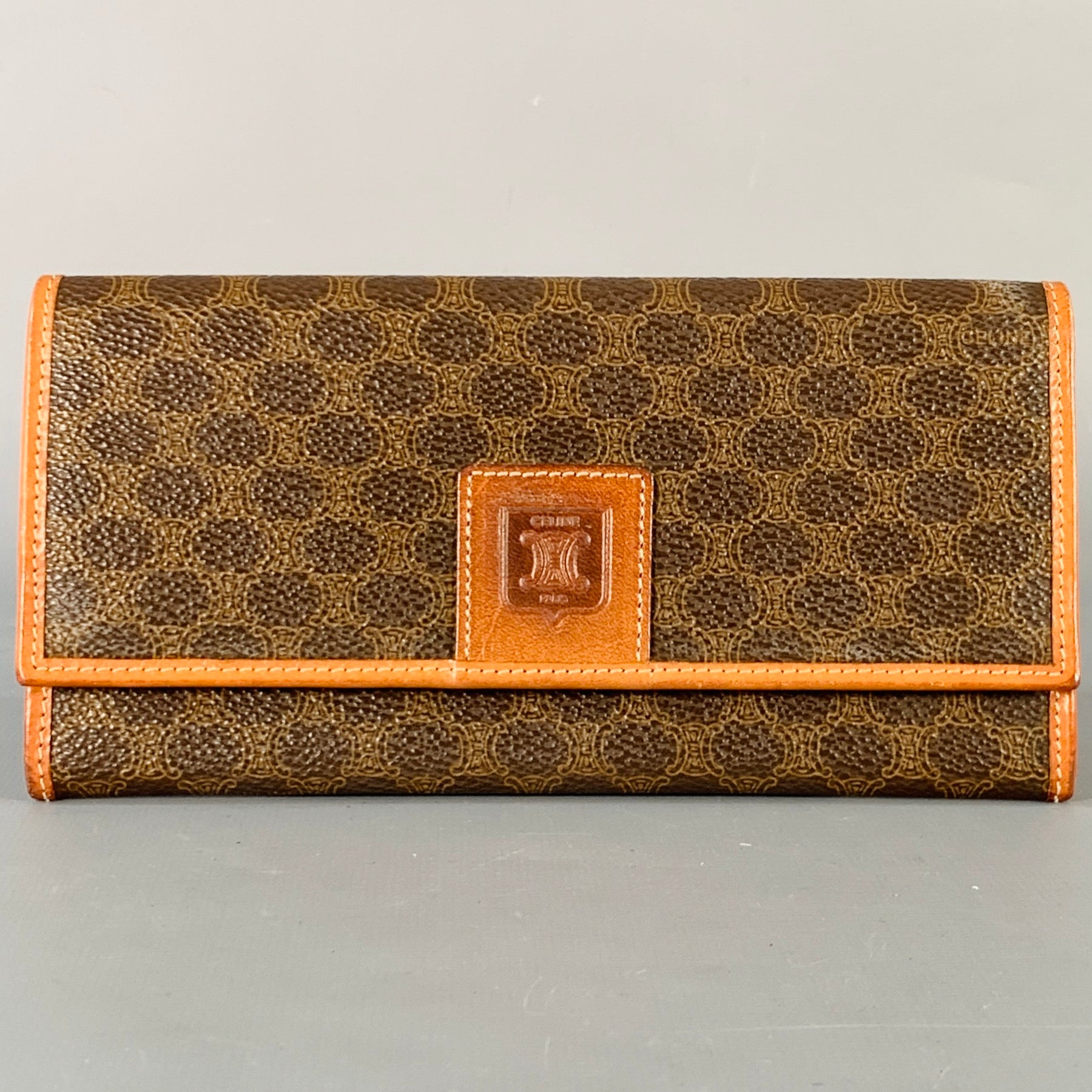 CELINE PARIS wallet in a brown and tan coated canvas featuring a checkbook style, all over logo pattern, and single snap closure.