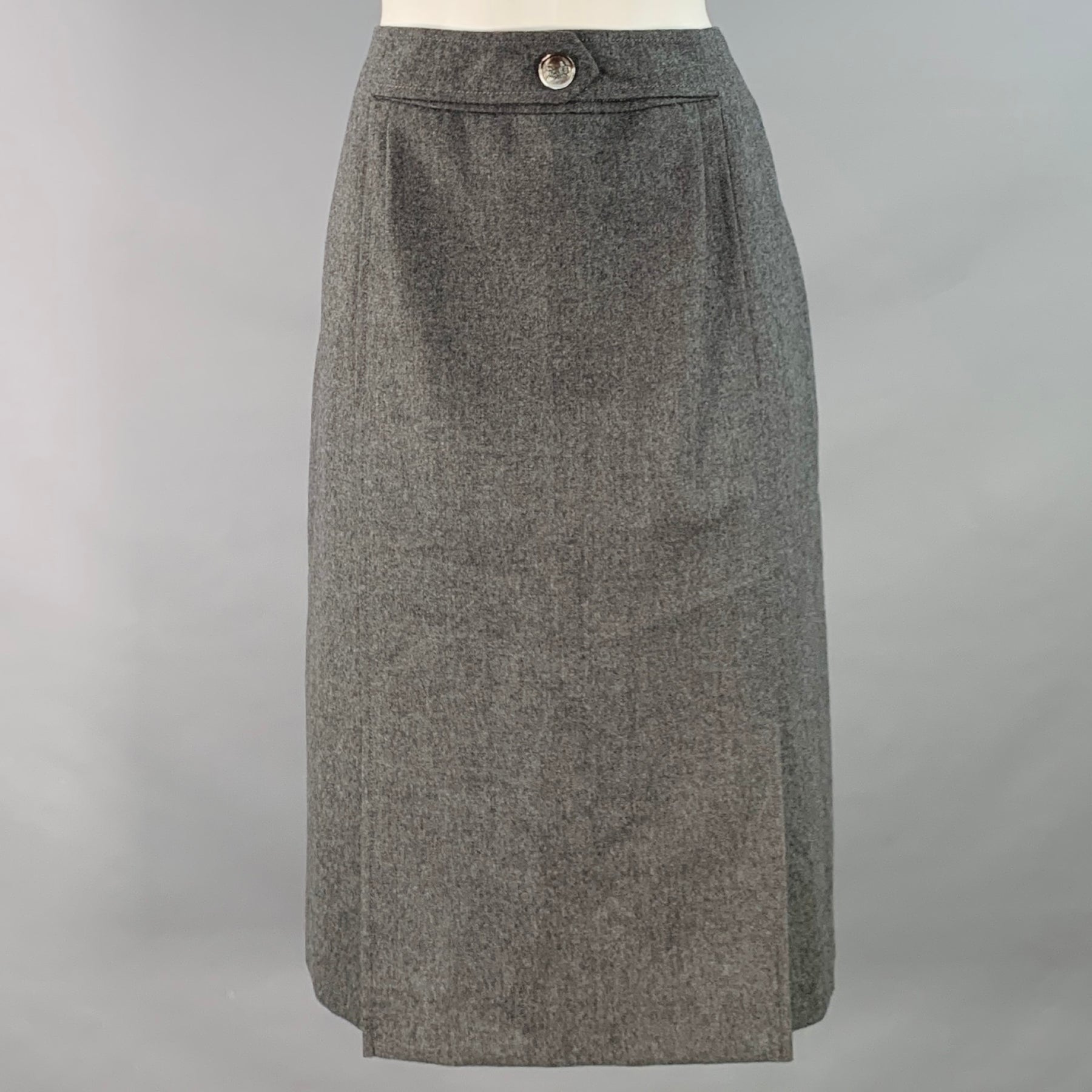 CELINE skirt in a heather grey wool featuring a pleated style, mother-of-pearl logo button detail, and back zipper closure.