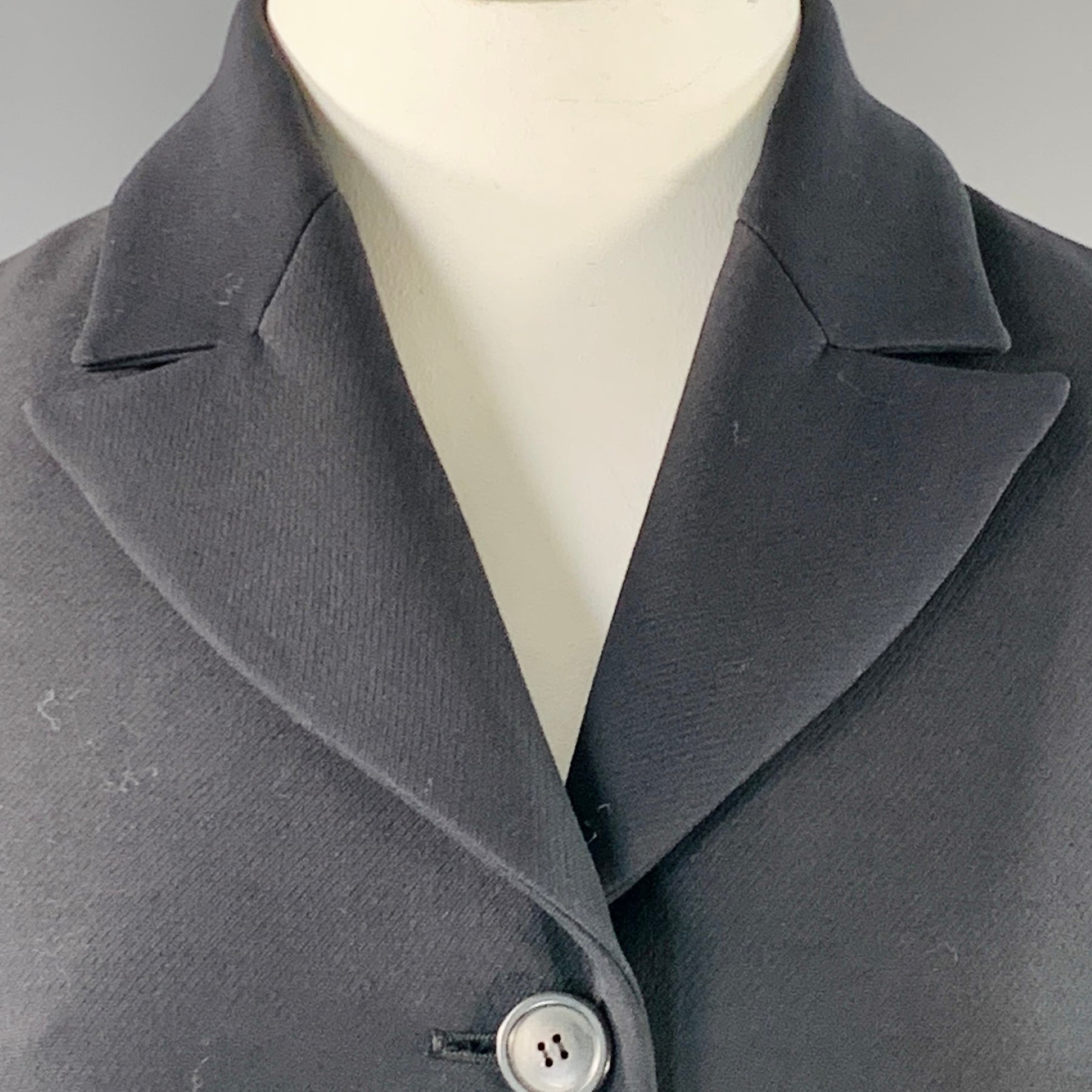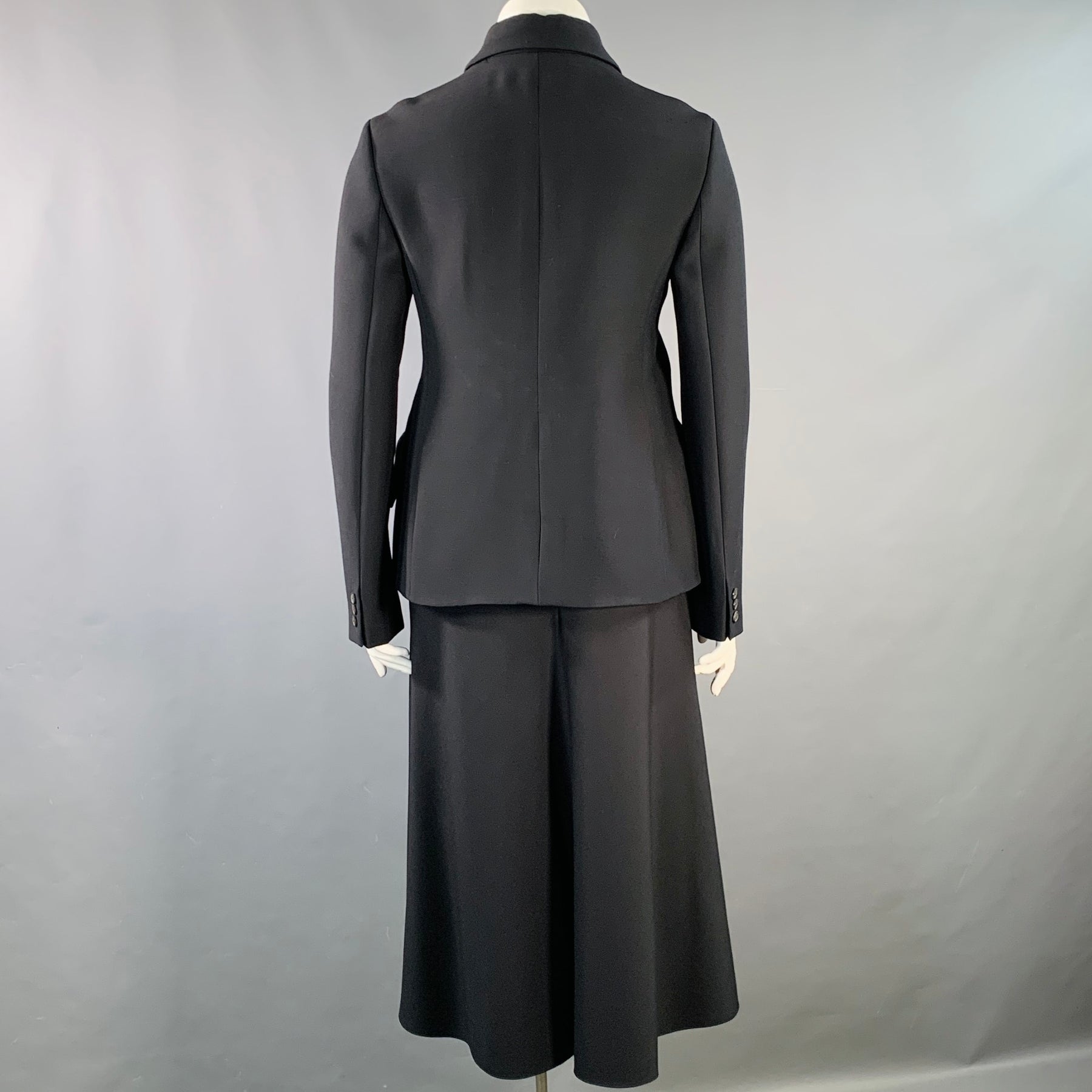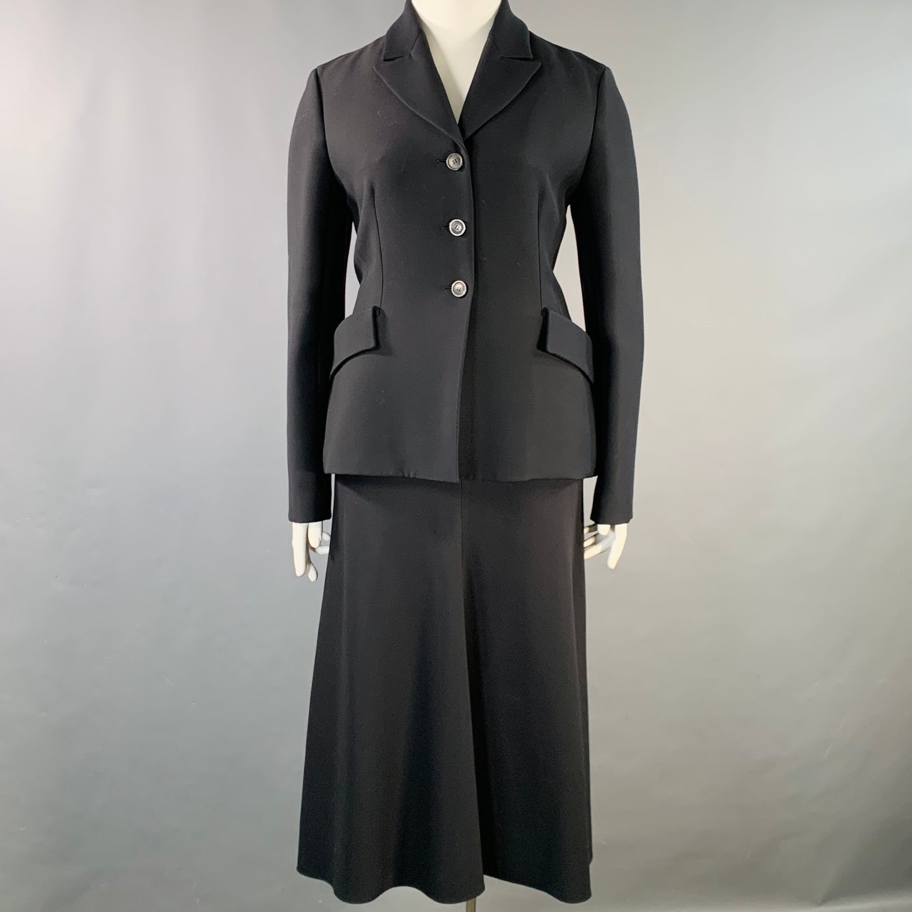 CHRISTIAN DIOR skirt suit in a black wool silk featuring a three button peak lapel blazer with matching midi skirt.