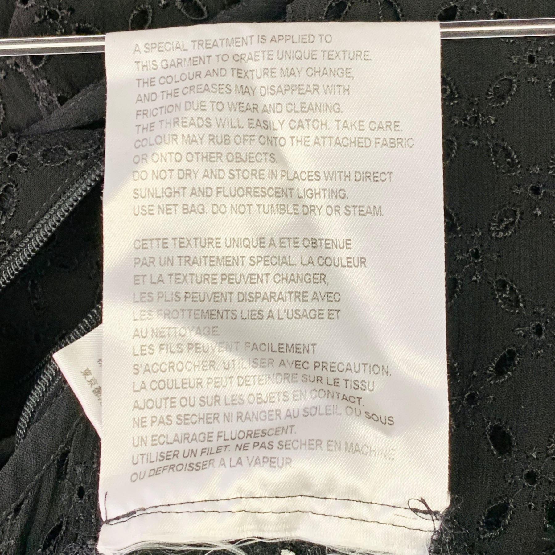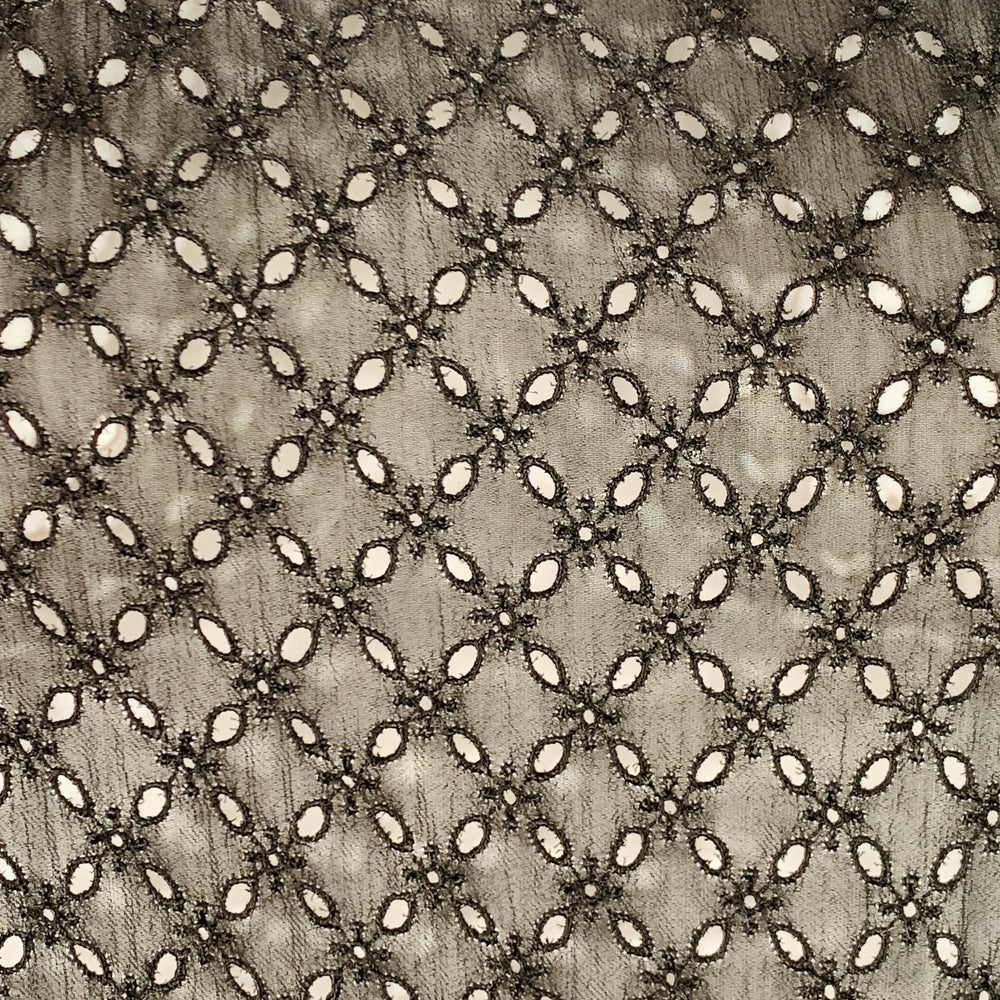 COMME des GARCONS 2012 jumpsuit in a black cupro featuring an unlined style with all over eyelets, extra wide leg, asymmetrical fit with extra low drop crotch, and back zipper closure. Made in Japan.