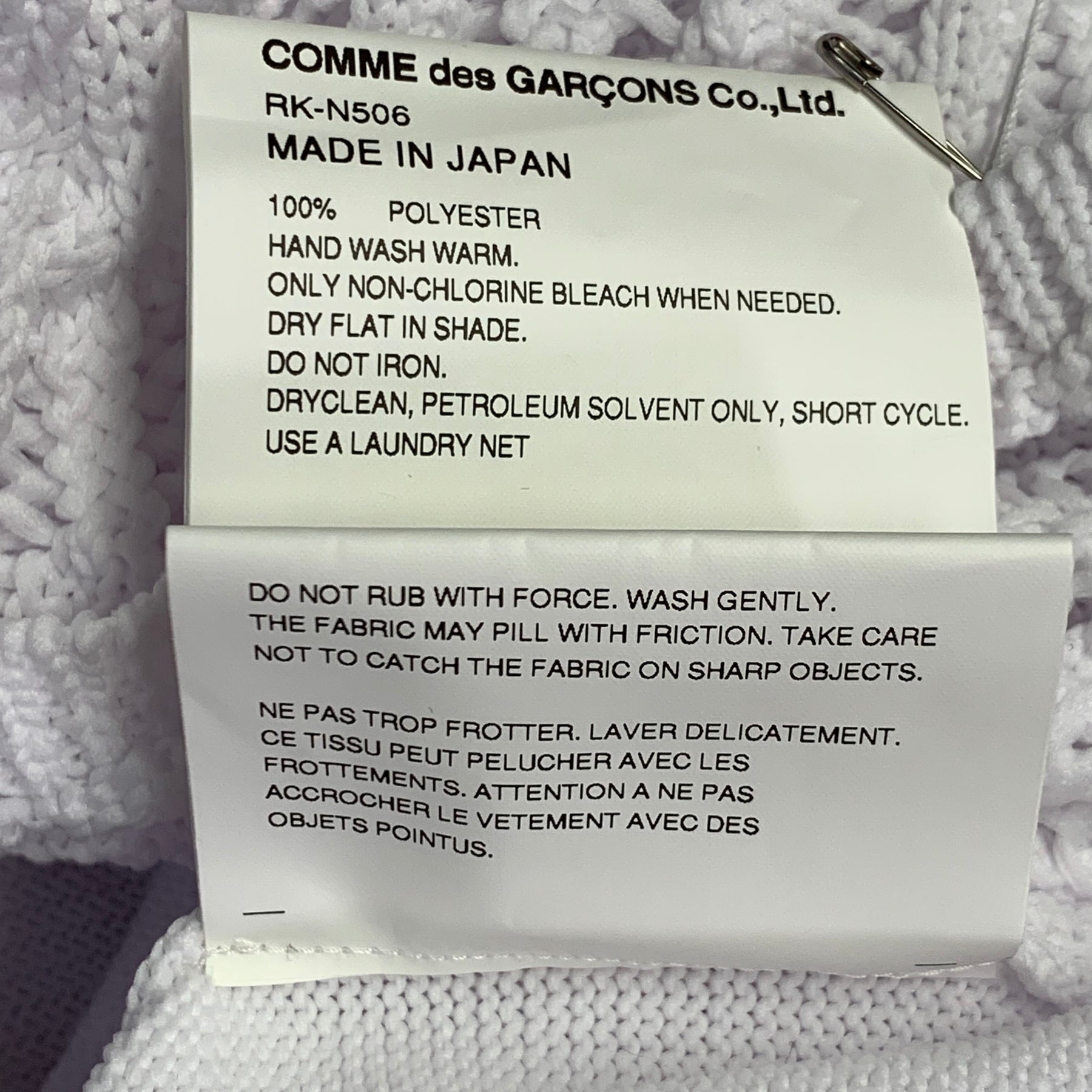 COMME des GARCONS 2022 sweater in a white polyester knit featuring a front cable knit design, long sleeves, and crew neck. Made in Japan.