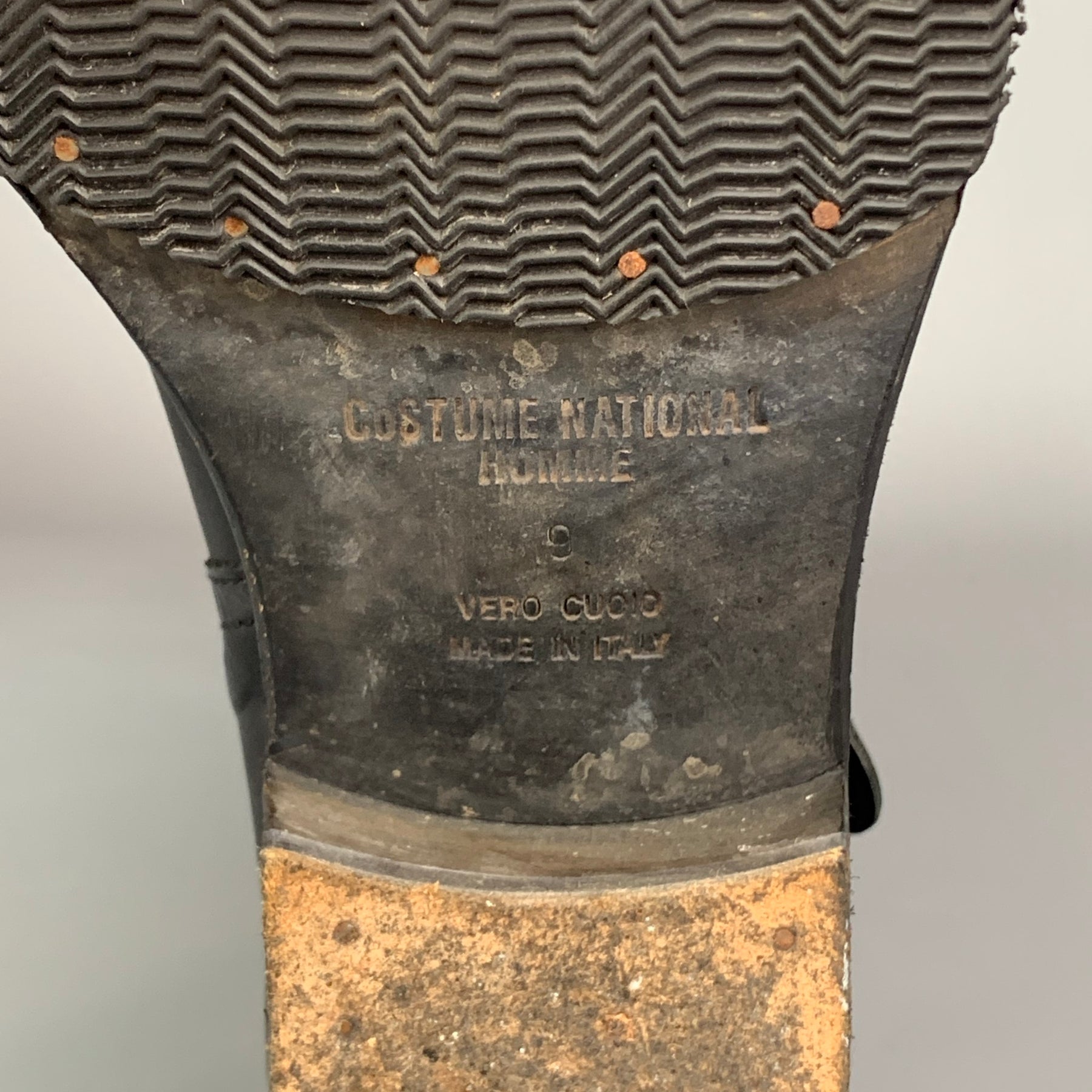 CoSTUME NATIONAL boots comes in a black leather featuring pull on style, belted strap details, and wooden sole with a rubber panel.