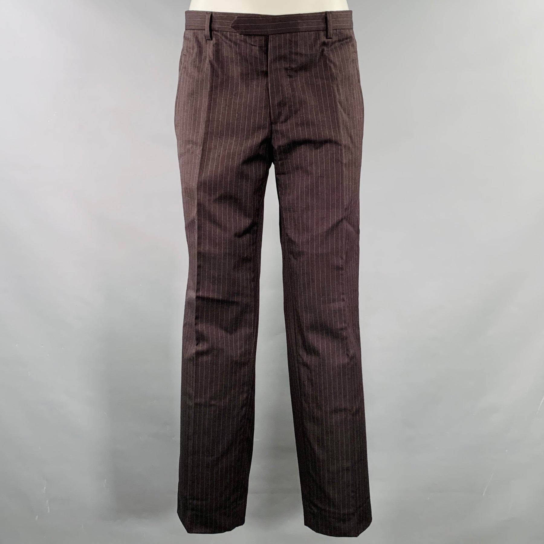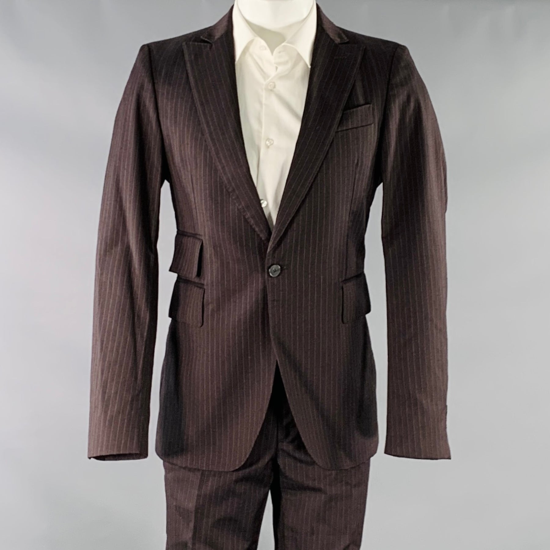 CoSTUME NATIONAL suit in a brown and grey pinstripe wool and includes a single breasted, single button sport coat with a peak lapel and matching flat front trousers.