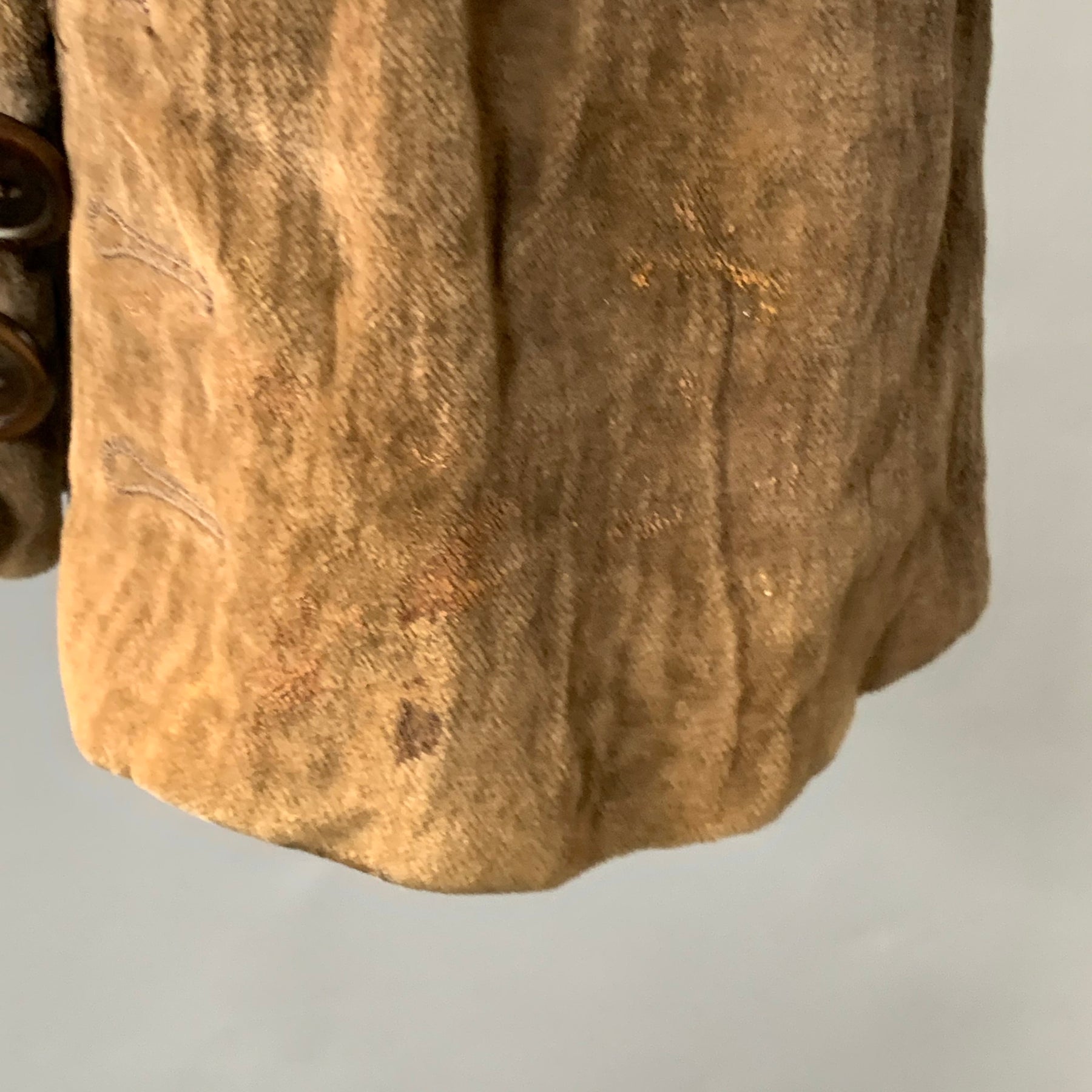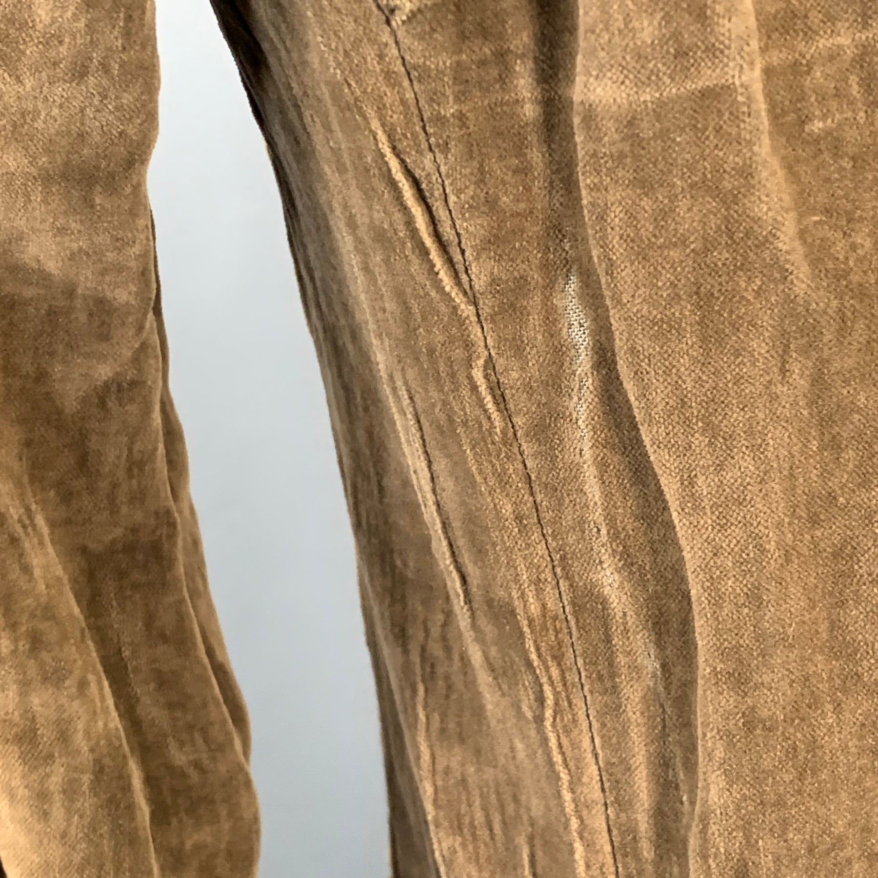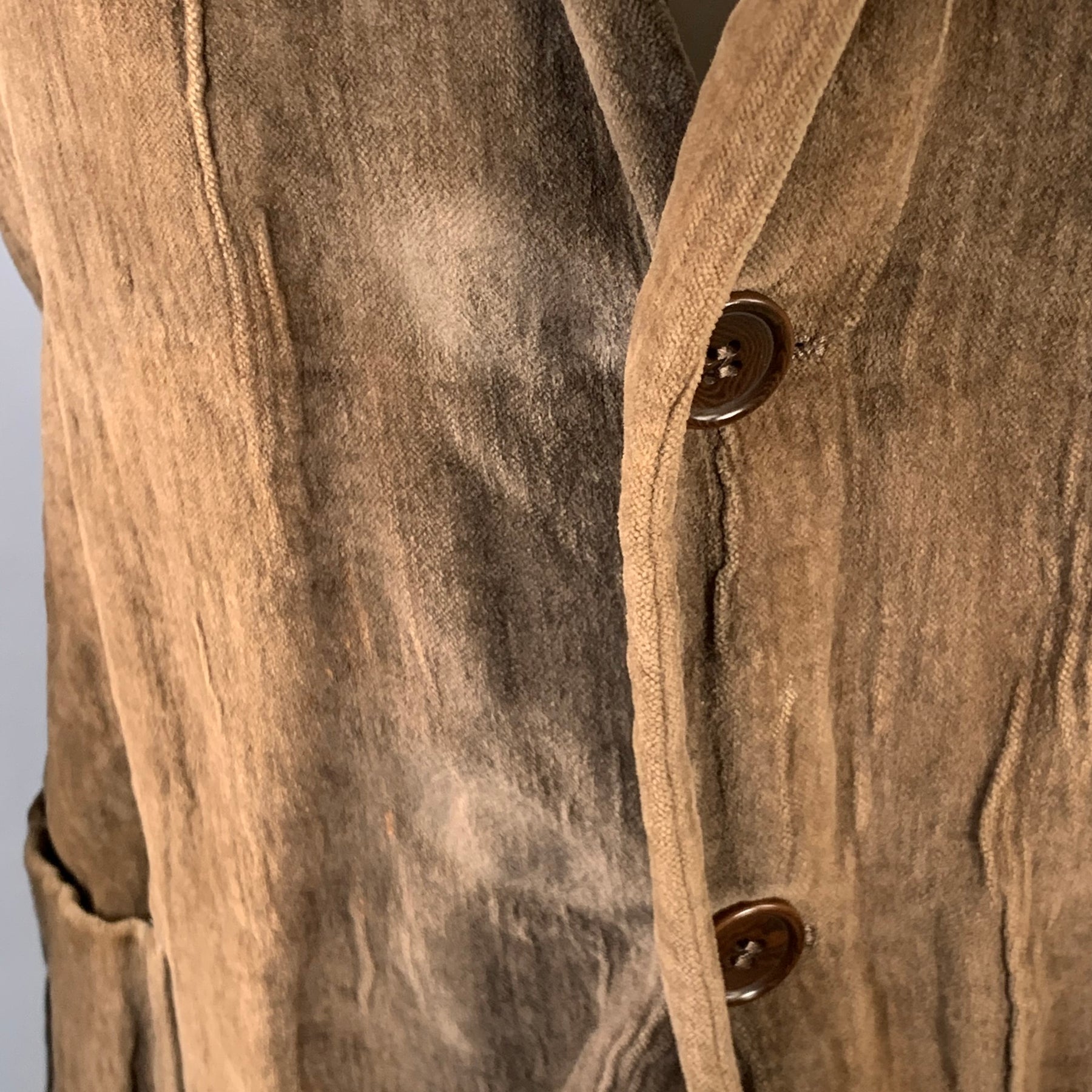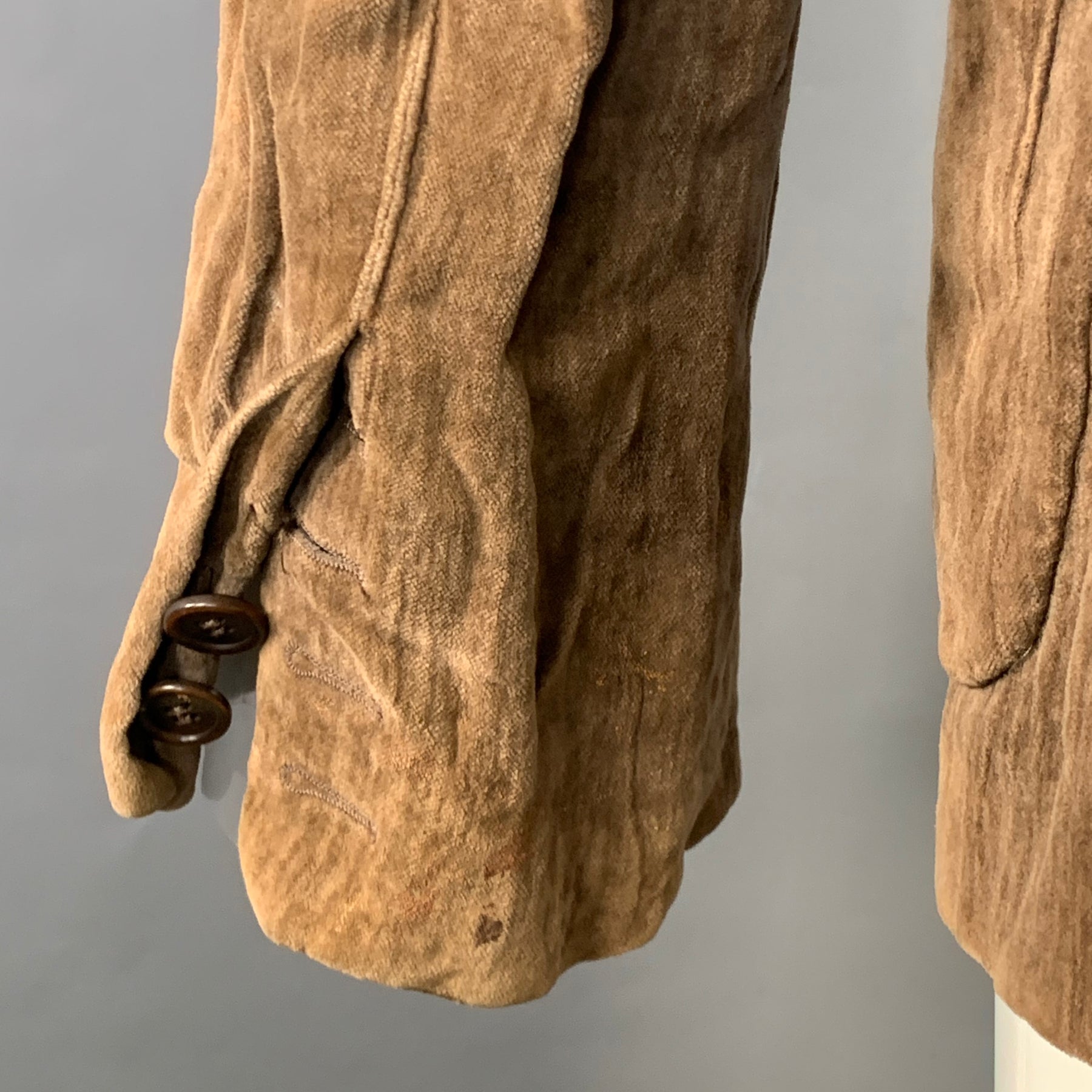 CoSTUME NATIONAL jacket in a brown cotton metal blend velvet featuring a wrinkled textured design, notch lapel, and button closure. Made in Italy.
