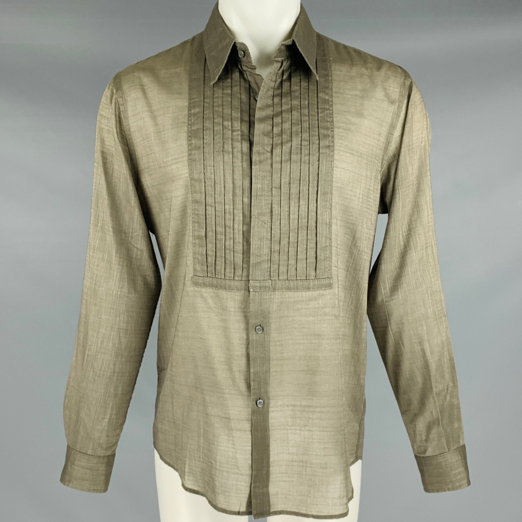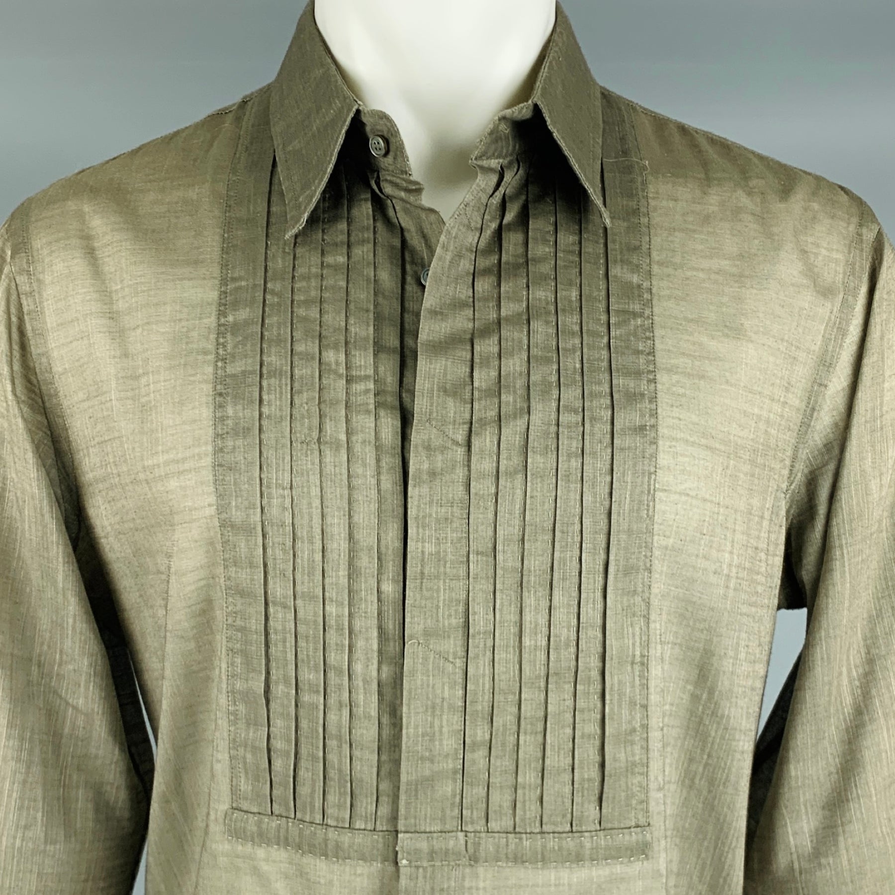 CoSTUME NATIONAL long sleeve tuxedo shirt in a taupe cotton blend fabric featuring pleated accordion front, cutaway collar, and hidden button closure. Made in Italy.