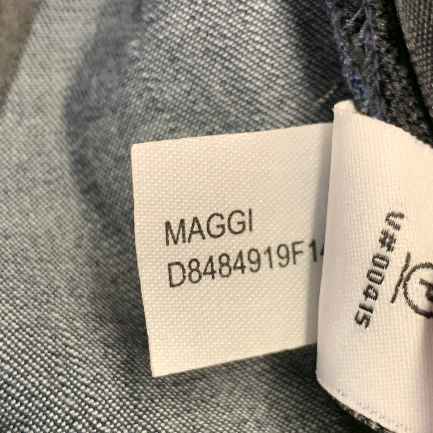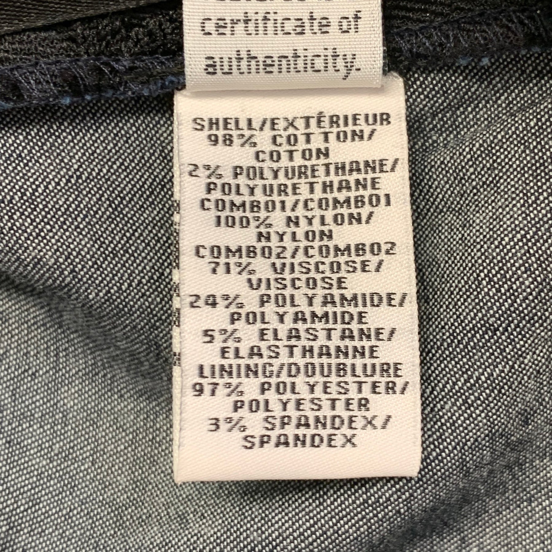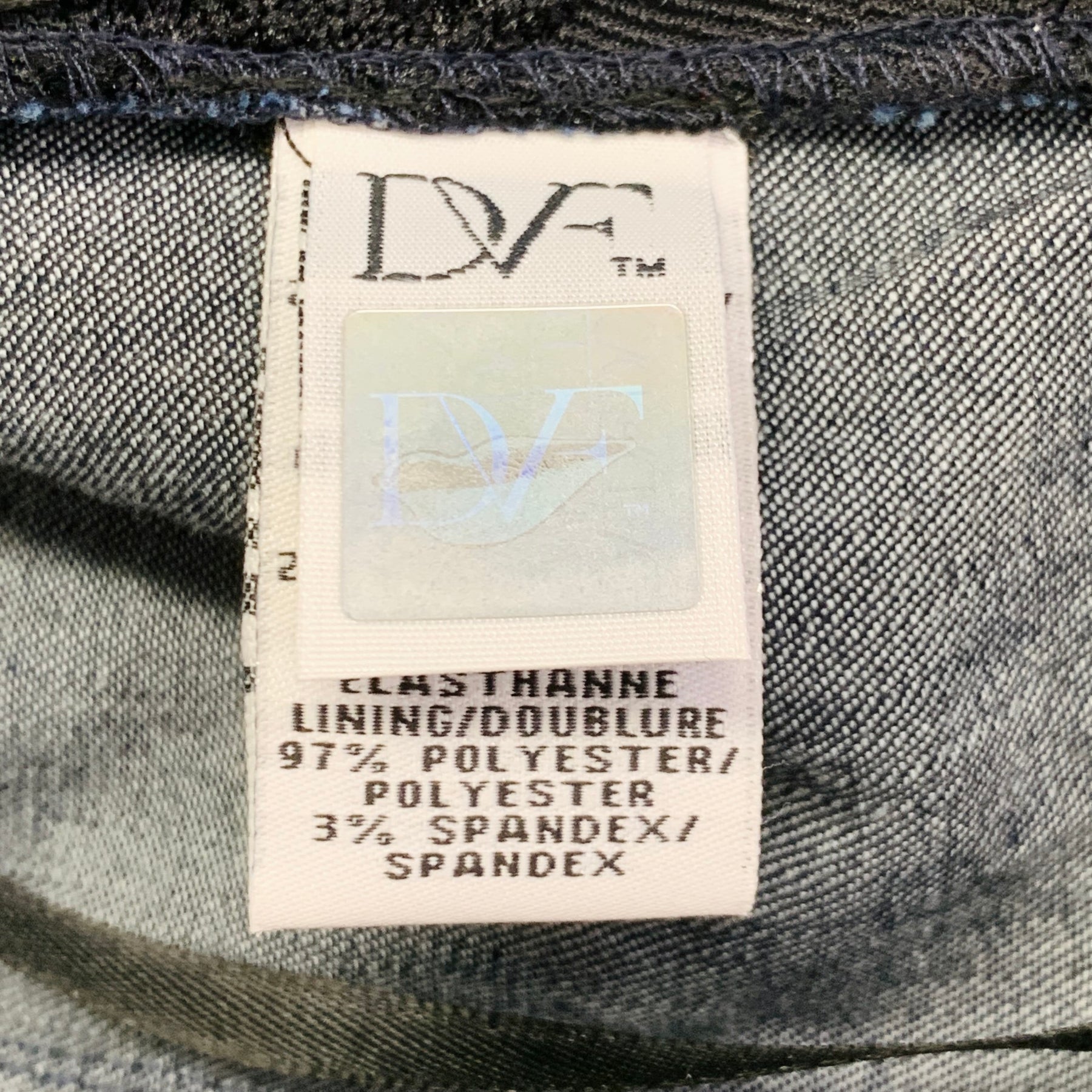DIANE VON FURSTENBERG "Maggi" shirt dress in a black and navy cotton blend fabric featuring black lace and navy denim panels, two faux pockets with silver tone metal buttons, and self tie closure.