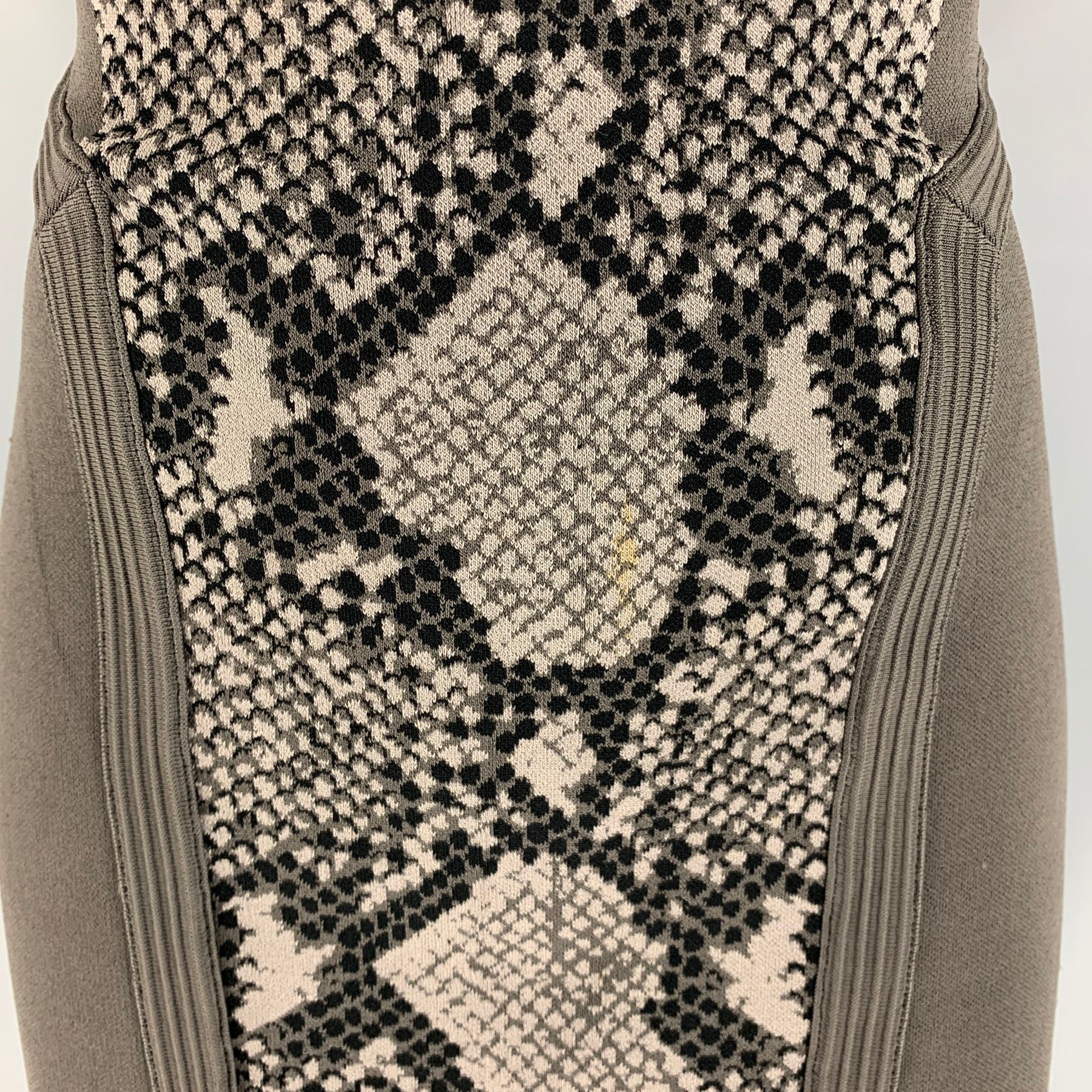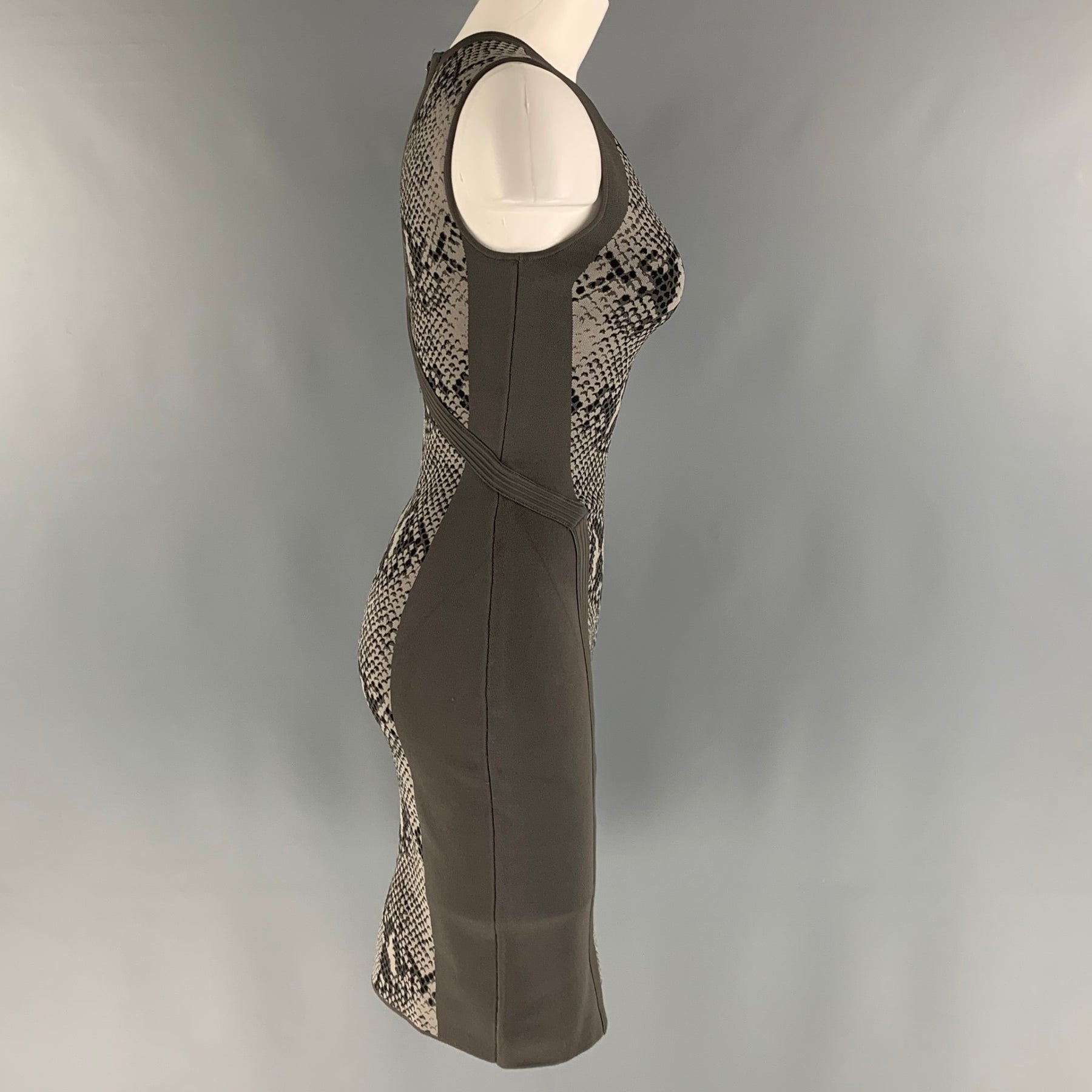 DIANE VON FURSTENBERG bodycon dress comes in a grey and taupe rayon blend knit material featuring snake skin print, sleeveless style, and a half length zip up closure at center back.