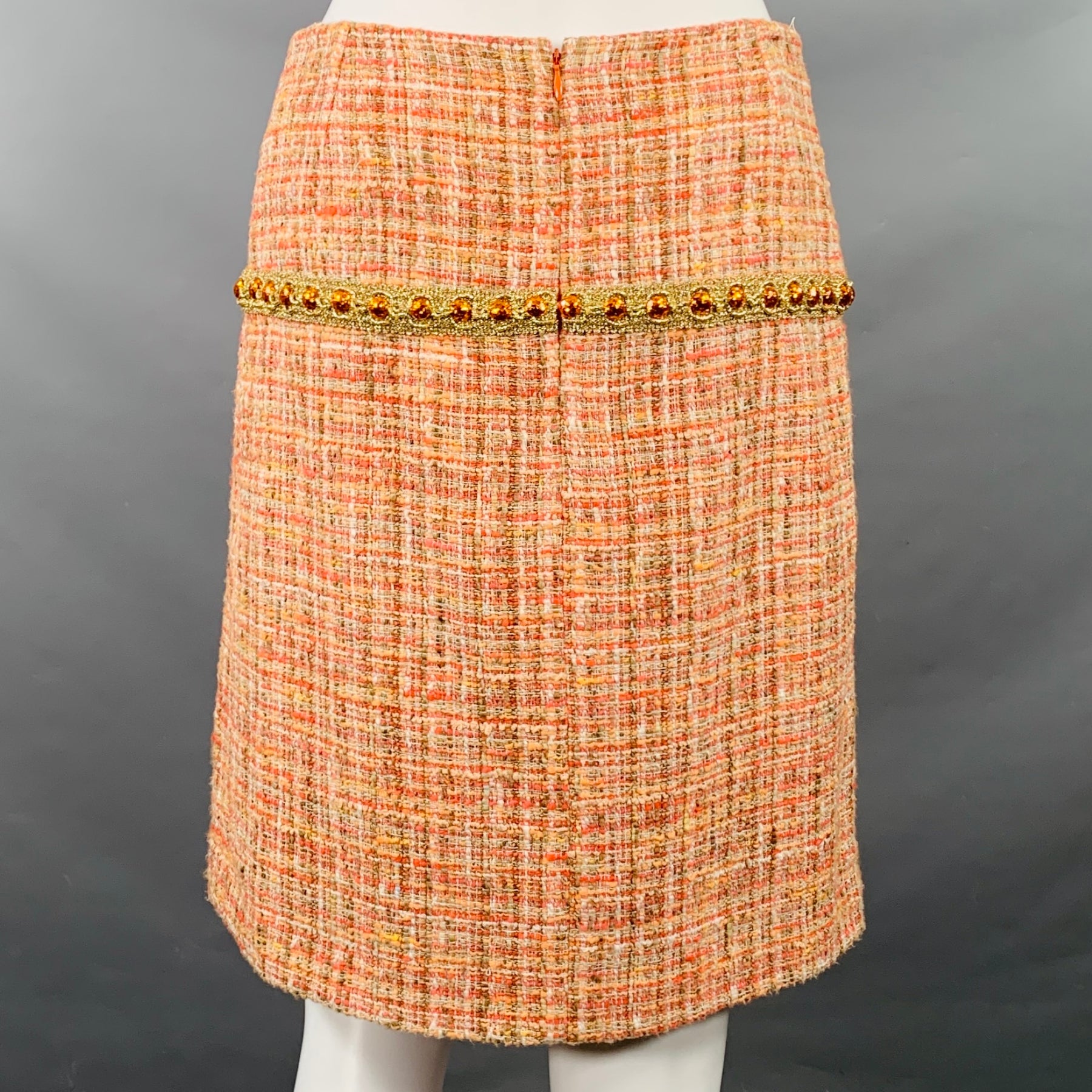DOLCE & GABBANA skirt suit set in an orange and gold tone cotton blend tweed and includes a three button closure jacket with a matching bead embellished skirt. Made in Italy.