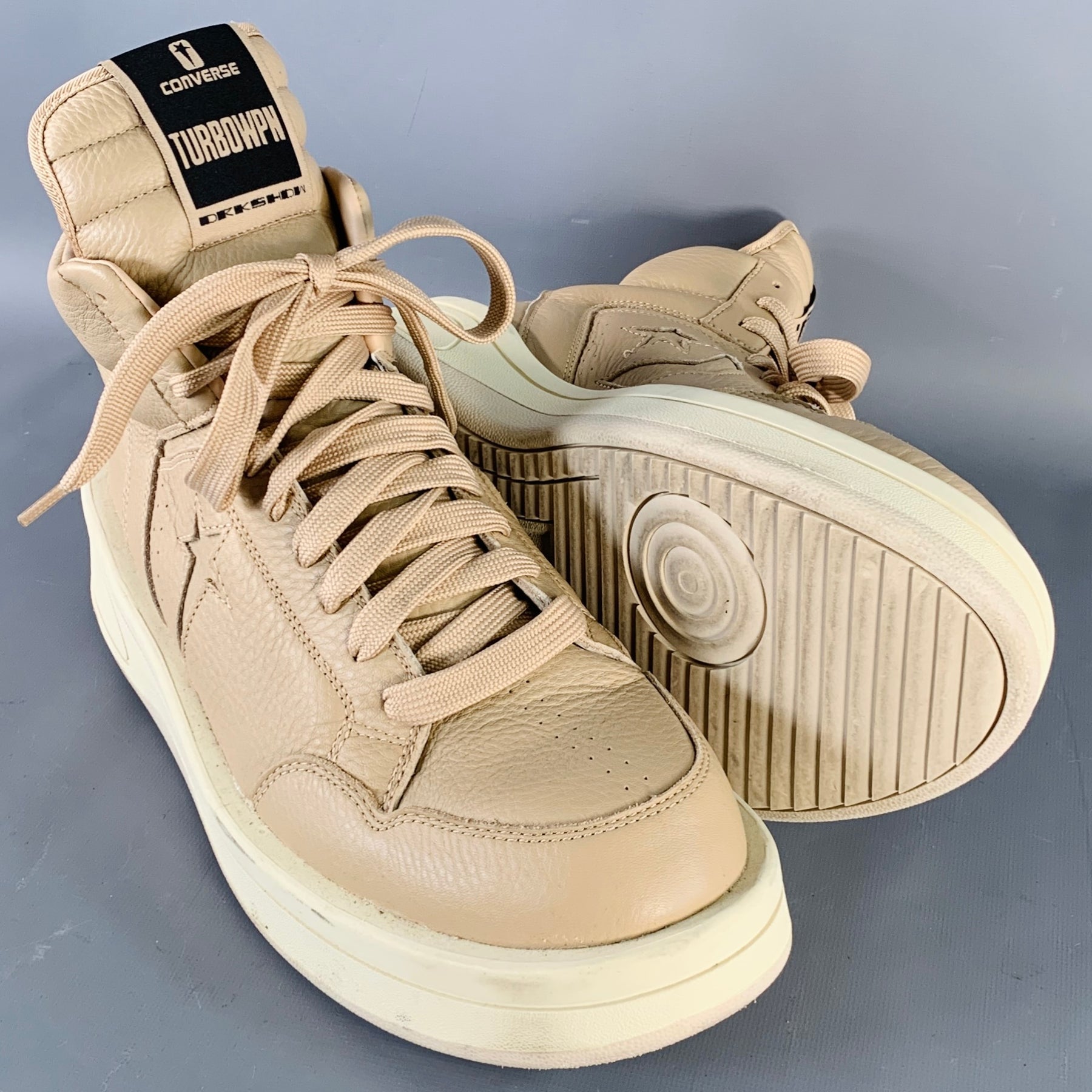CONVERSE x RICK OWENS DRKSHDW "TURBOWPN" sneakers in a beige leather with cream sole featuring a high top style, rubber sole, and lace-up closure.