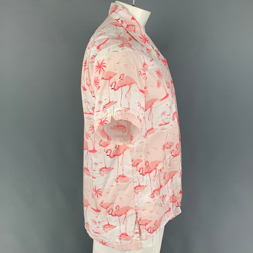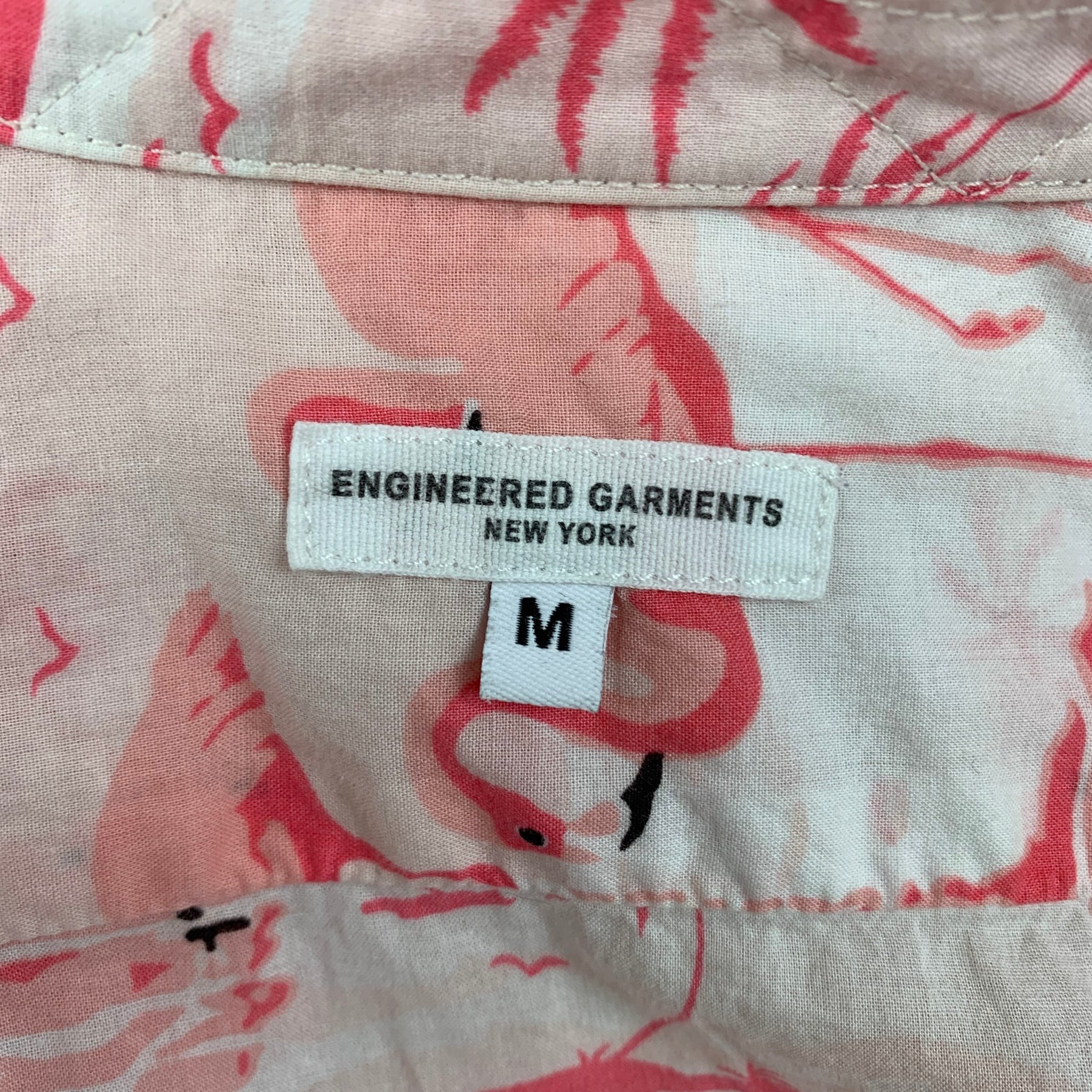 ENGINEERED GARMENT short sleeve shirt comes in a white & pink cotton with a all over flamingo print featuring a spread collar, patch pocket, and a button up closure. Made in USA.