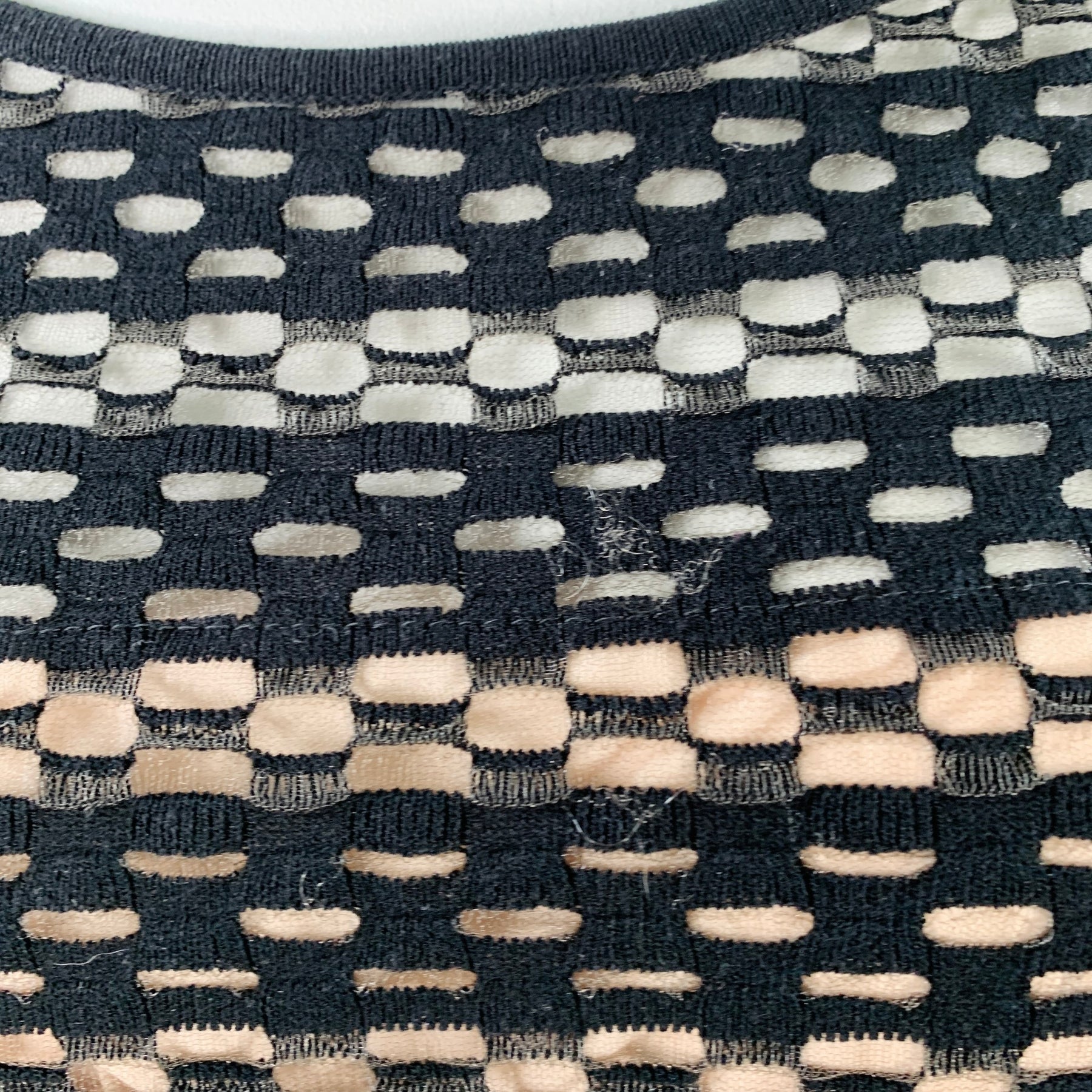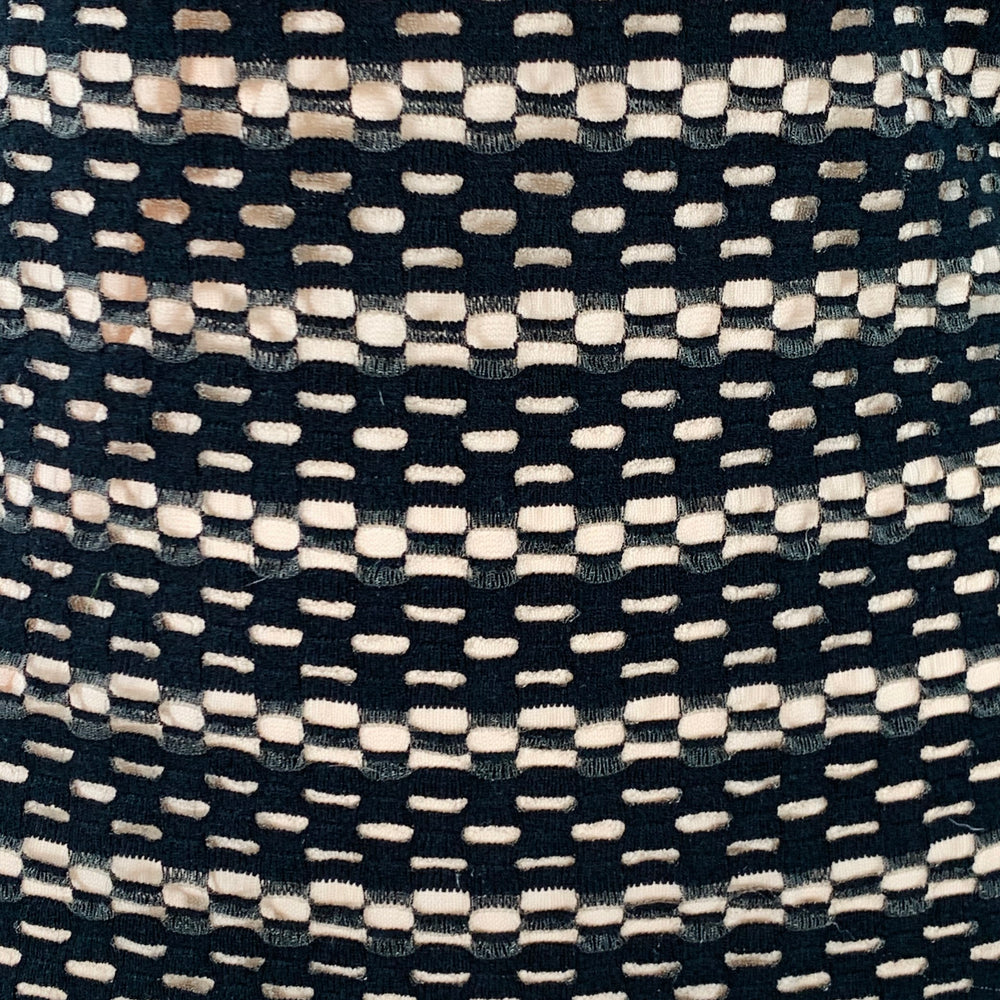 ESCADA casual top in a black viscose blend with nude lining featuring a textured stripe cutout design, 3/4 sleeves, and scoop neck.