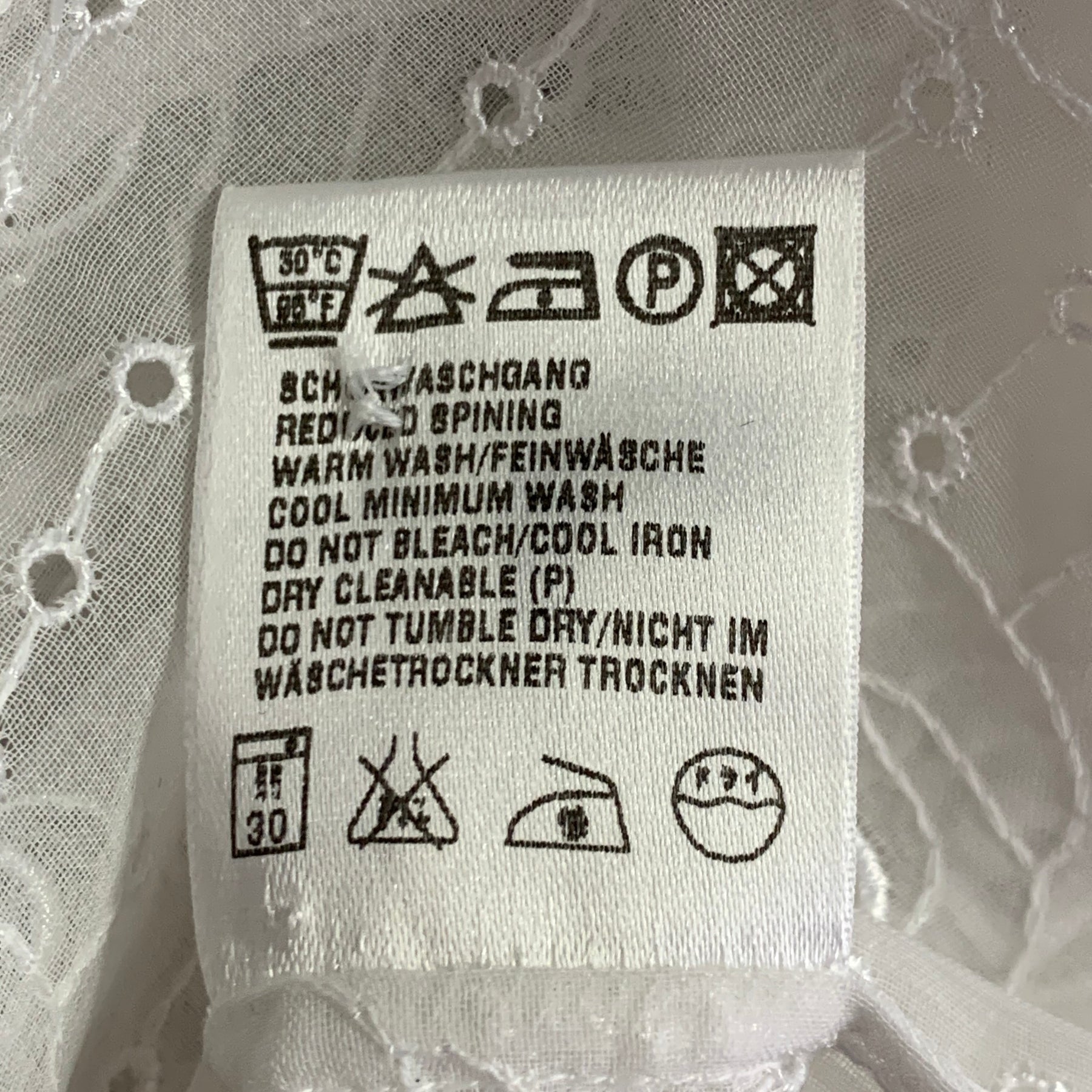 ESCADA shirt in a cream polyester fabric featuring an embroidered roses design with micro eyelet details, and button closure. Made in Germany.