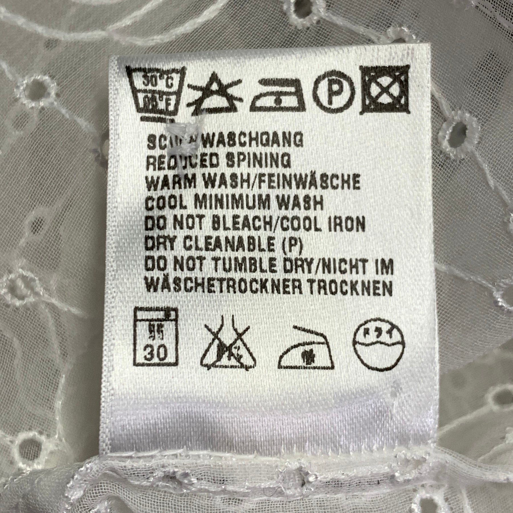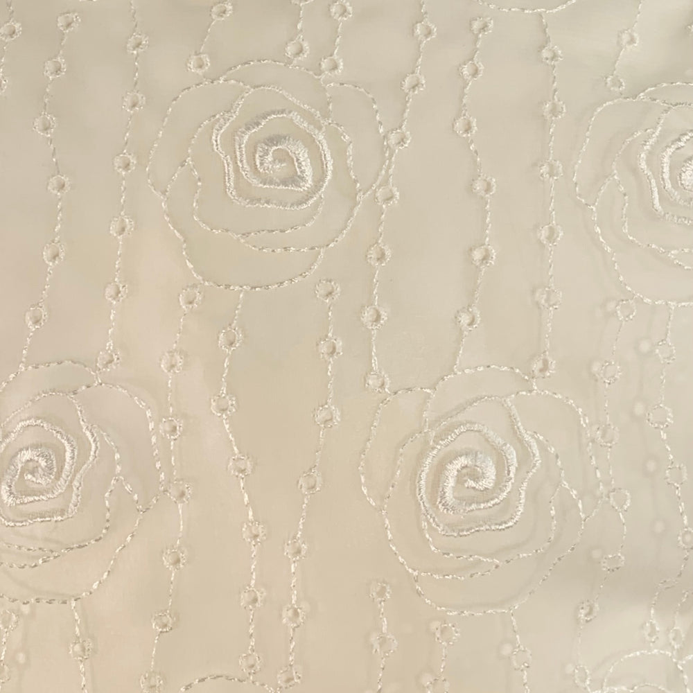 ESCADA shirt in a cream polyester fabric featuring an embroidered roses design with micro eyelet details, and button closure. Made in Germany.