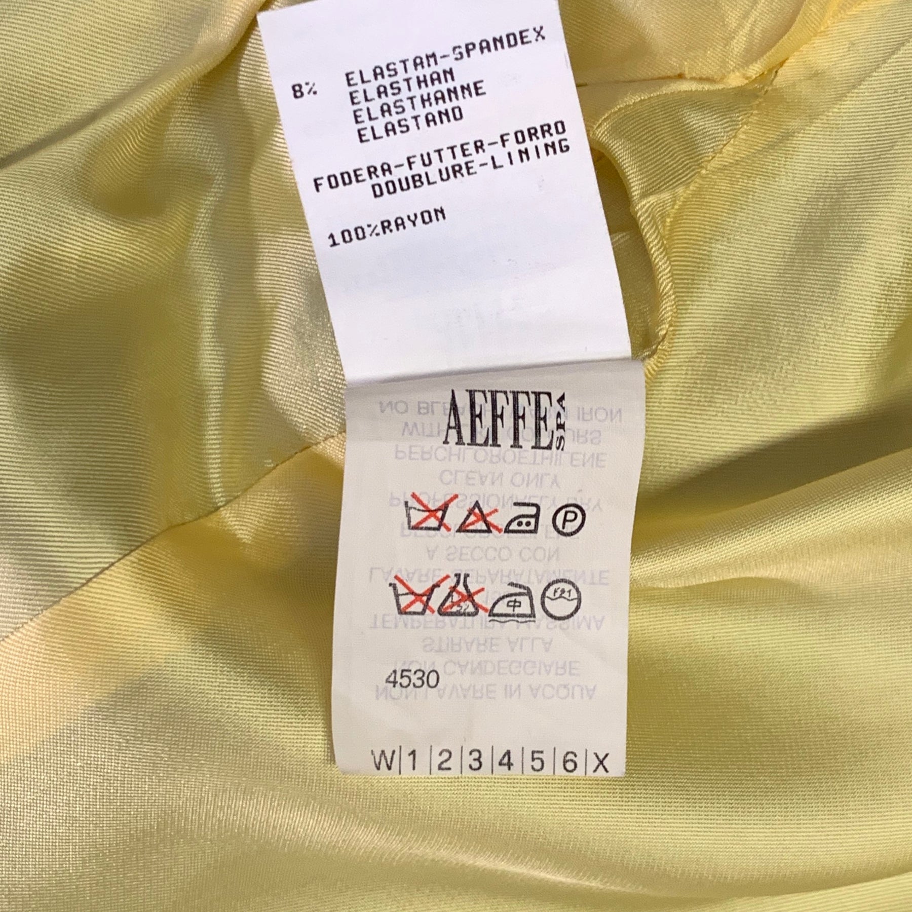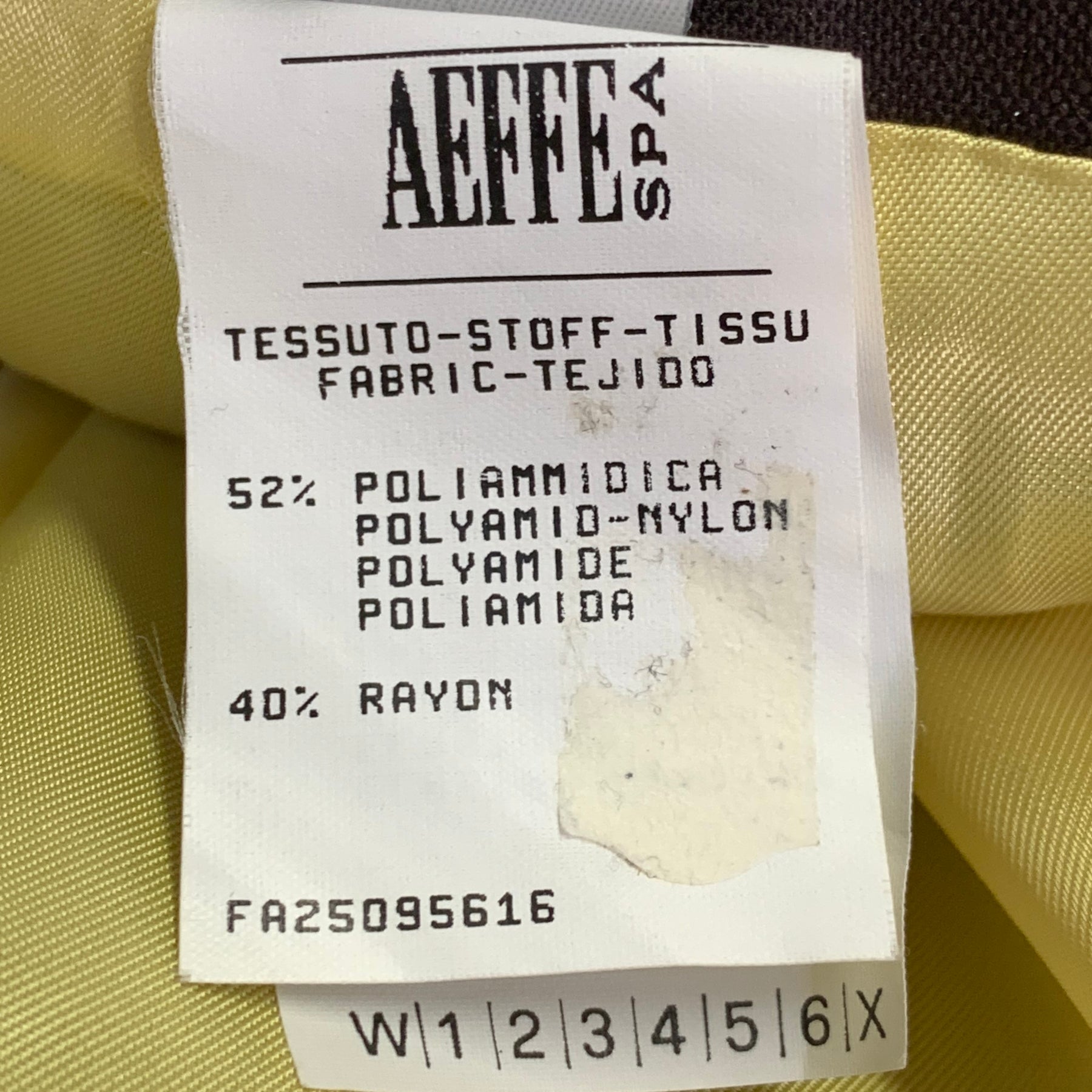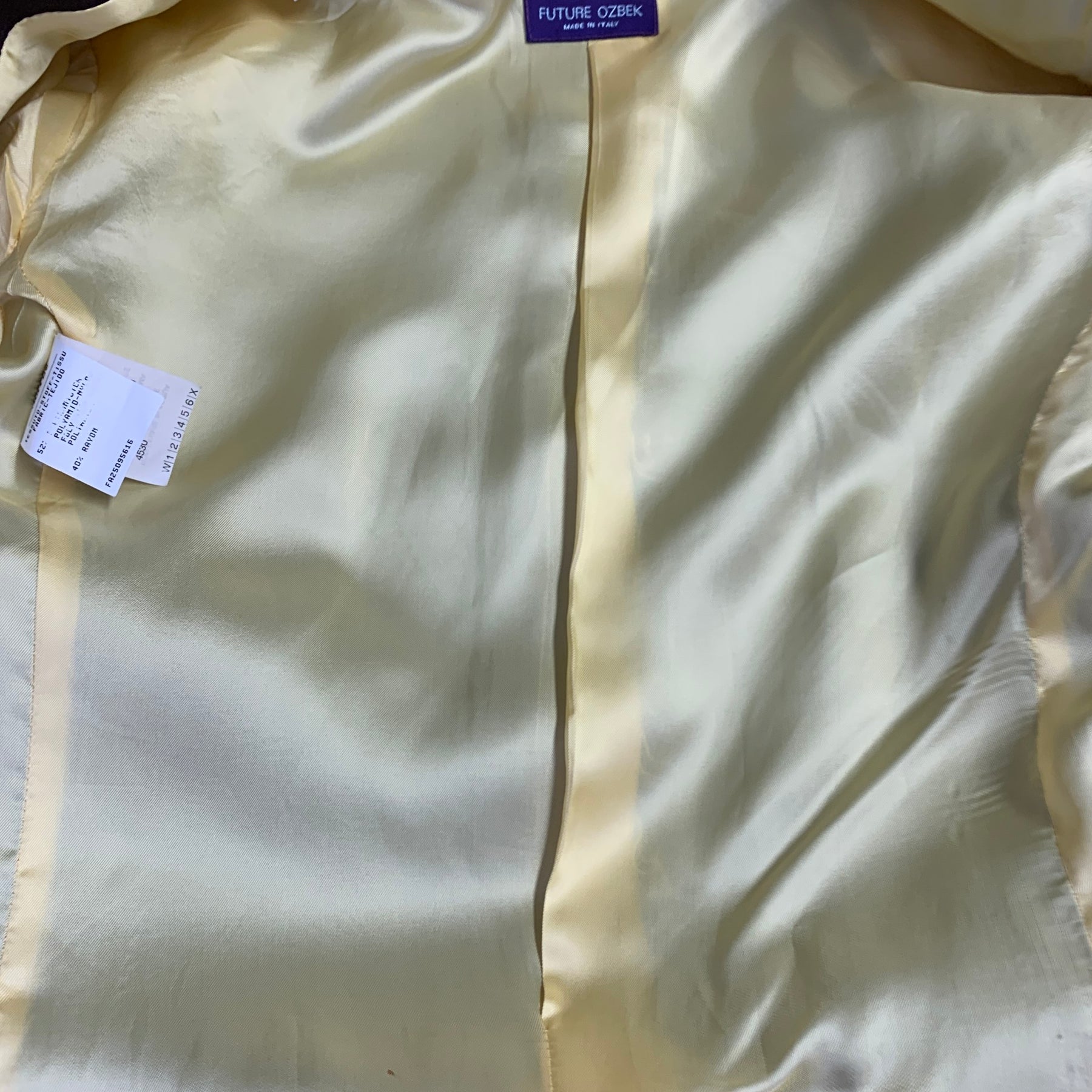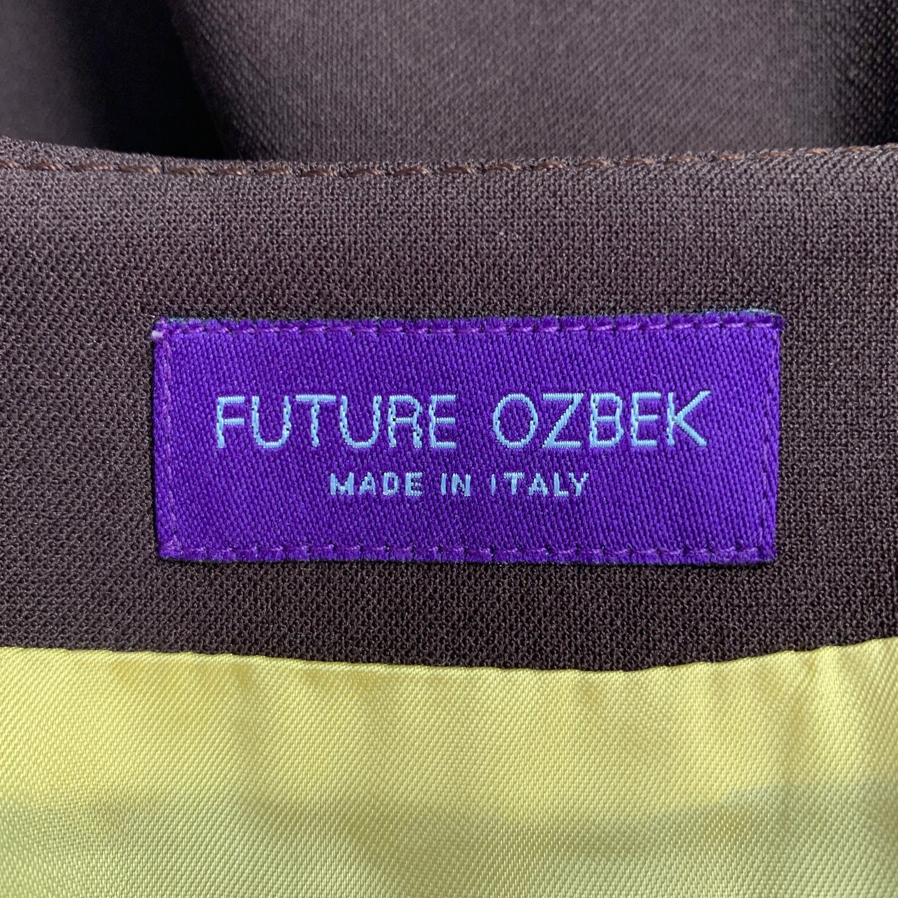 FUTURE OZBEK set in a brown rayon blend fabric and includes a single breasted double button jacket and matching mini skirt with side zipper closure. Made in Italy.