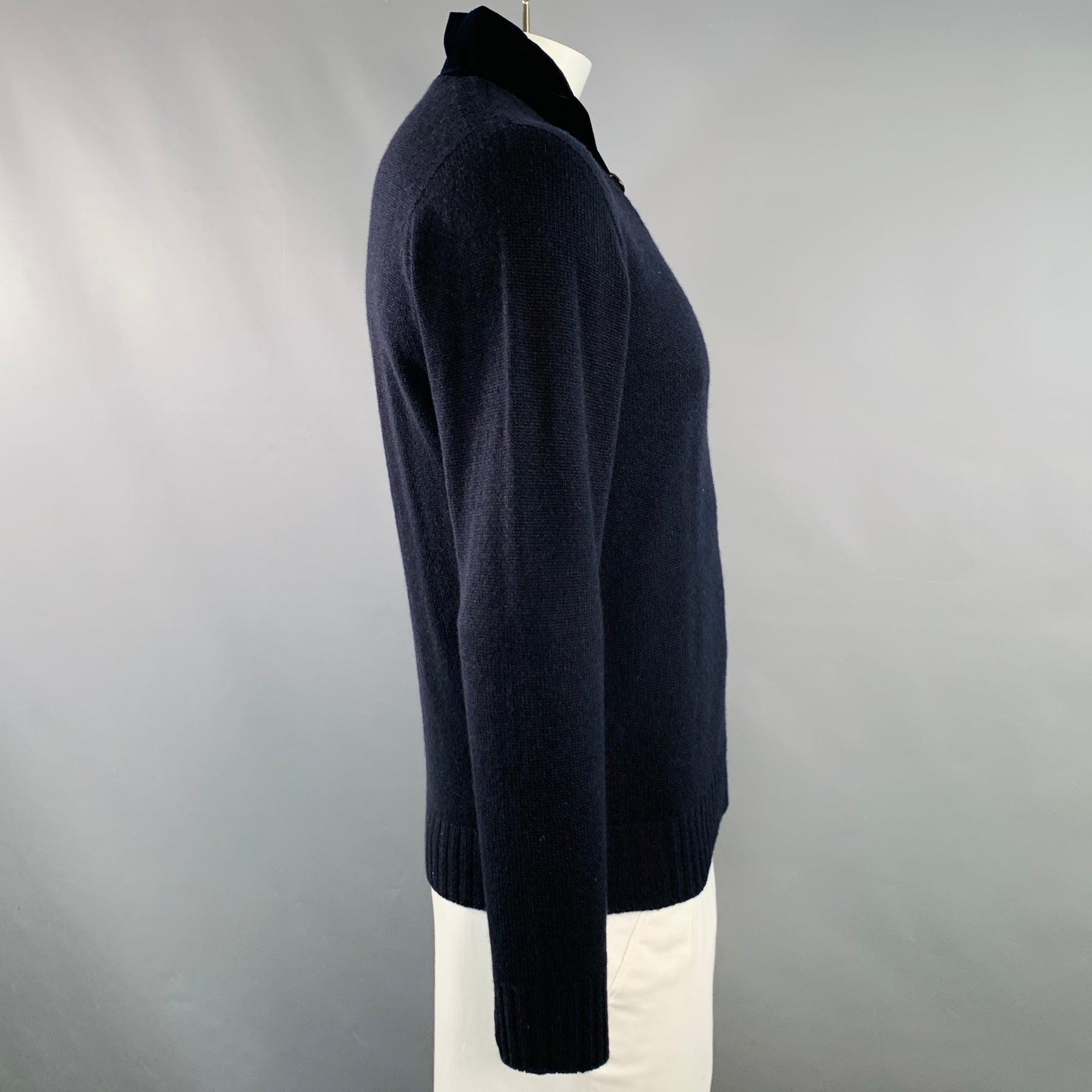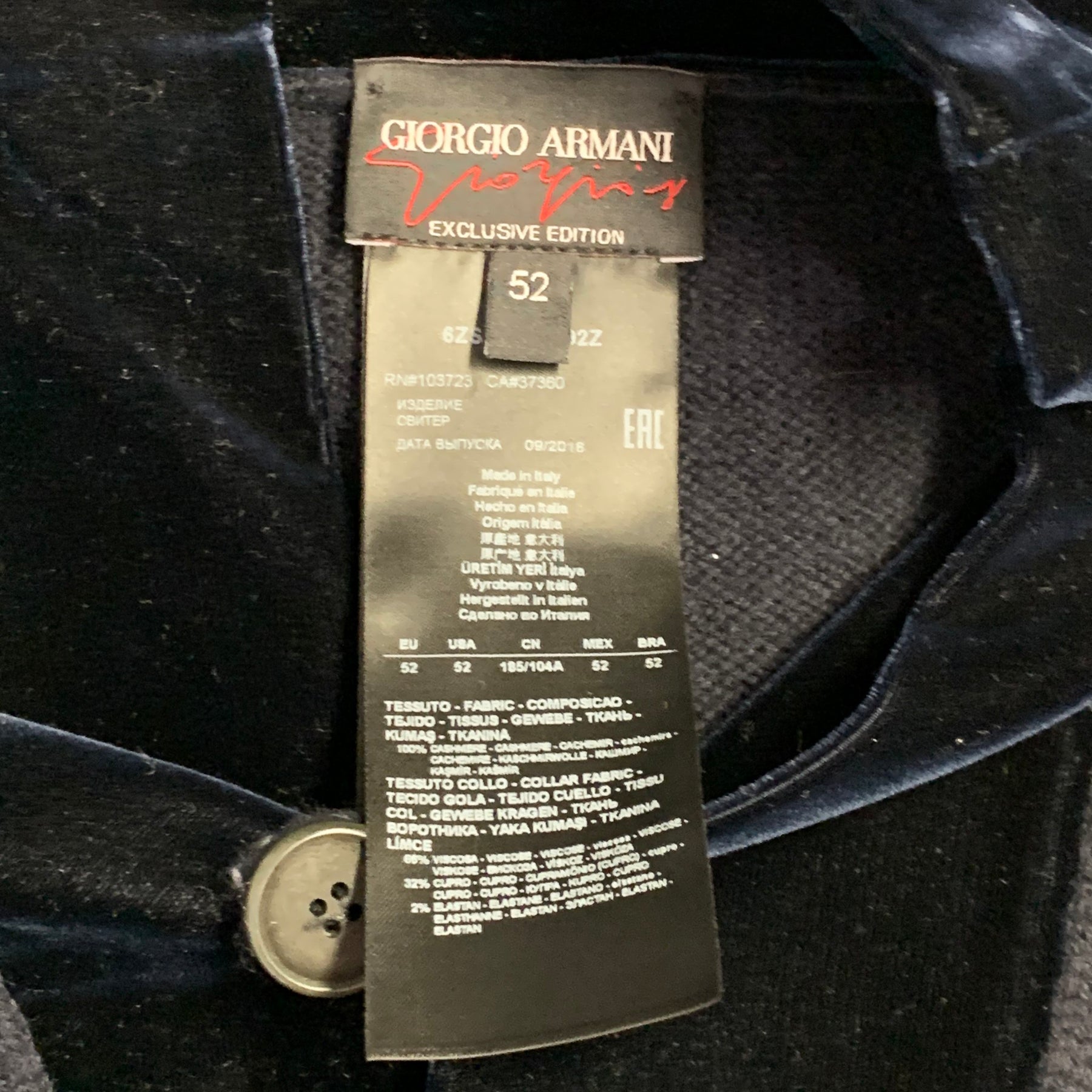 GIORGIO ARMANI Exclusive Edition sweater in a navy cashmere knit with black velvet collar with button, long sleeves, and V-neck.