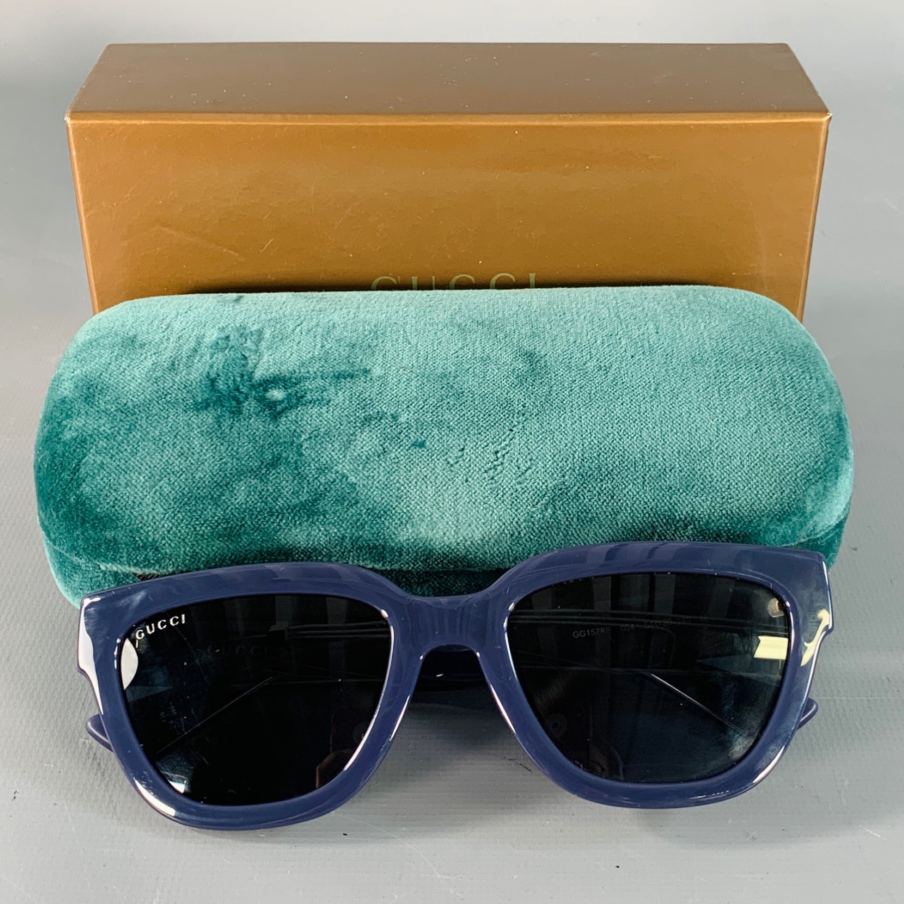 GUCCI sunglasses in a blue acetate featuring a square shape, full-rimmed style, and tinted lenses. Comes with velvet case with box. Made in Italy.