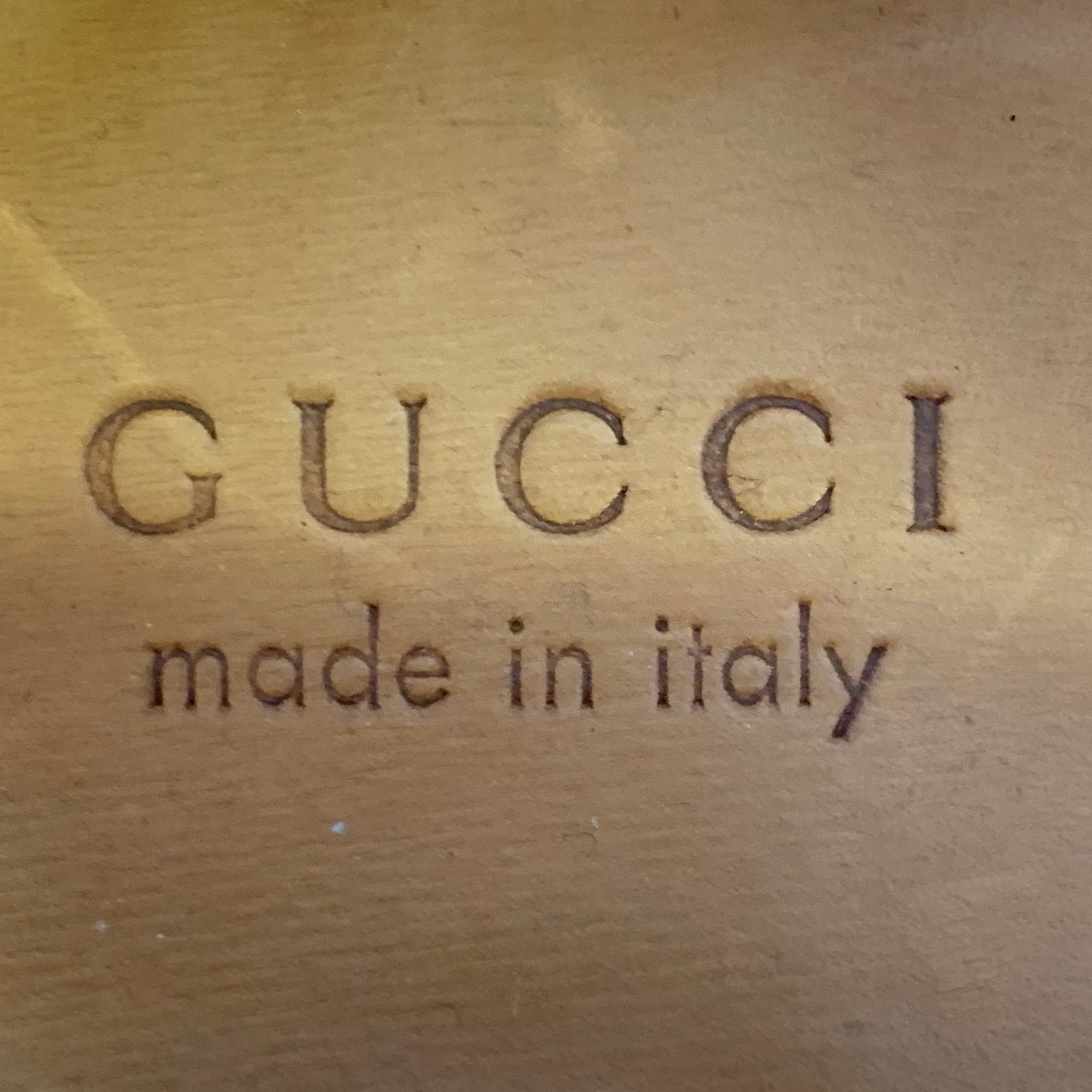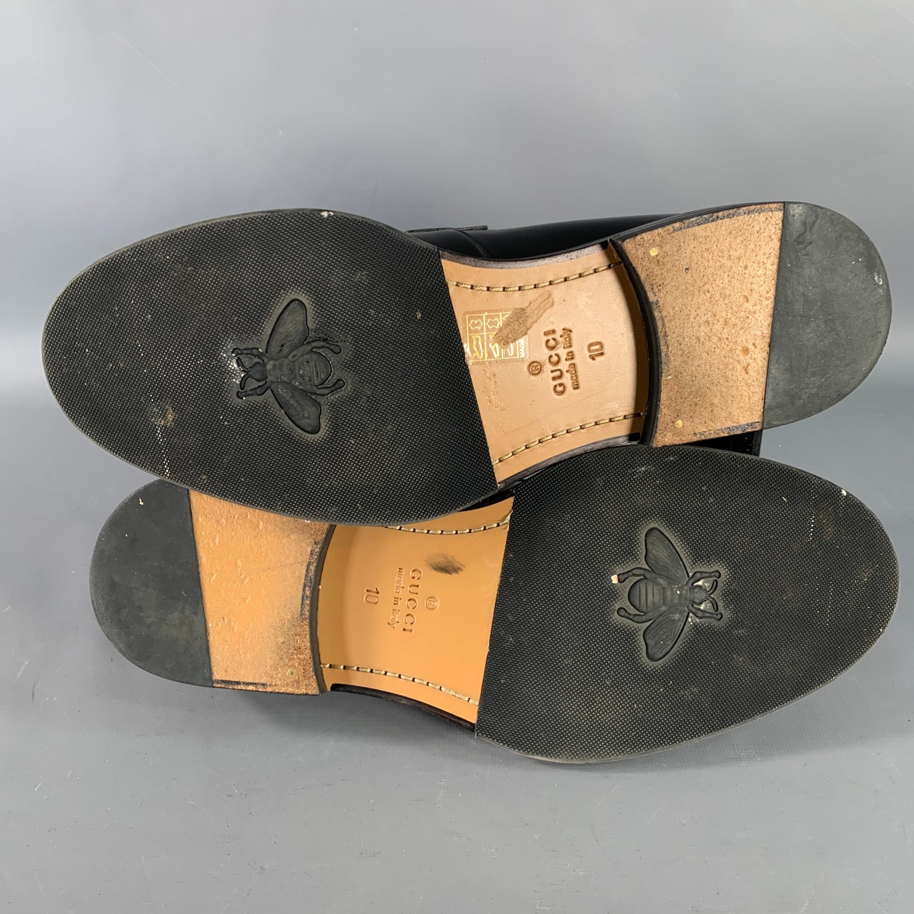GUCCI loafers in a black leather with red, white, and blue ribbon trim featuring a penny style, rubberized sole with signature bee detail, and slip on closure.