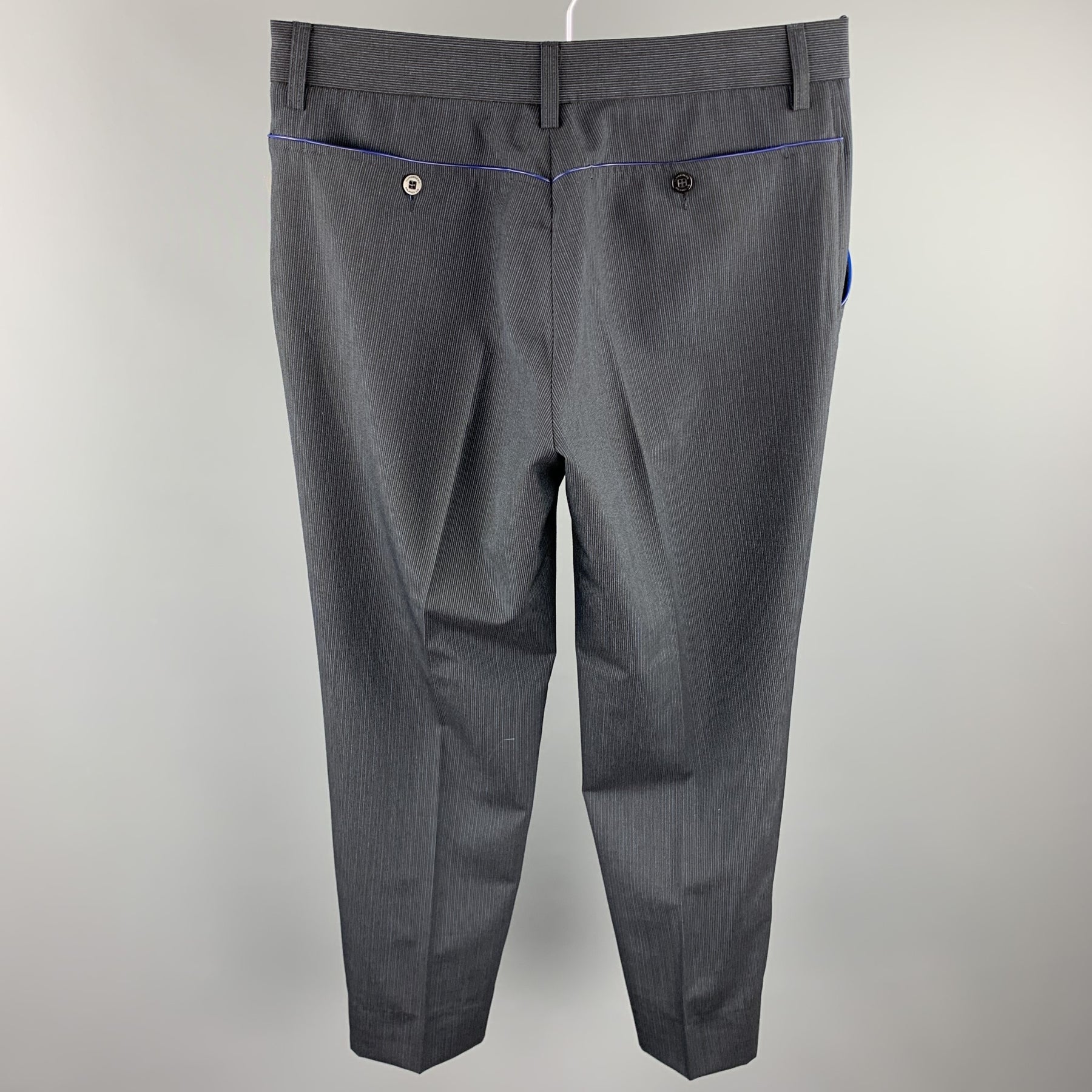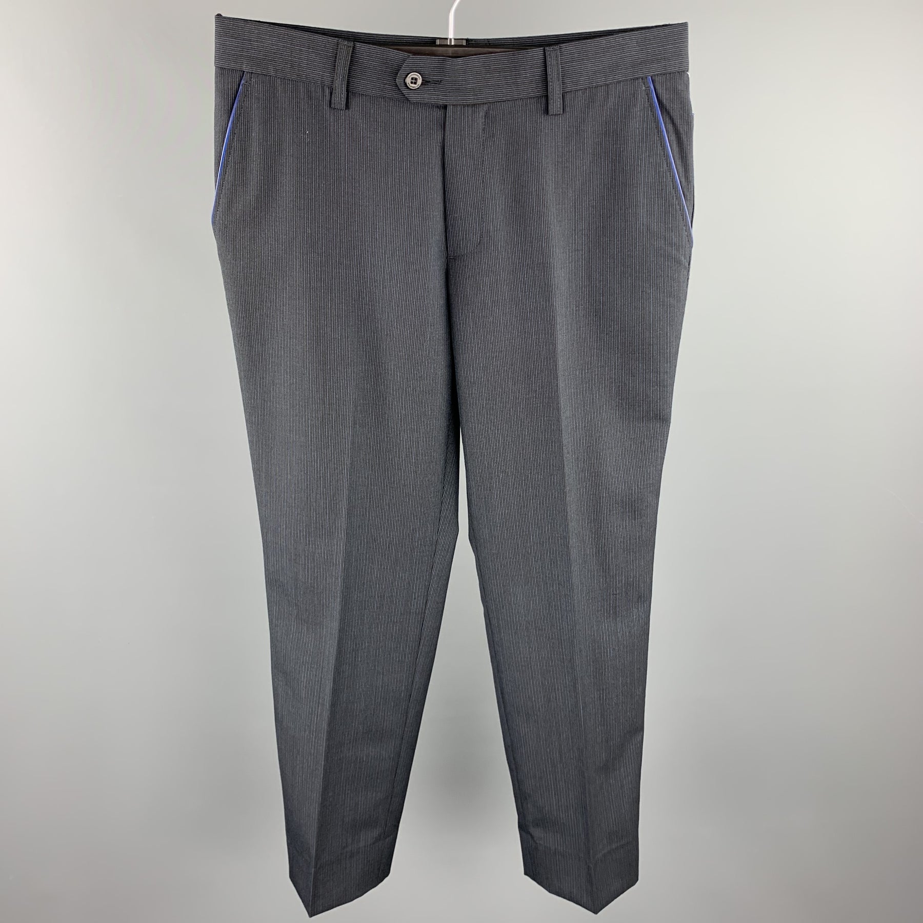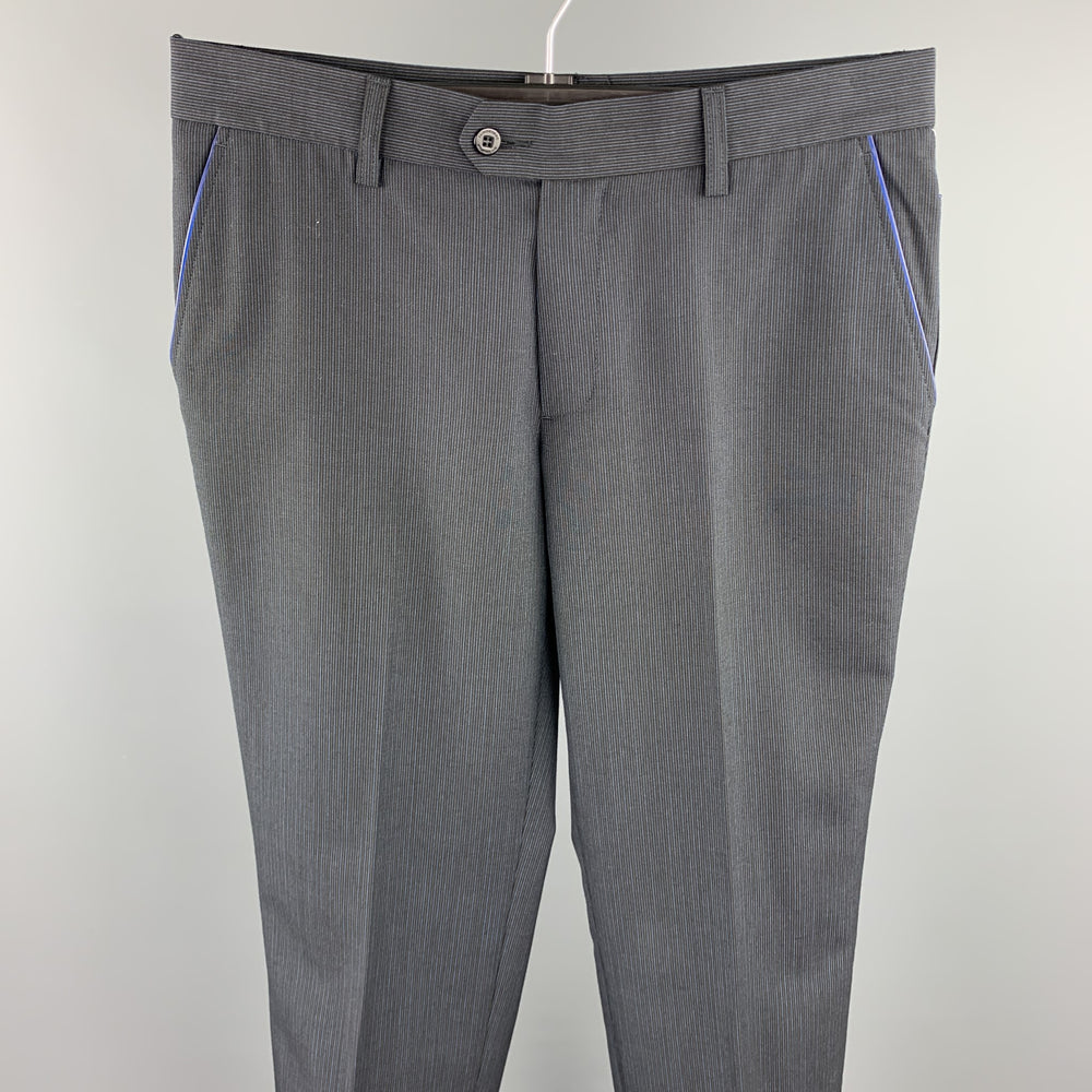 J. LINDEBERG dress pants comes in a black pinstripe wool blend with a bule trim featuring a flat front and a zip fly closure.