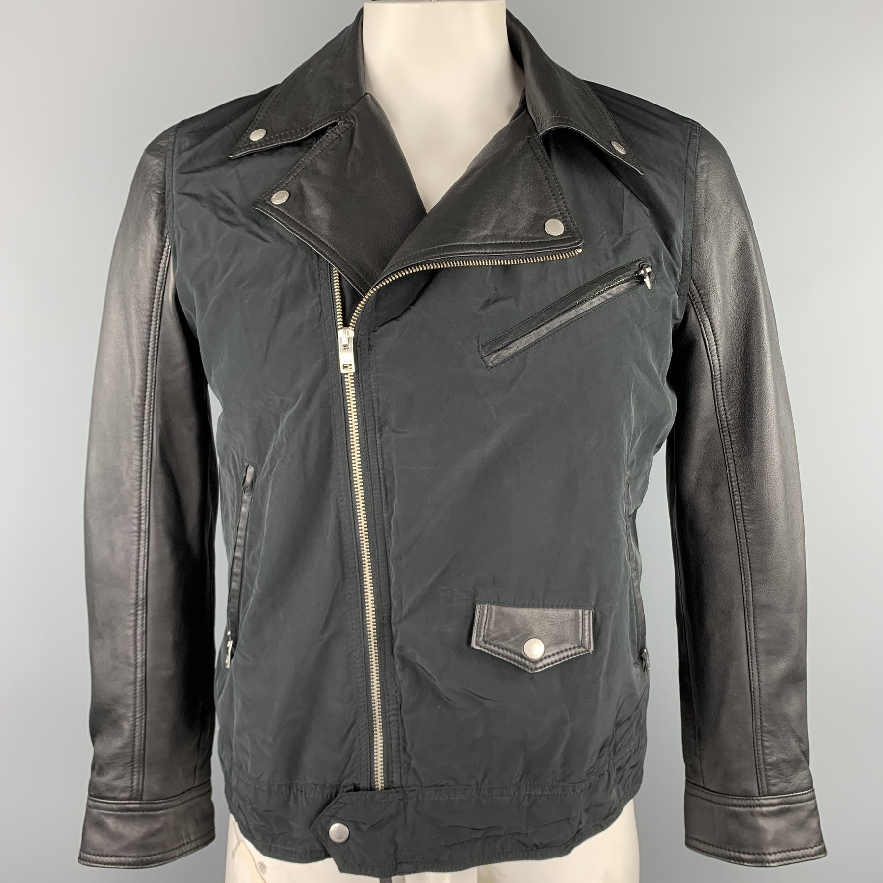 J. LINDEBERG jacket comes in a black mixed materials featuring a biker style, zipper sleeves, zipper pockets, and a zip up closure.