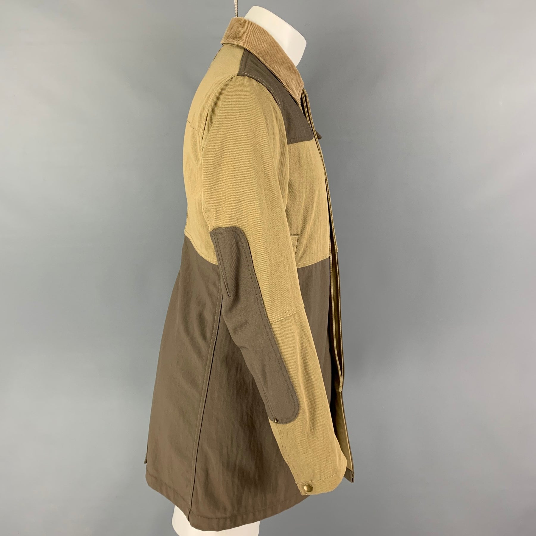 J. LINDEBERG coat comes in a khaki & brown color block nylon with a mesh liner featuring a corduroy collar, flap pockets, single back vent, and a hidden placket closure.